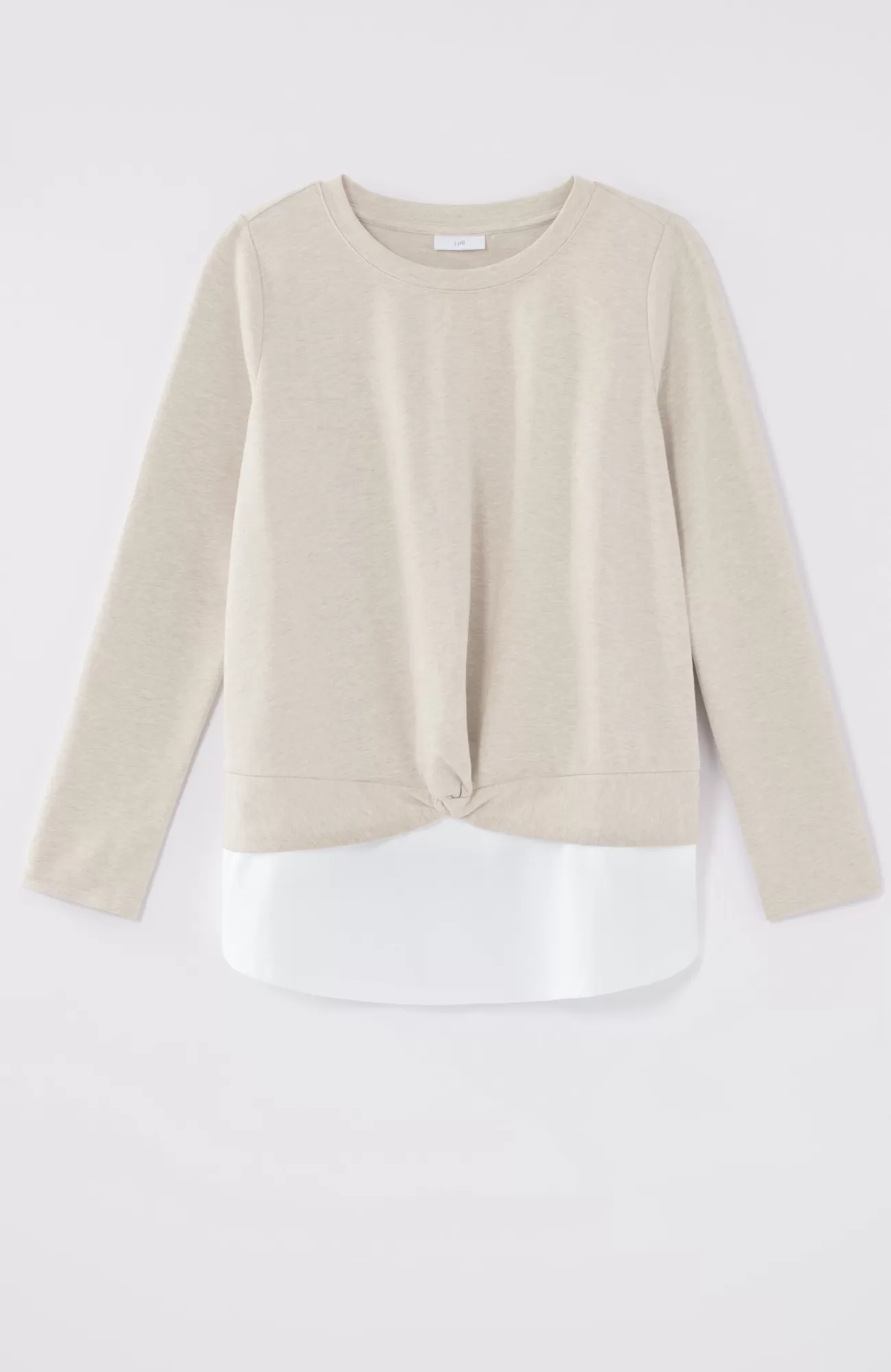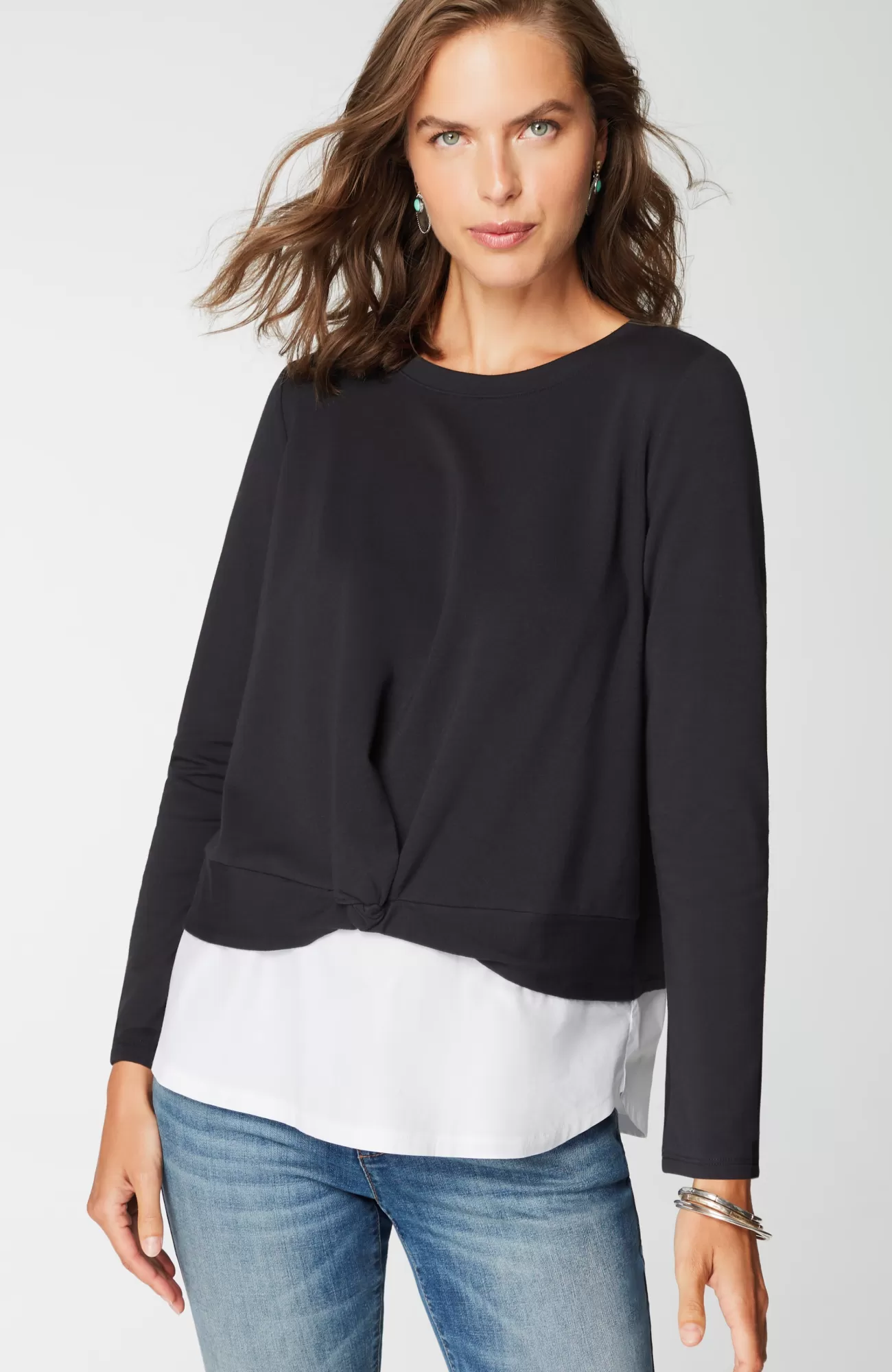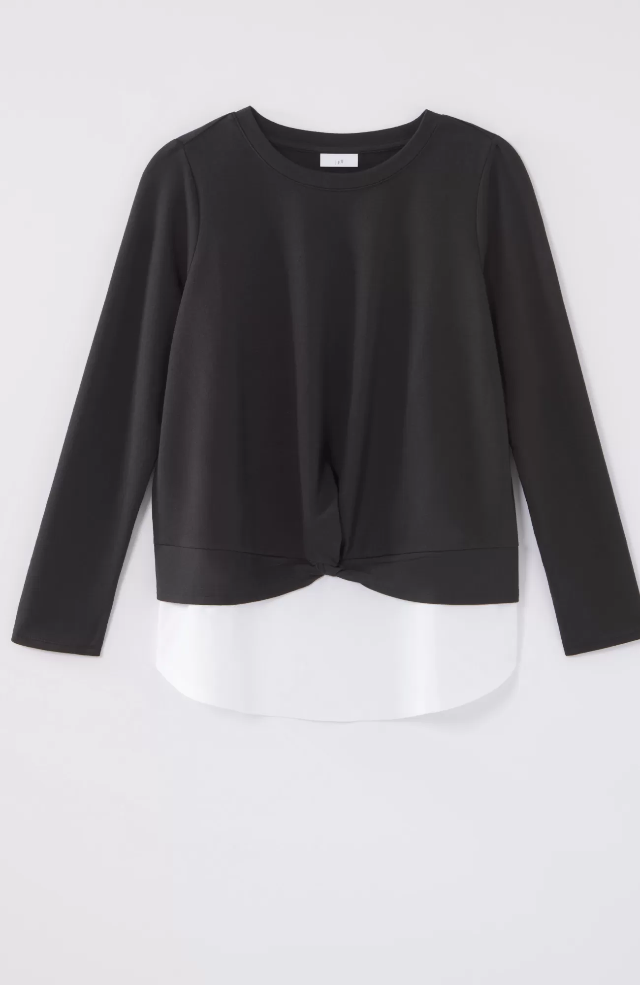 A transitional top with a twist—we love the knot detail in the front that feels fresh and new, and the woven faux shirt underlayer that adds a little something extra. It's supremely soft and looks best with your favorite jeans.