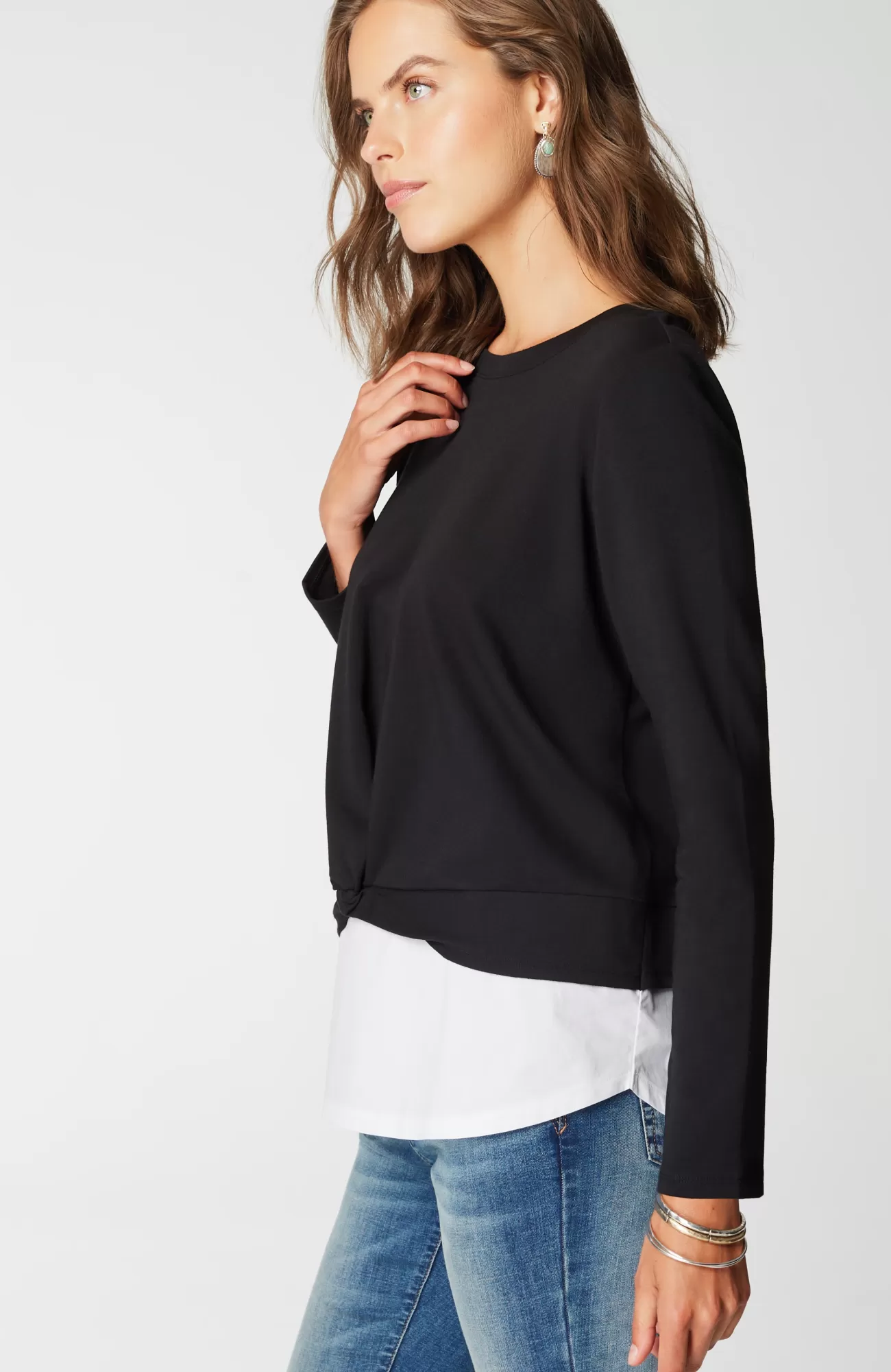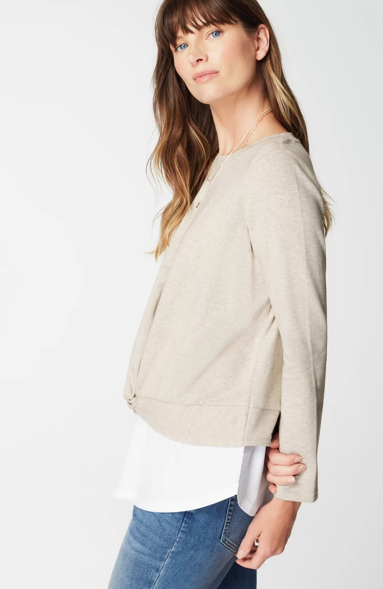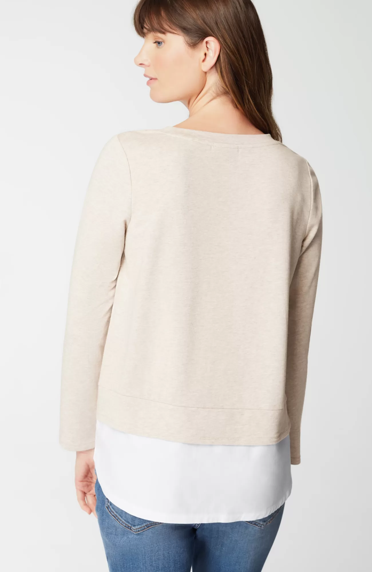 A transitional top with a twist—we love the knot detail in the front that feels fresh and new, and the woven faux shirt underlayer that adds a little something extra. It's supremely soft and looks best with your favorite jeans.