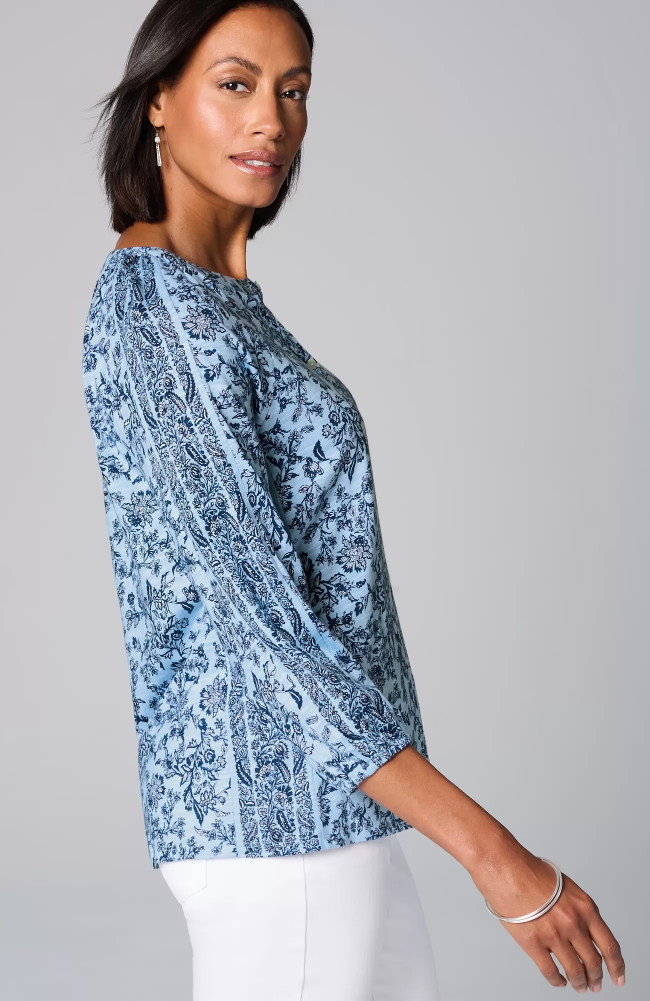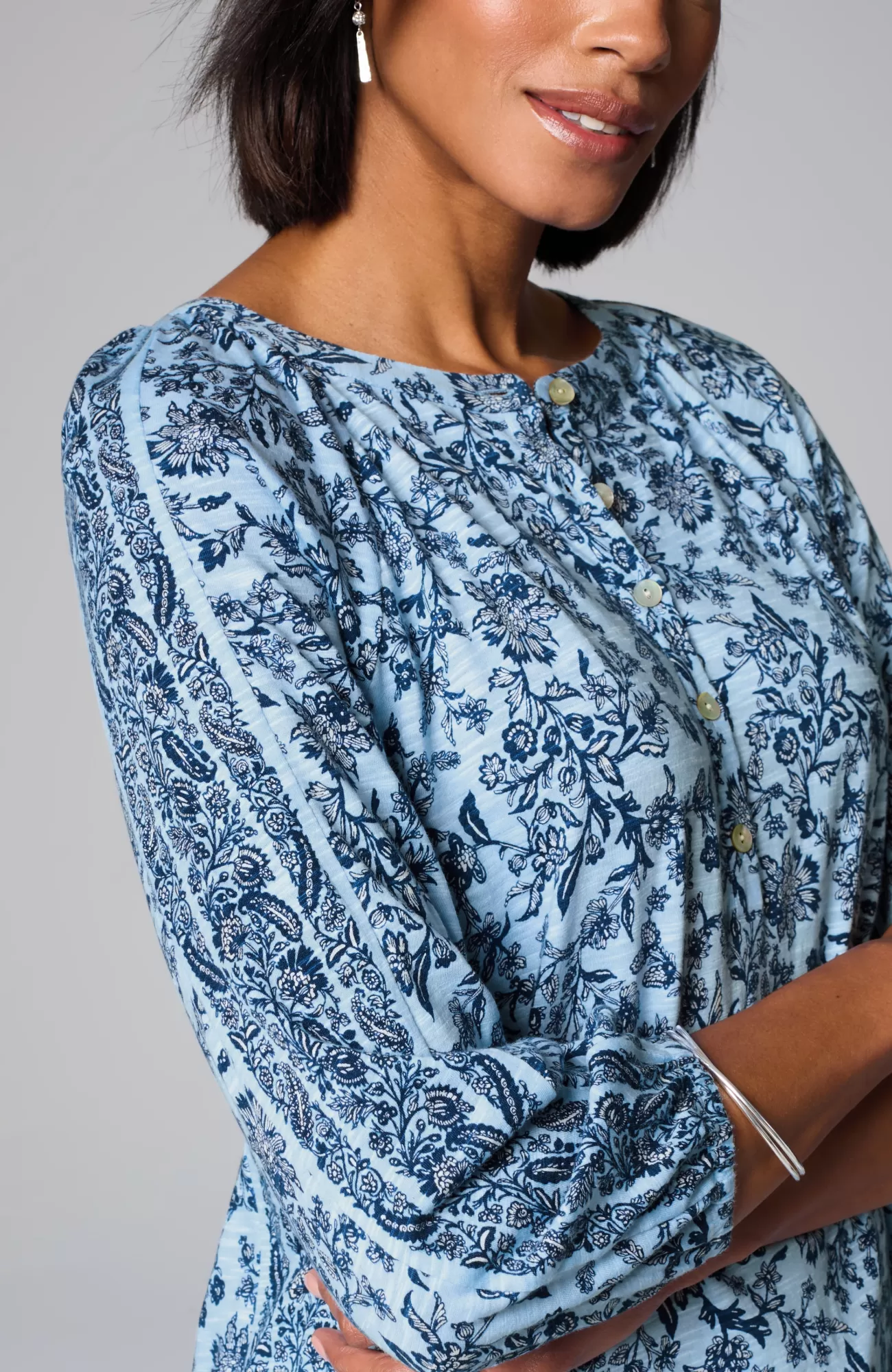Designed in a luxurious blend of cotton and TENCEL™ Modal, this breezy top features an artisanal twist: complementary mixed prints. We accented the floral print on the body with pretty paisley along the sleeves and sides. Functional agoya-shell buttons at the center front. Elasticized cuffs.