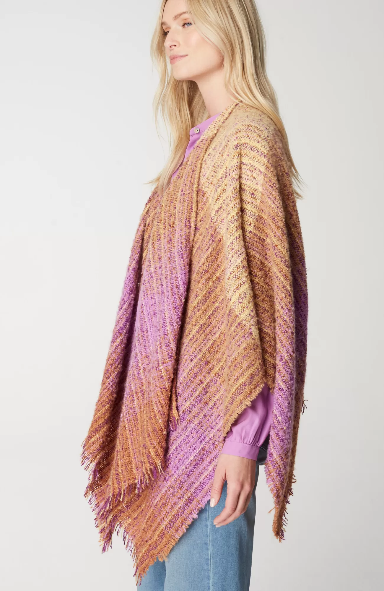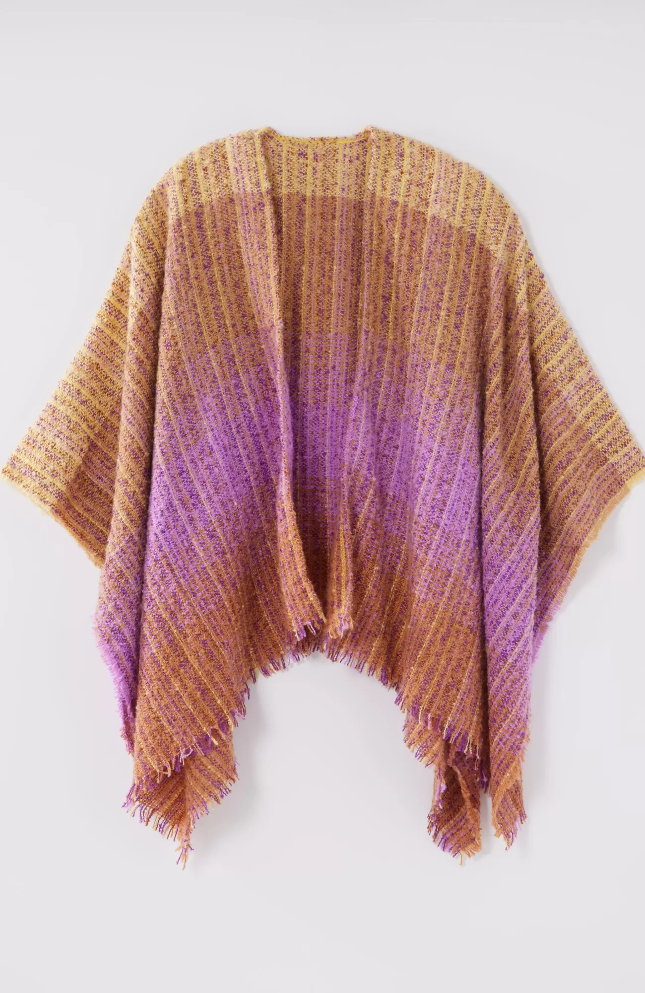 Our cozy ruana starts with textured tweed and finishes with a playful eyelash fringe. We love that it's made from soft recycled polyester, and did we mention it's ombré? We mixed orange, gold and vibrant violet for a color combo that goes beyond fall. Open at the sides.