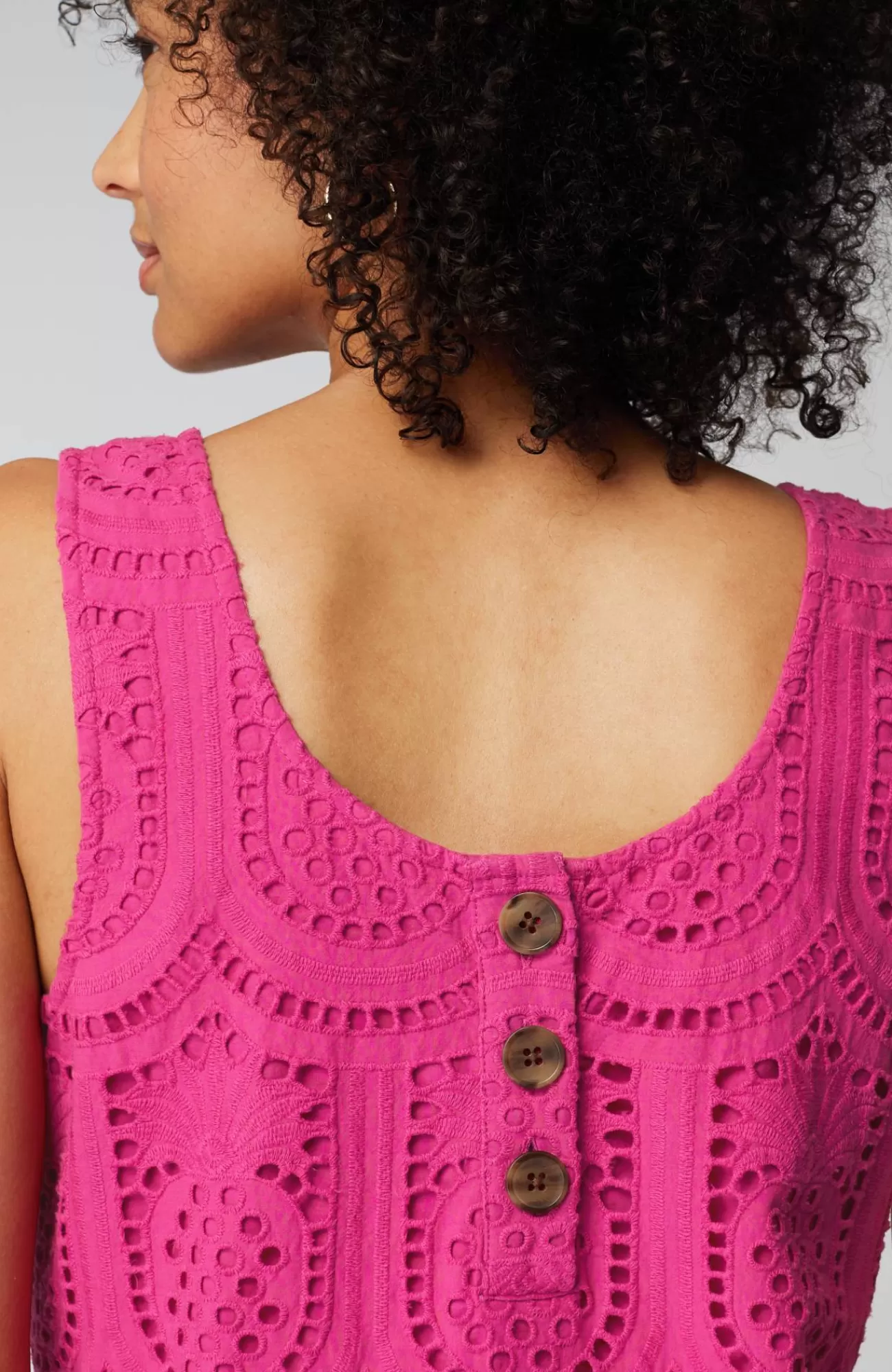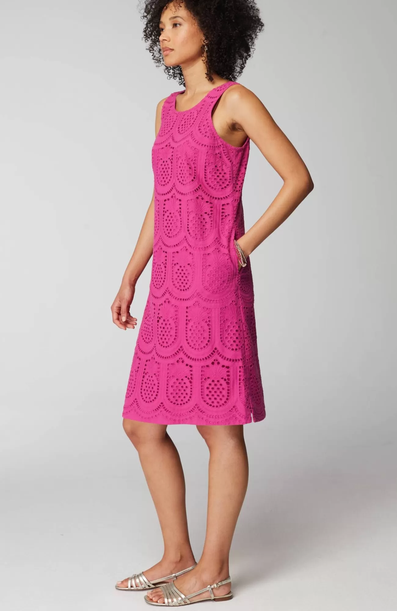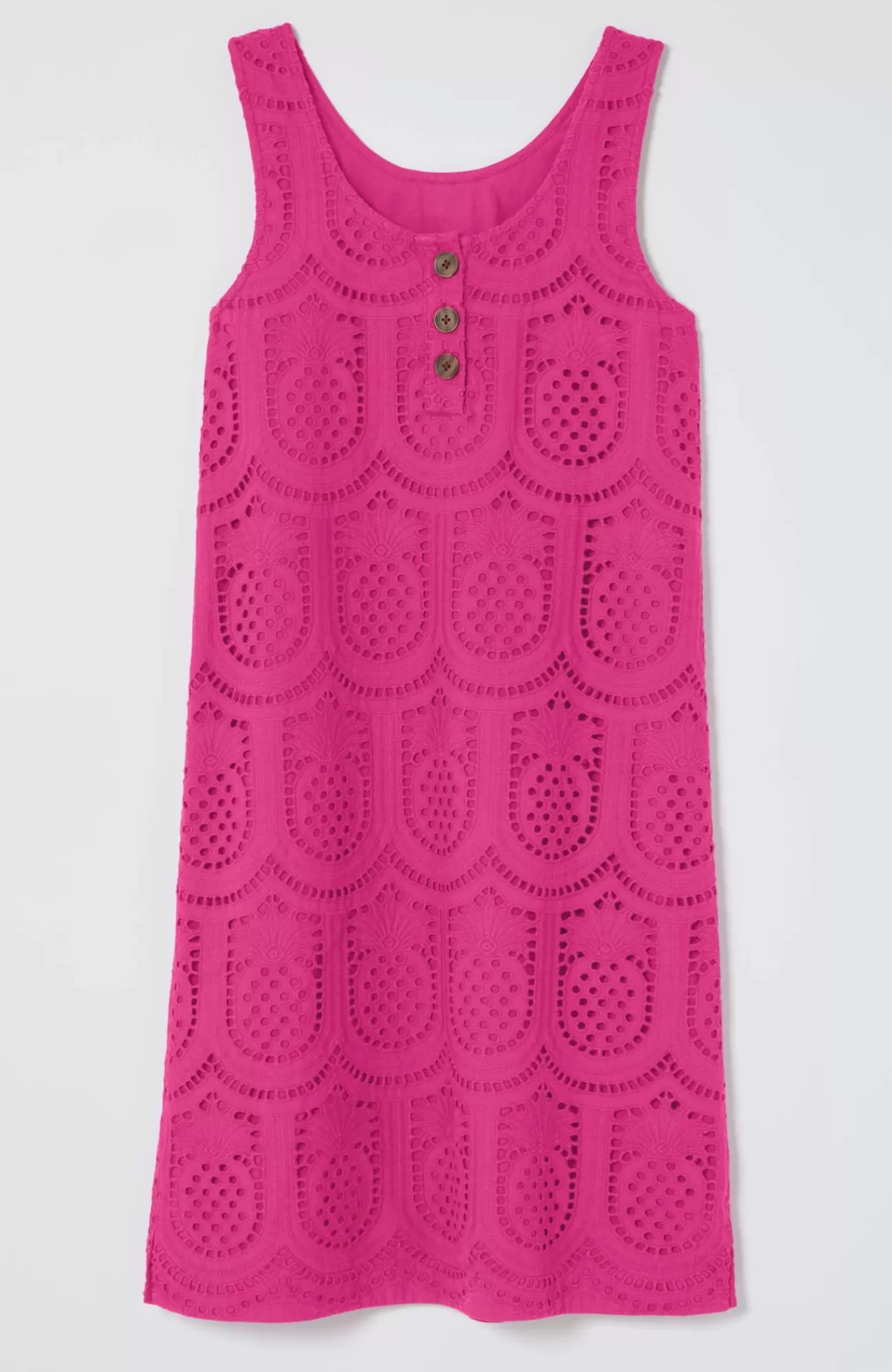 We're loving everything eyelet, especially our playful twist with summer-perfect pineapples. The best part? It has pockets! Three-button closure at back.