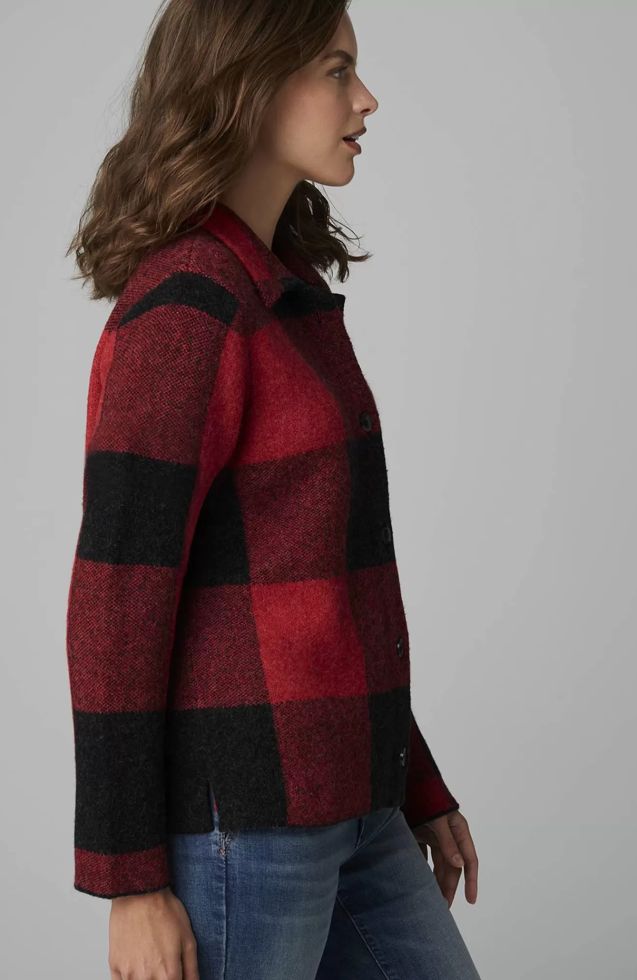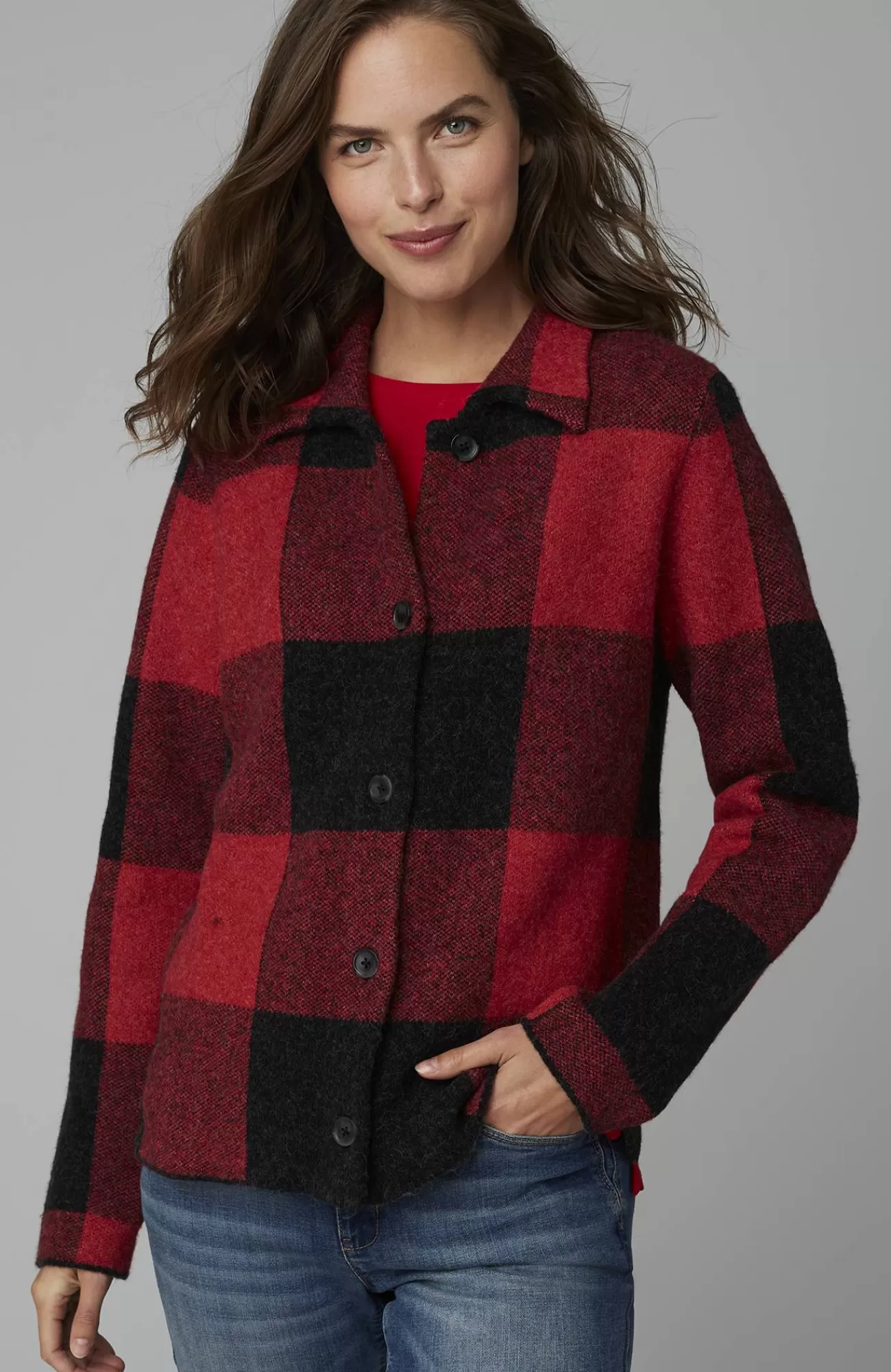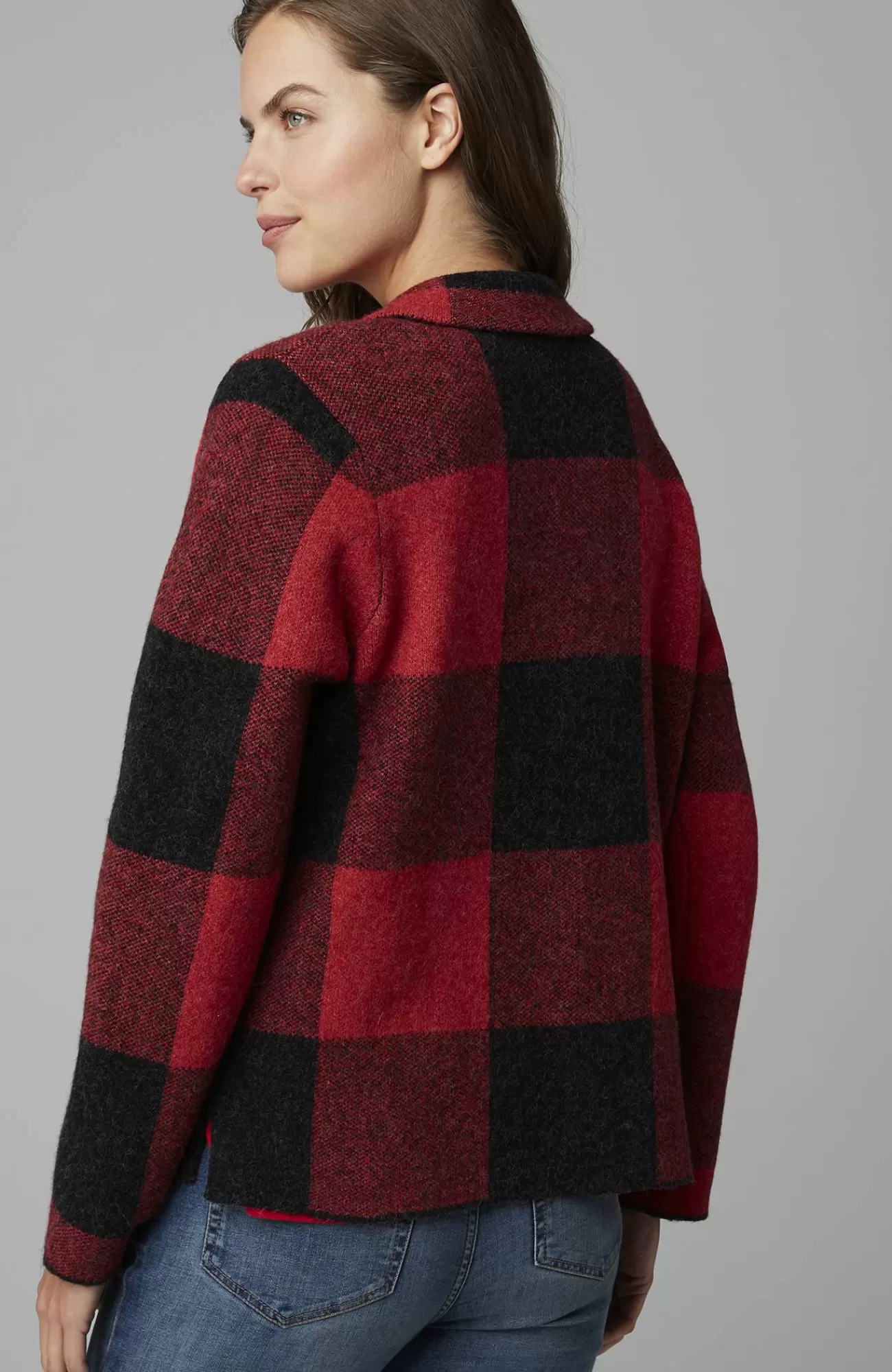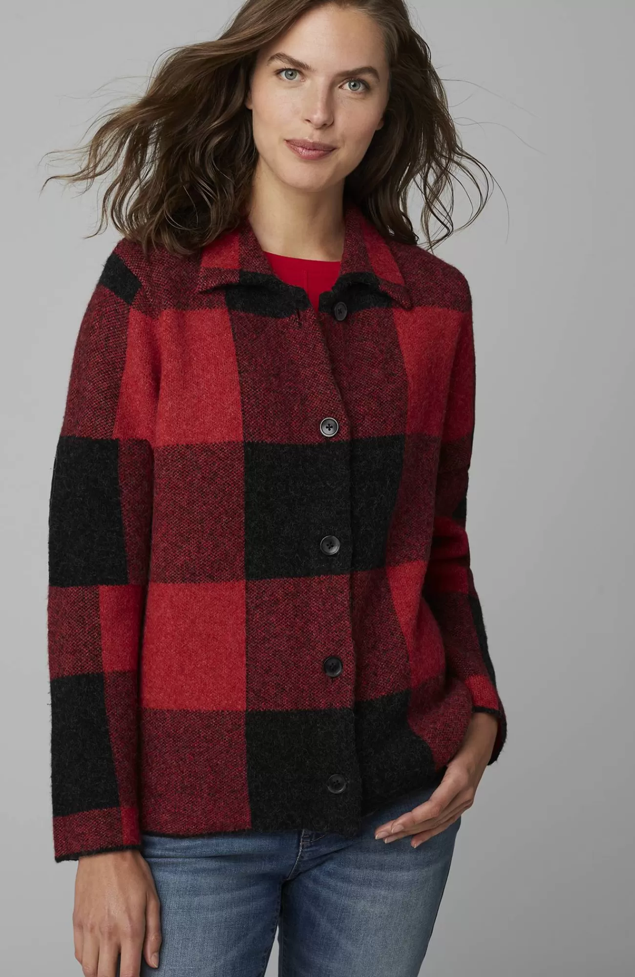 The classic side of plaid: our buffalo check button-front sweater, designed to work as a sweater or light jacket.