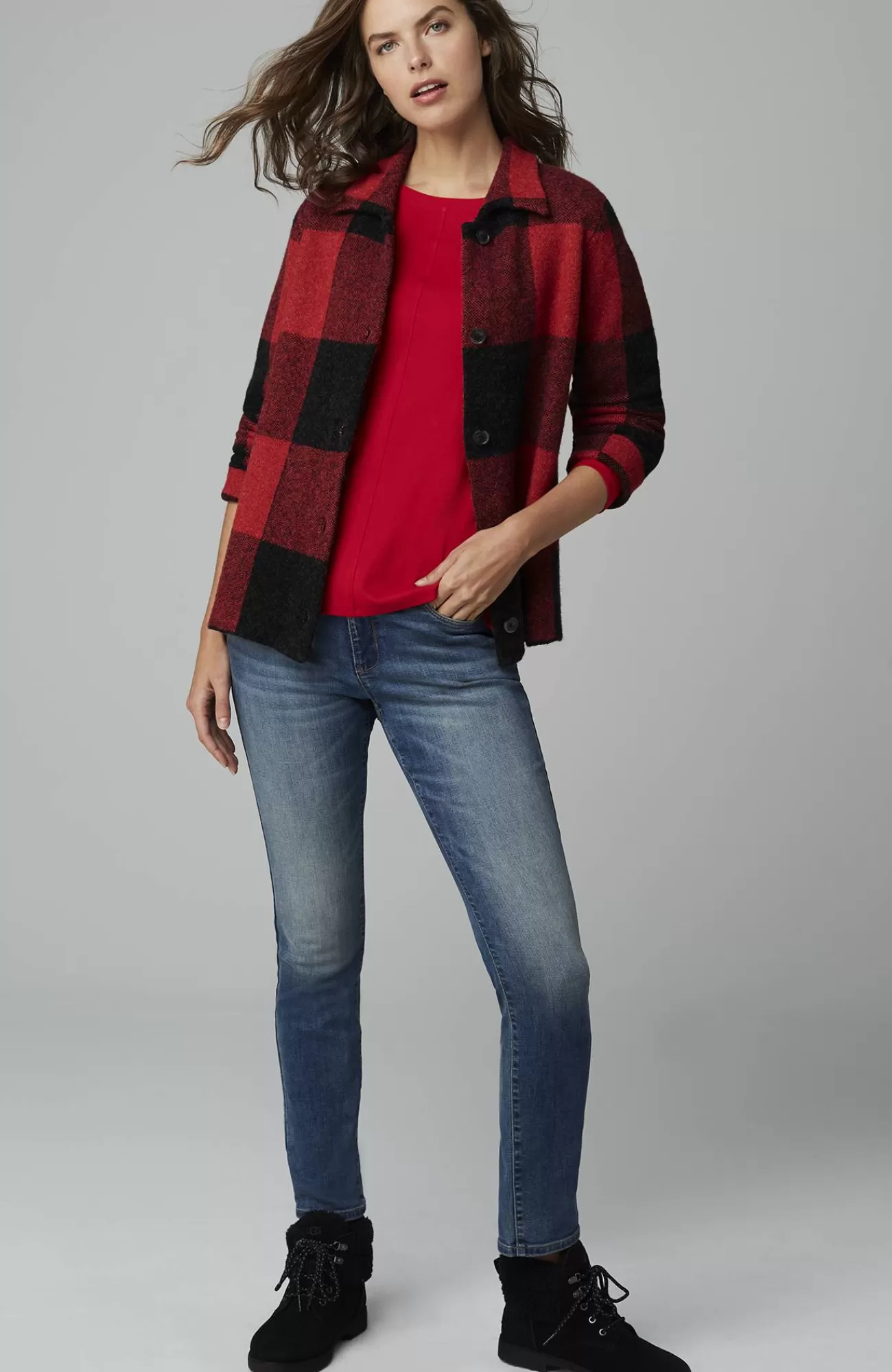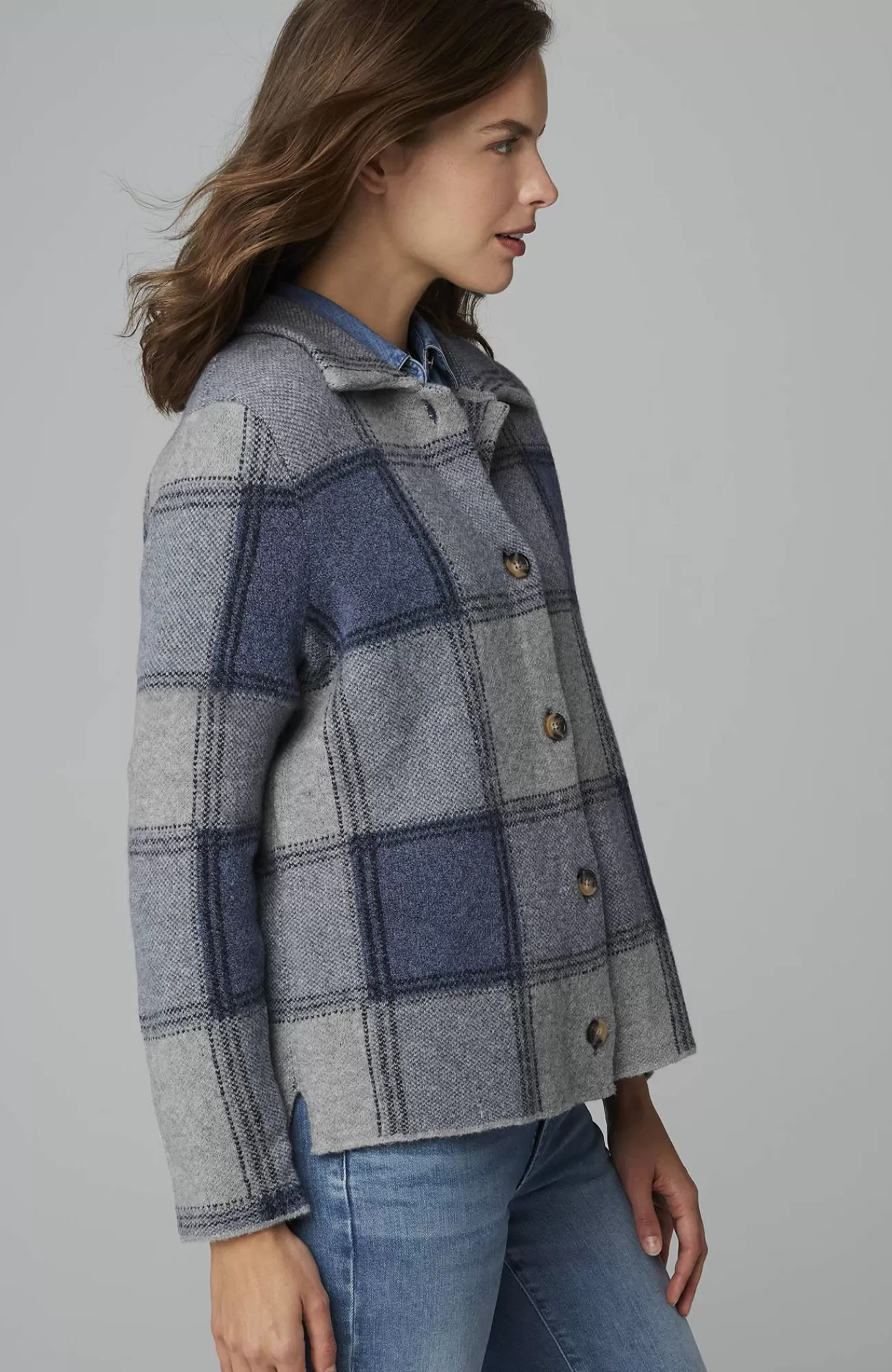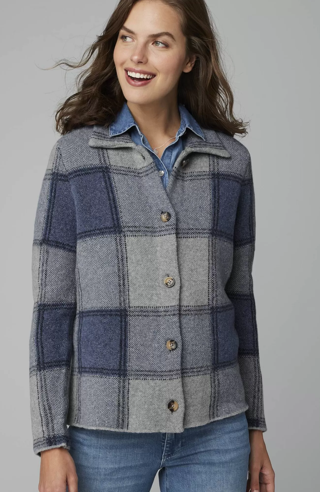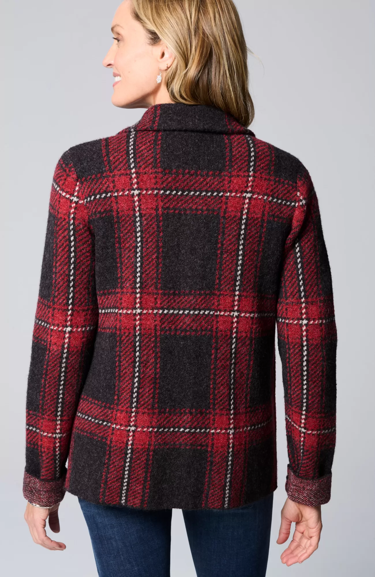 The classic side of plaid: our buffalo check button-front sweater, designed to work as a sweater or light jacket.