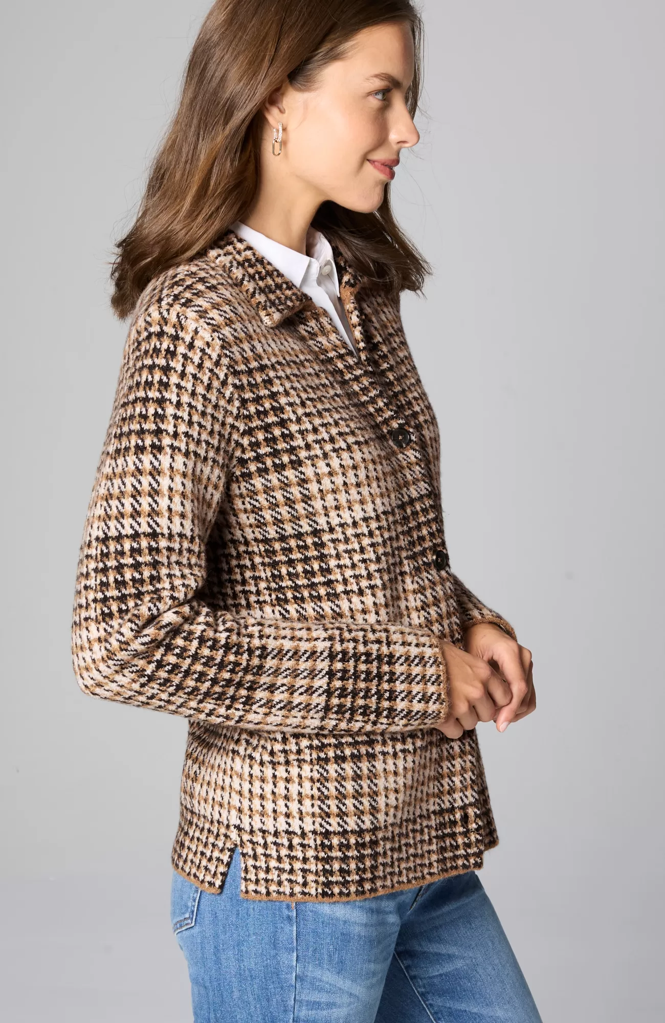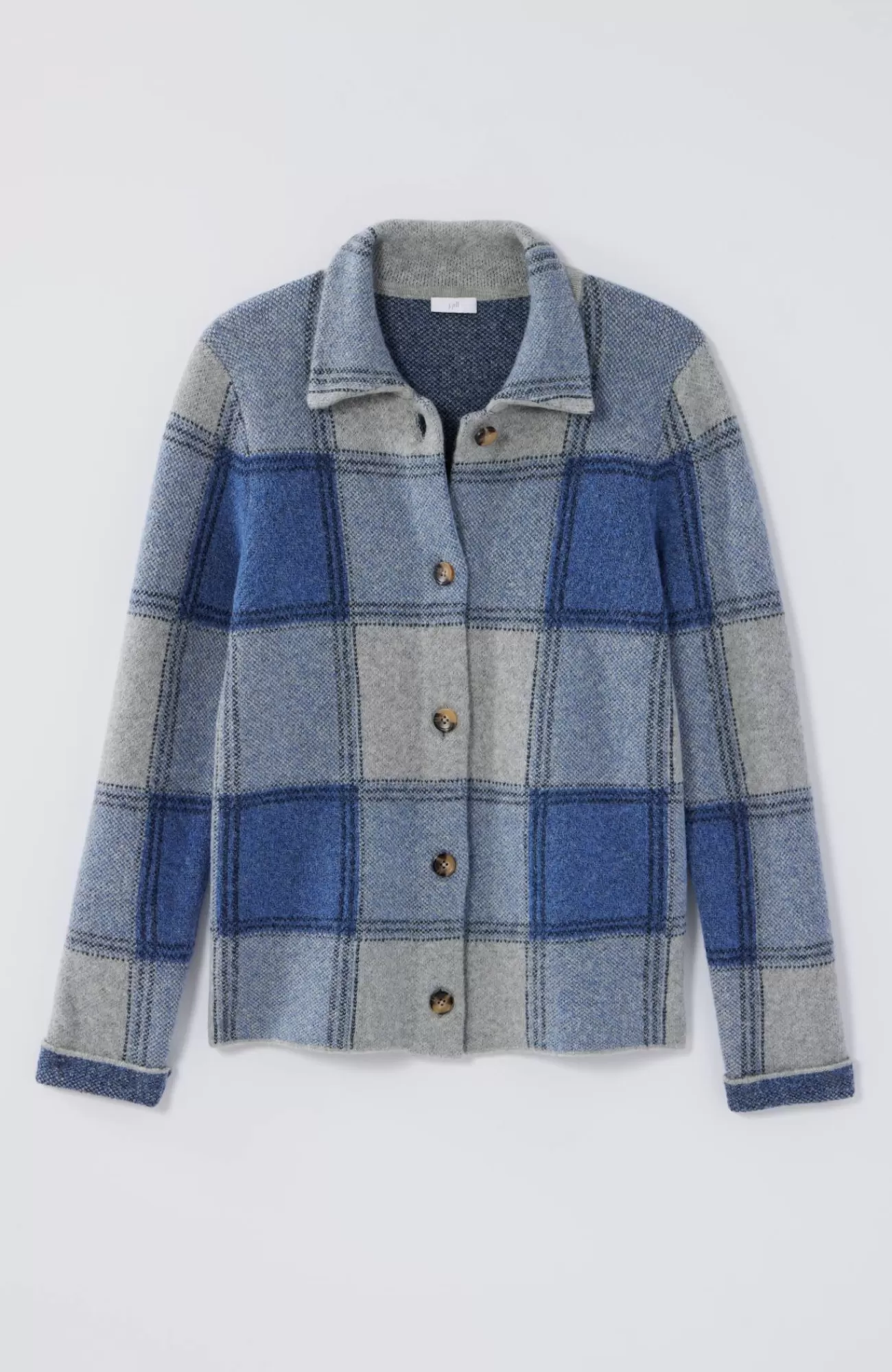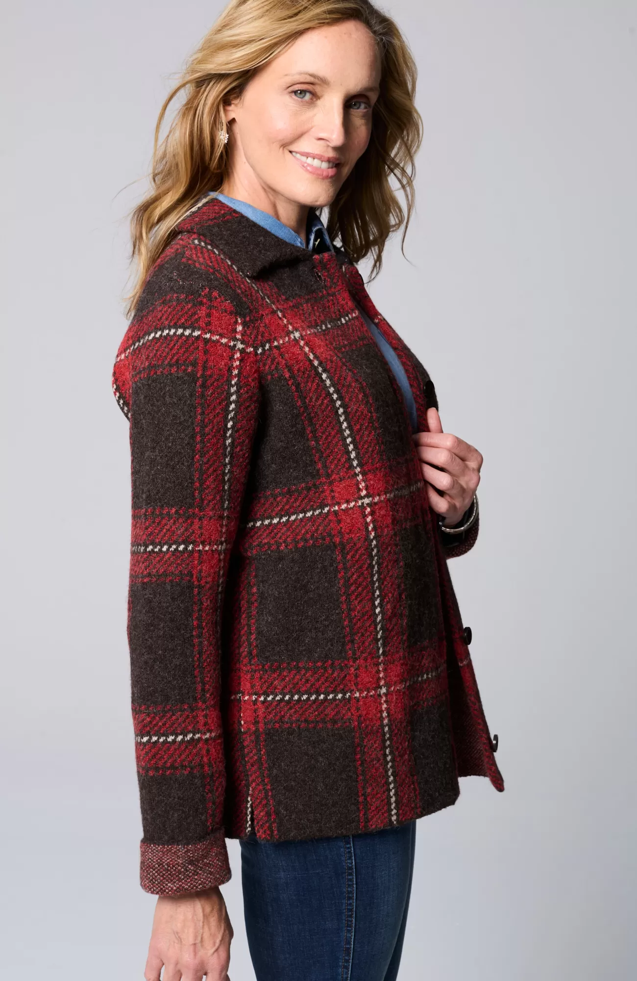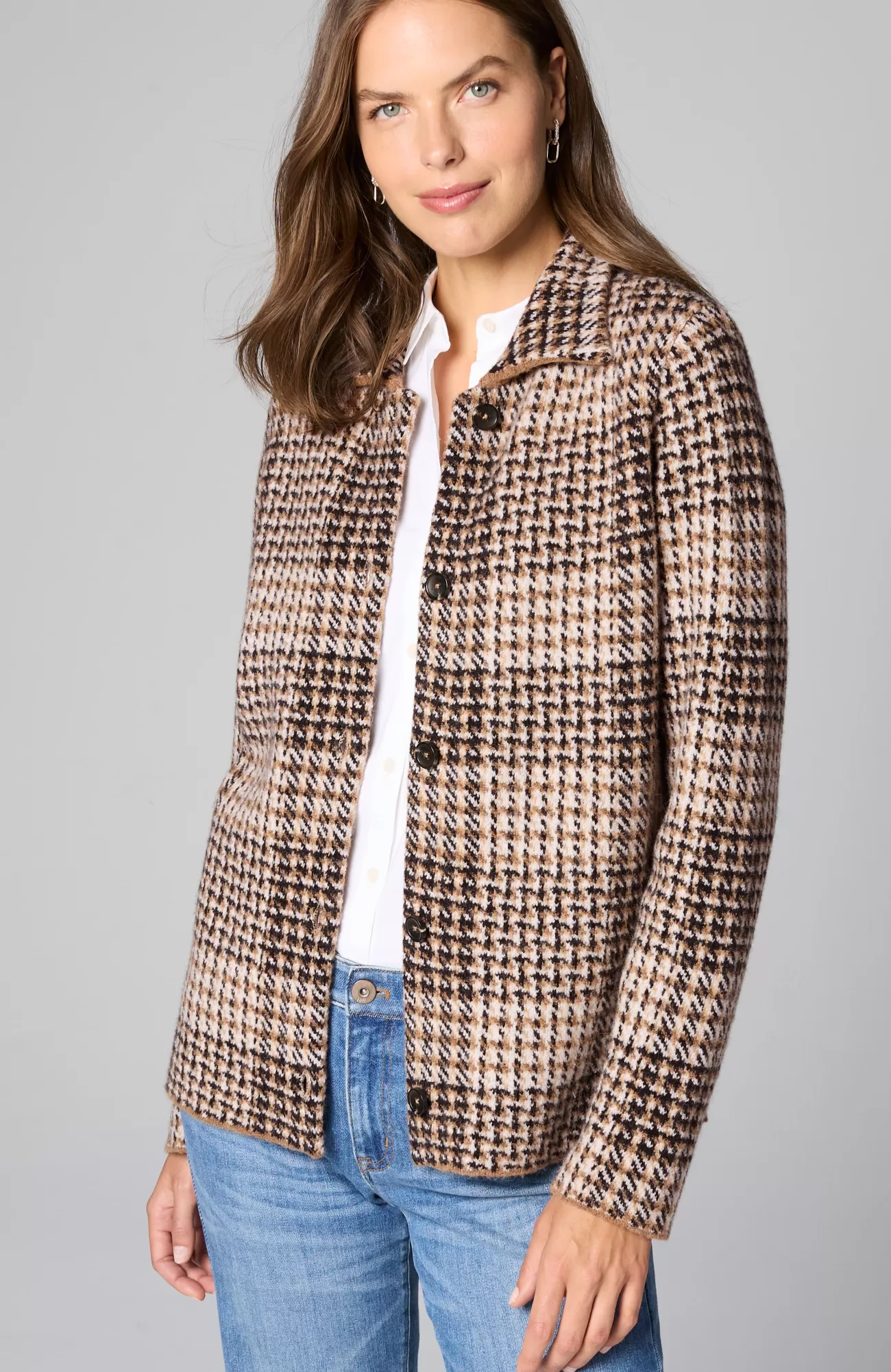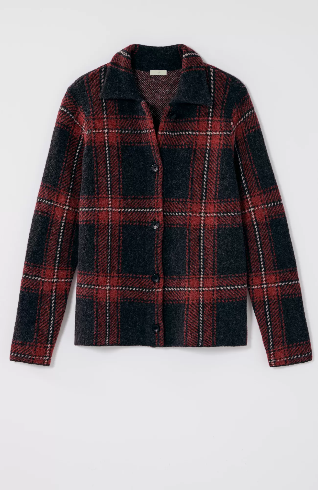 The classic side of plaid: our buffalo check button-front sweater, designed to work as a sweater or light jacket.