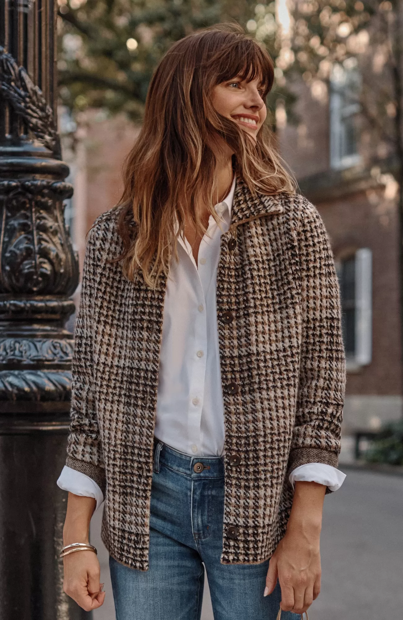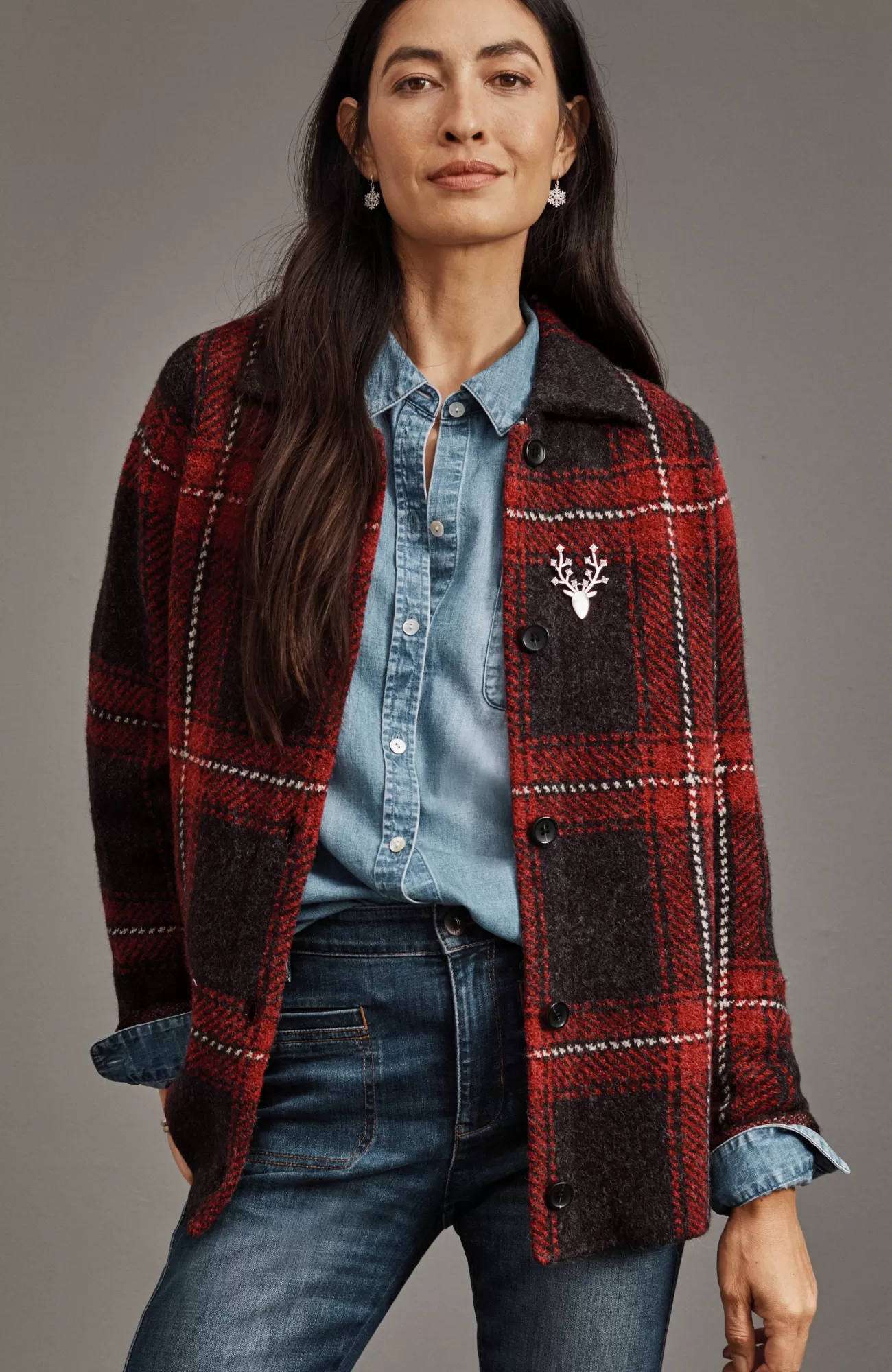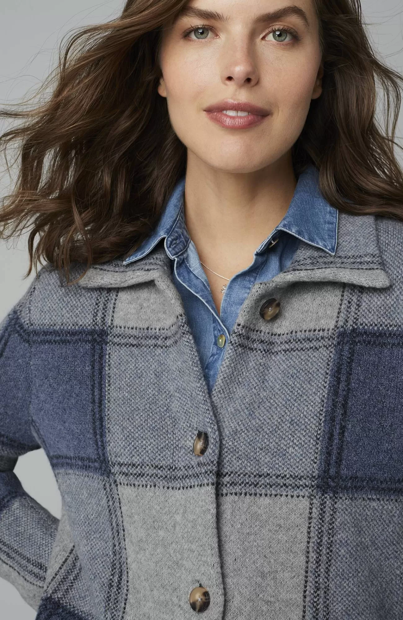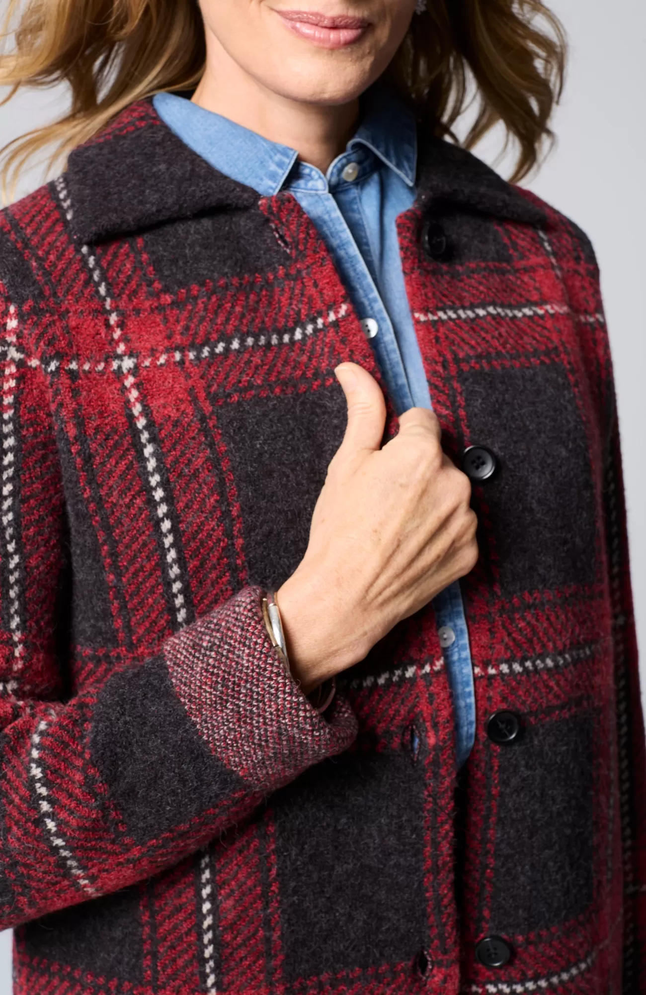The classic side of plaid: our buffalo check button-front sweater, designed to work as a sweater or light jacket.