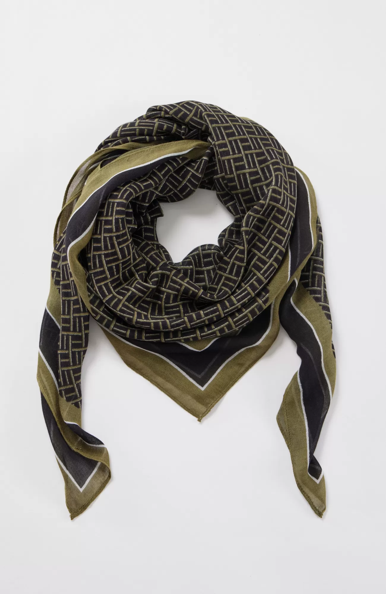 The perfect finishing touch: our lightweight square scarf has a modern geometric print and a striped border. Pair it with so many sweaters and tops in your wear-now wardrobe.