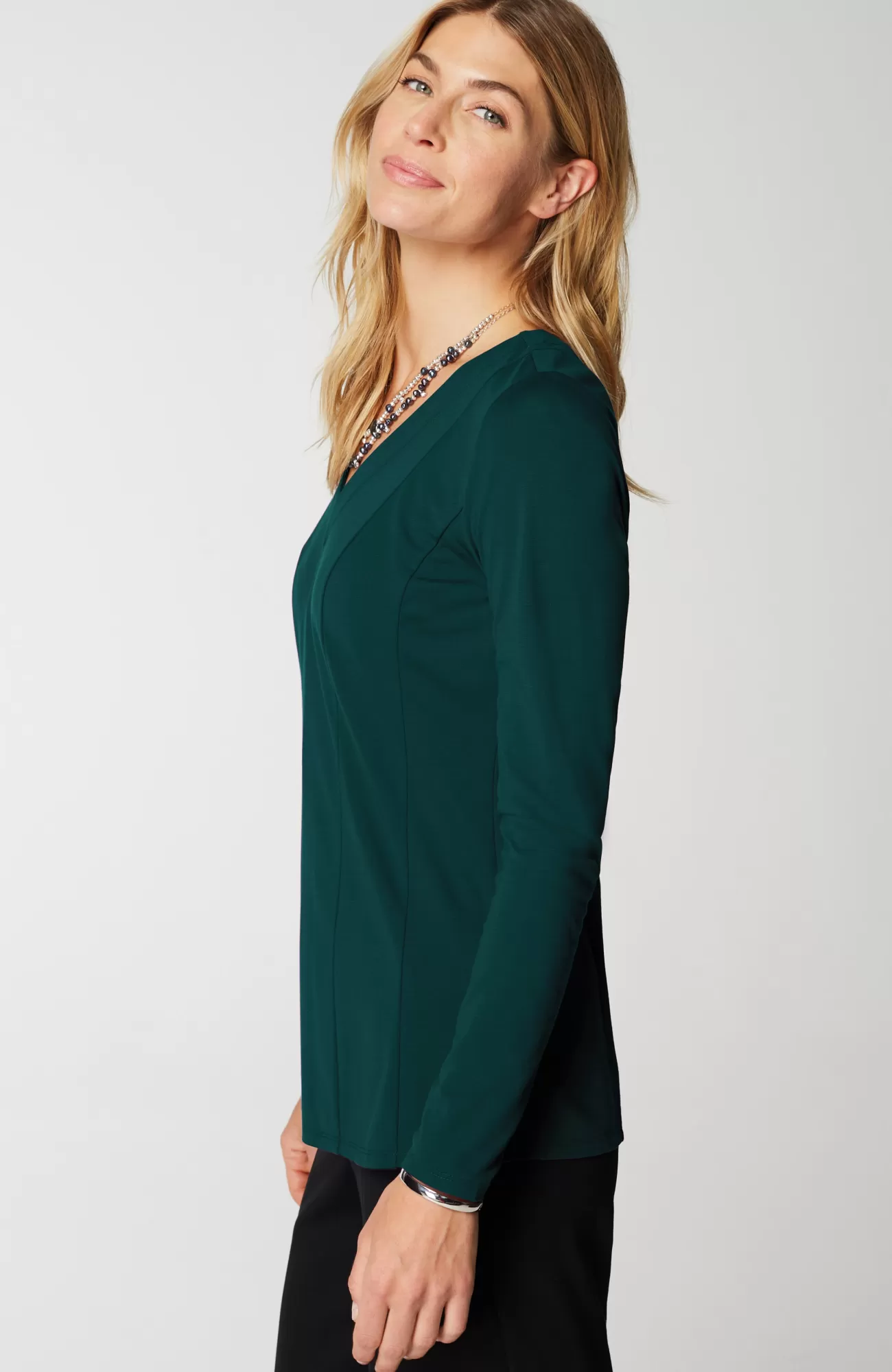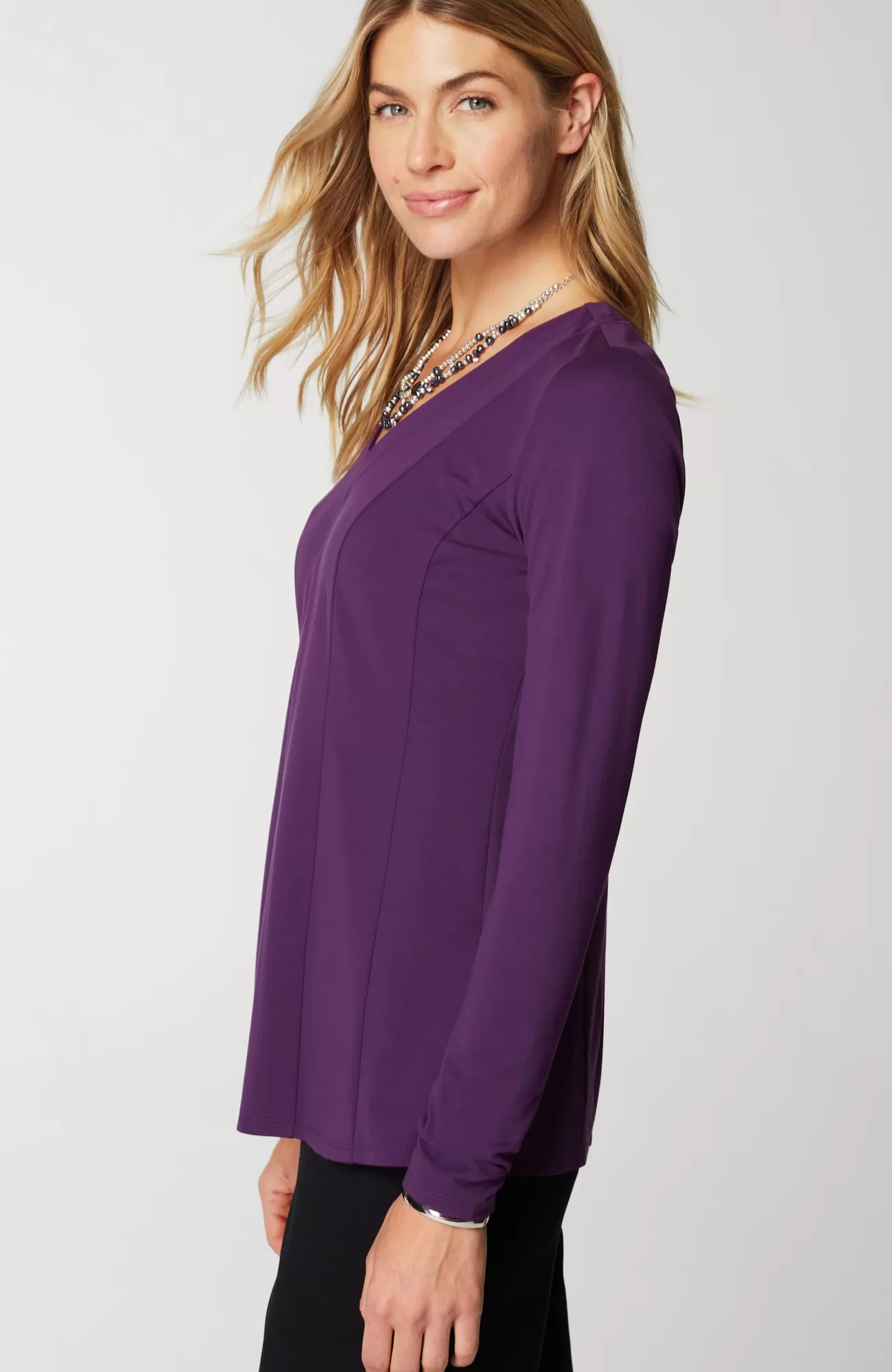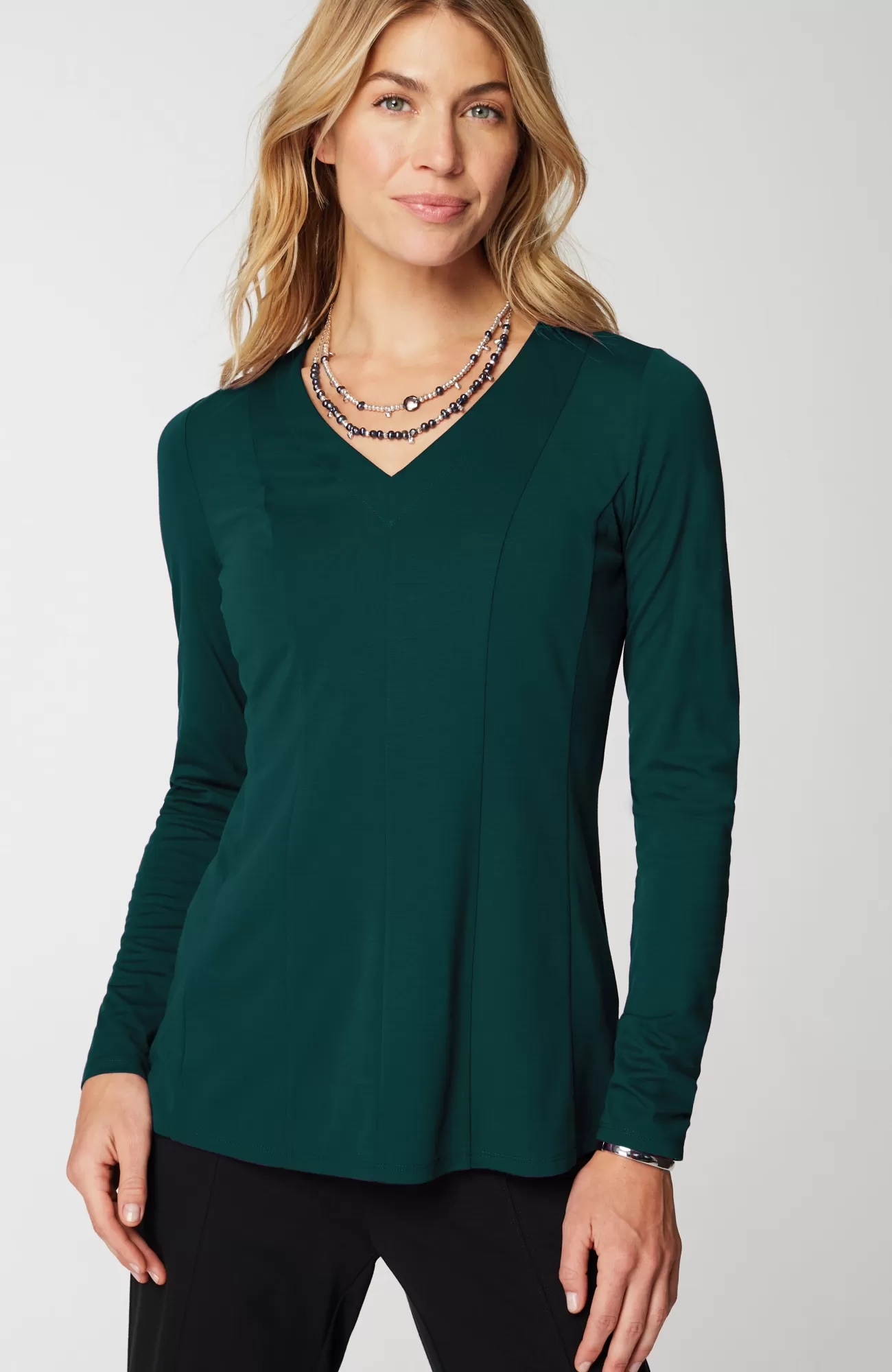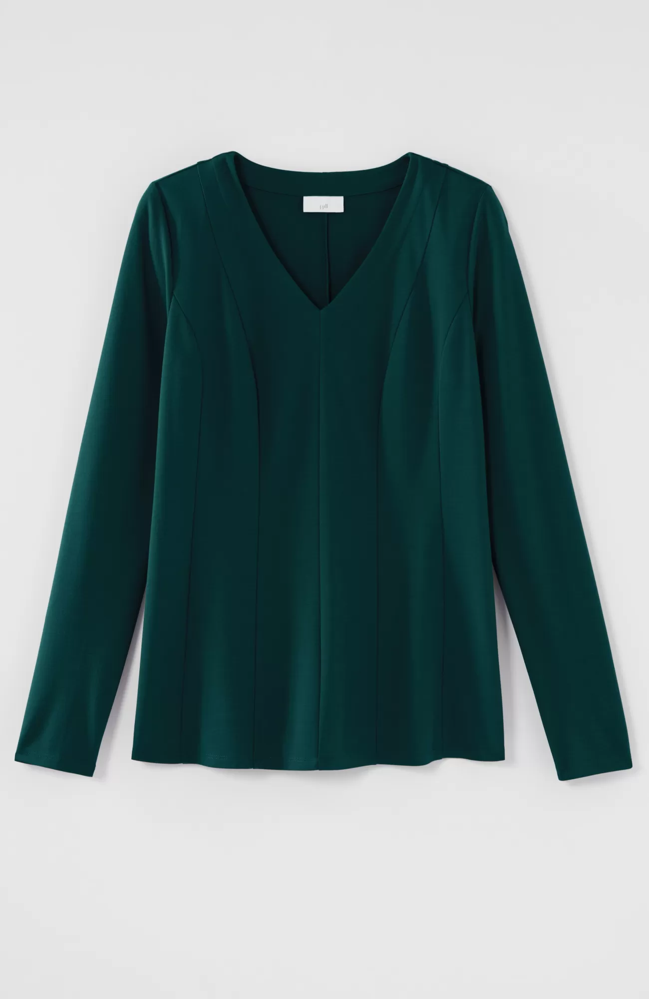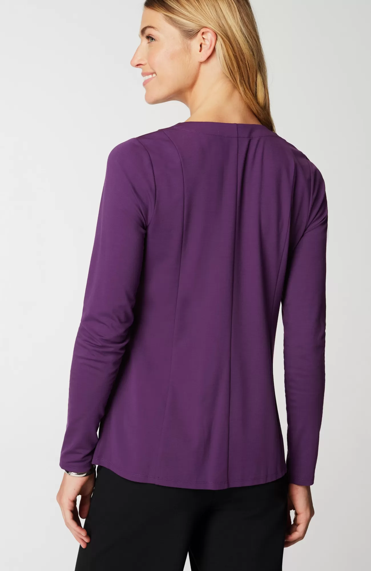 Our ponte V-neck top is an elevated, everyday essential. Vertical seam detailing on both the front and back. Subtle waist-shaping effect.