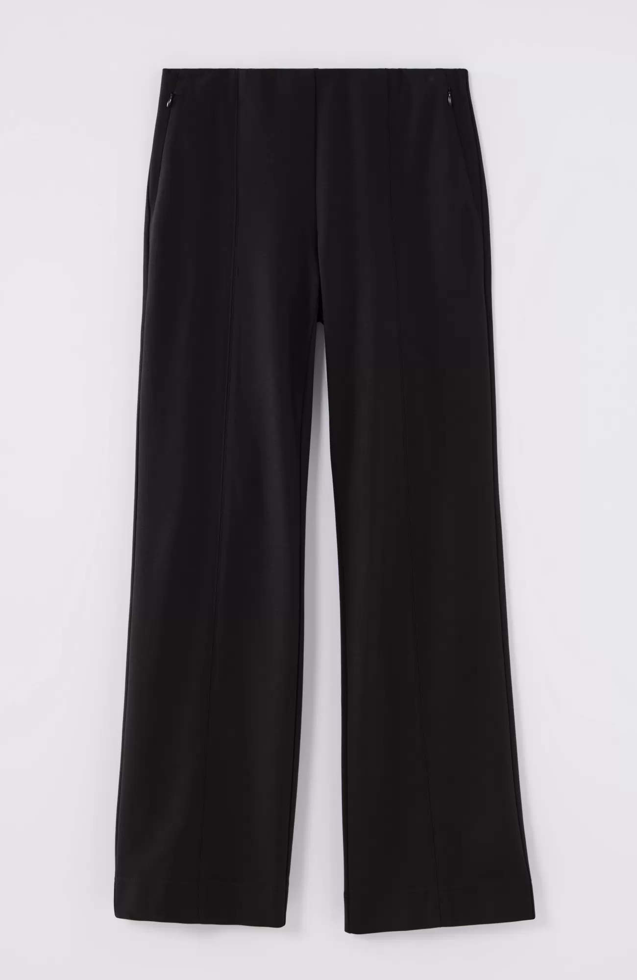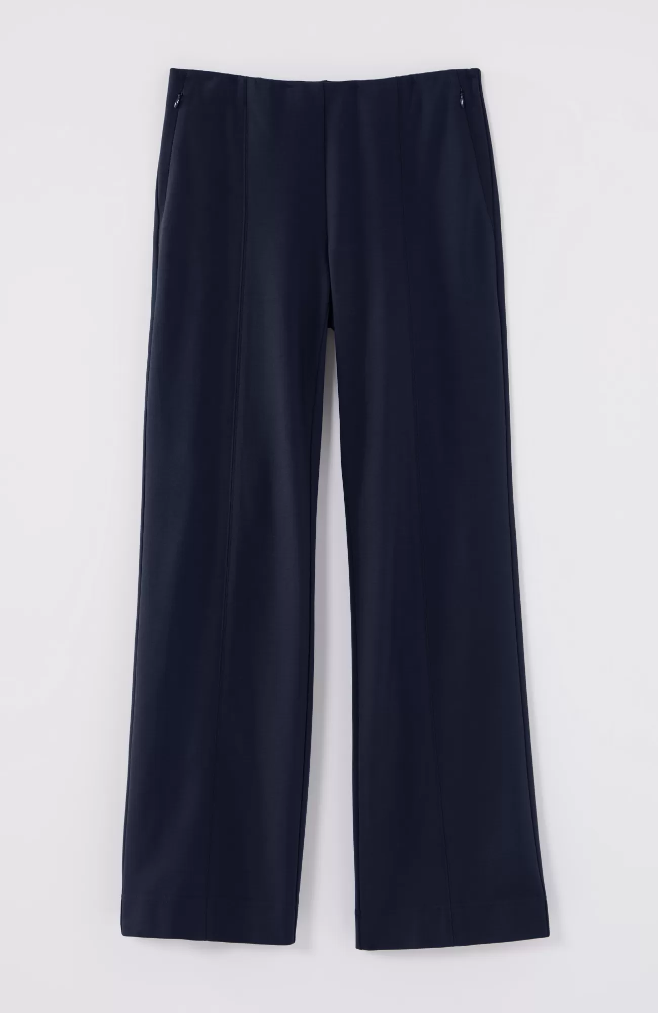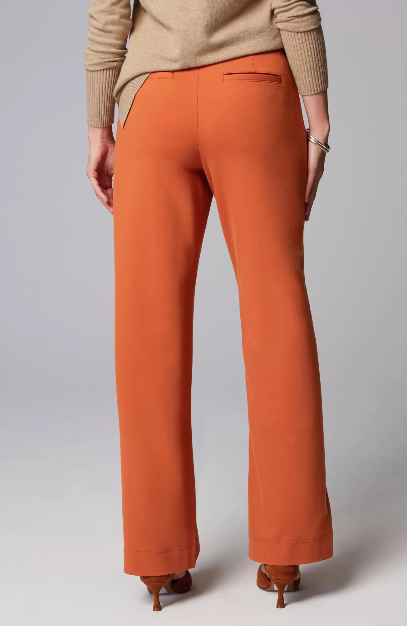 We combined our smoothing, comfortable, holds-its-shape ponte knit fabric with a full-leg design to create a versatile pair of pants that go wherever you do. A flat elasticized waist and great stretch add extra comfort. Angled front pockets with invisible zipper, back welt pockets and back darts add a tailored finish. Saddle-stitch center seam.