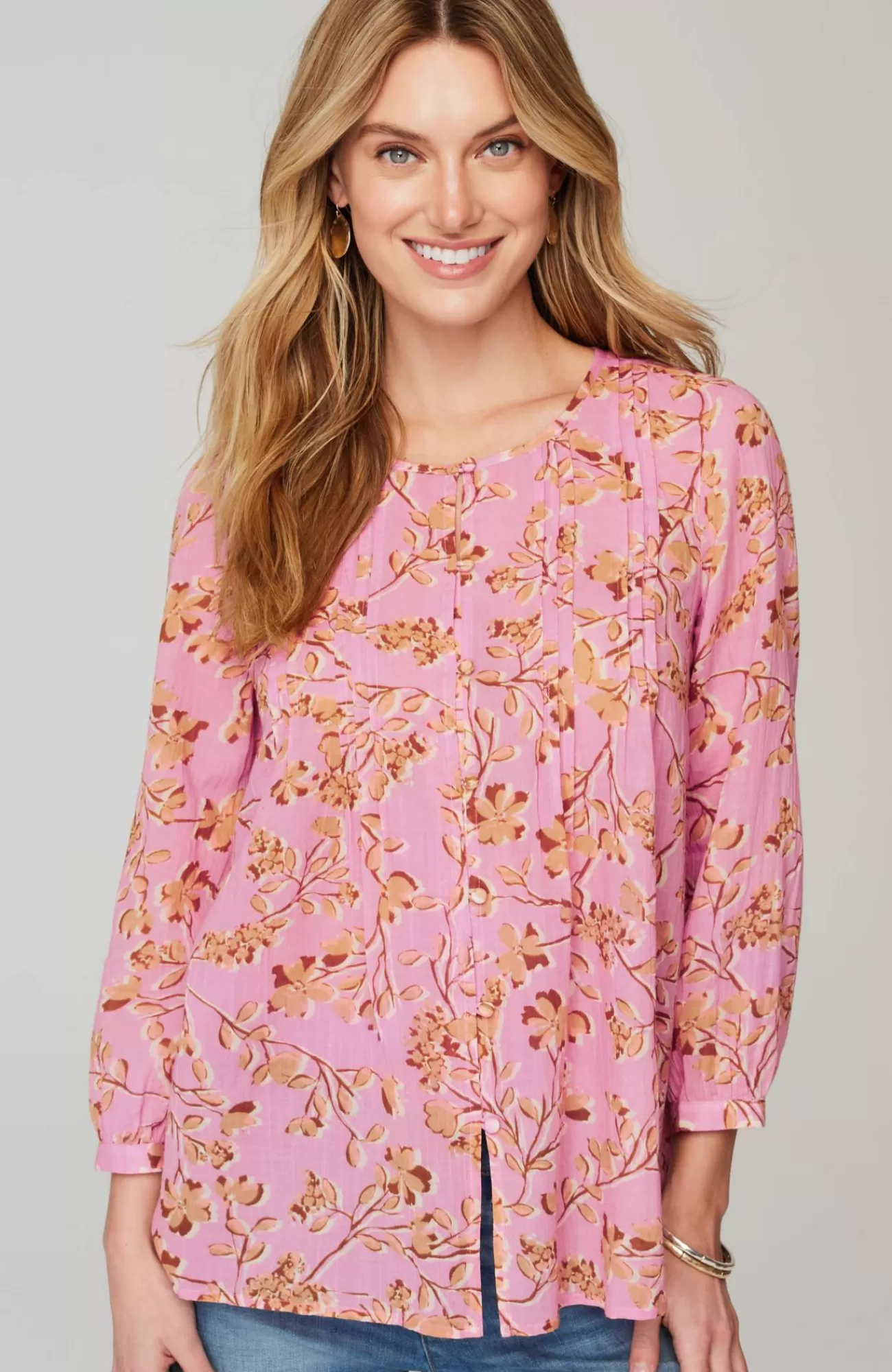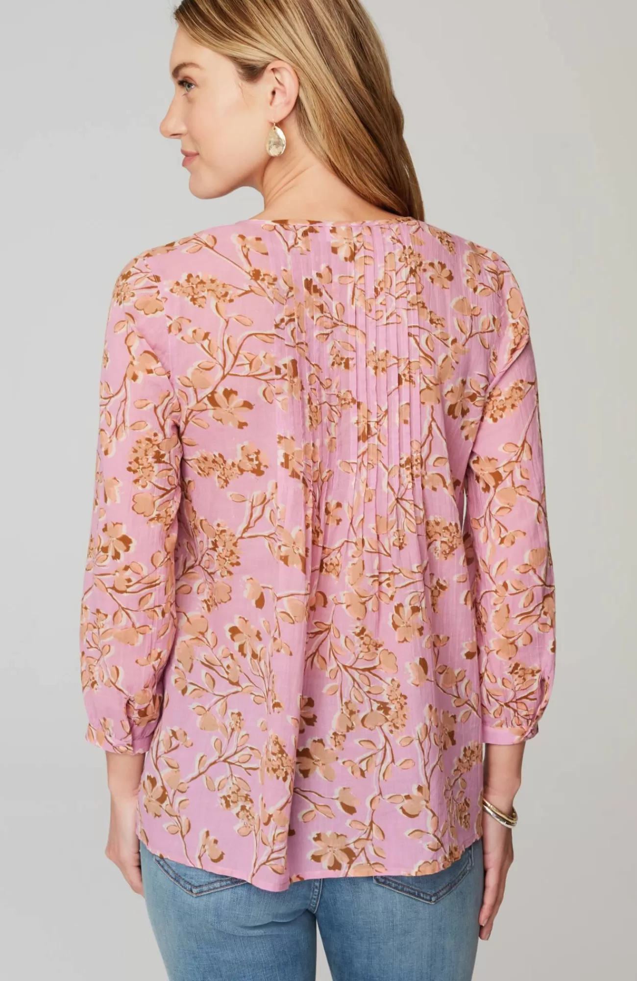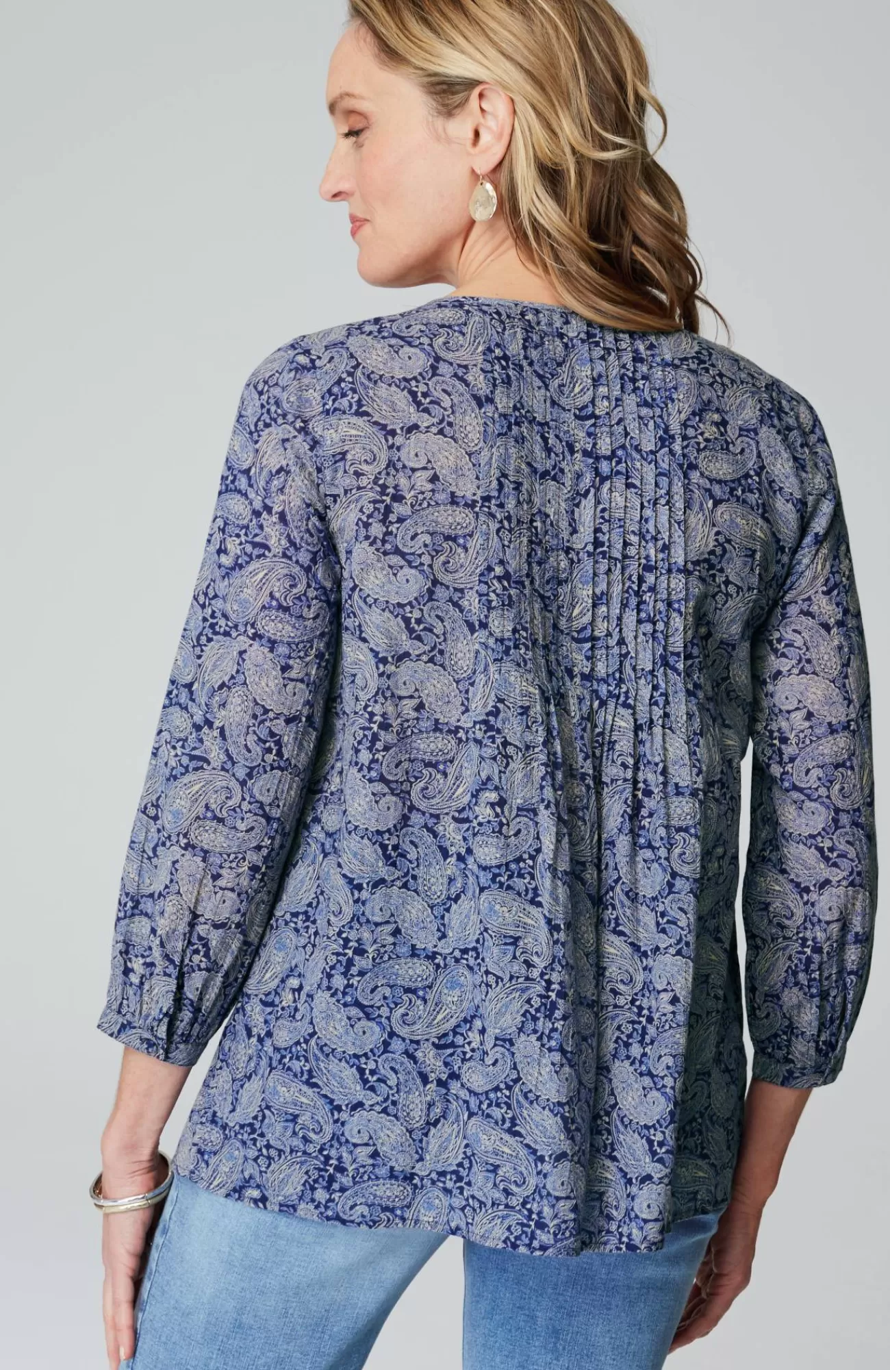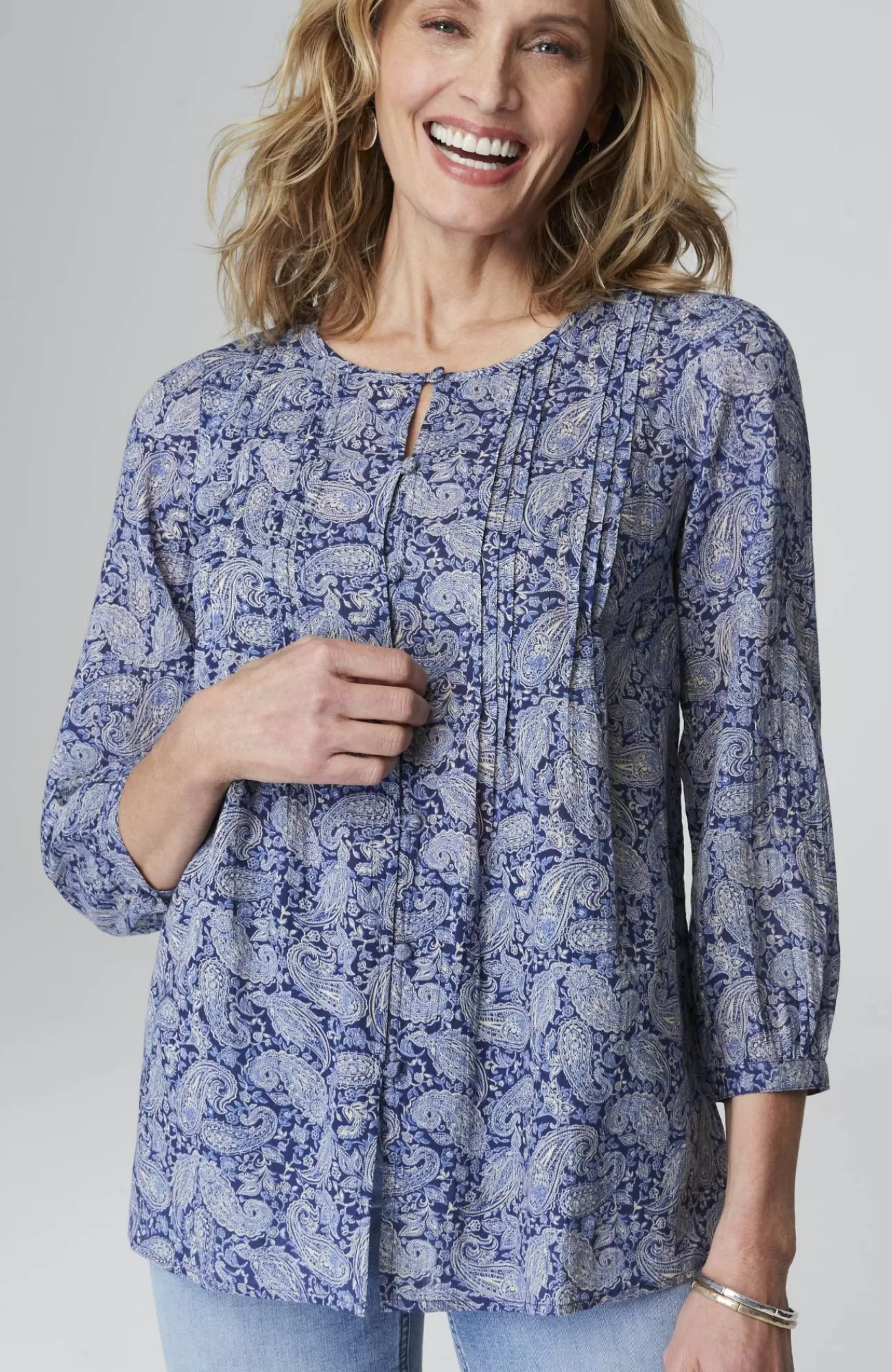 The A-line top, perfected for the season in a supersoft, light cotton, accented with delicate pintucked details and subtly shirred buttoned cuffs. Button-loop closure. Covered buttons.