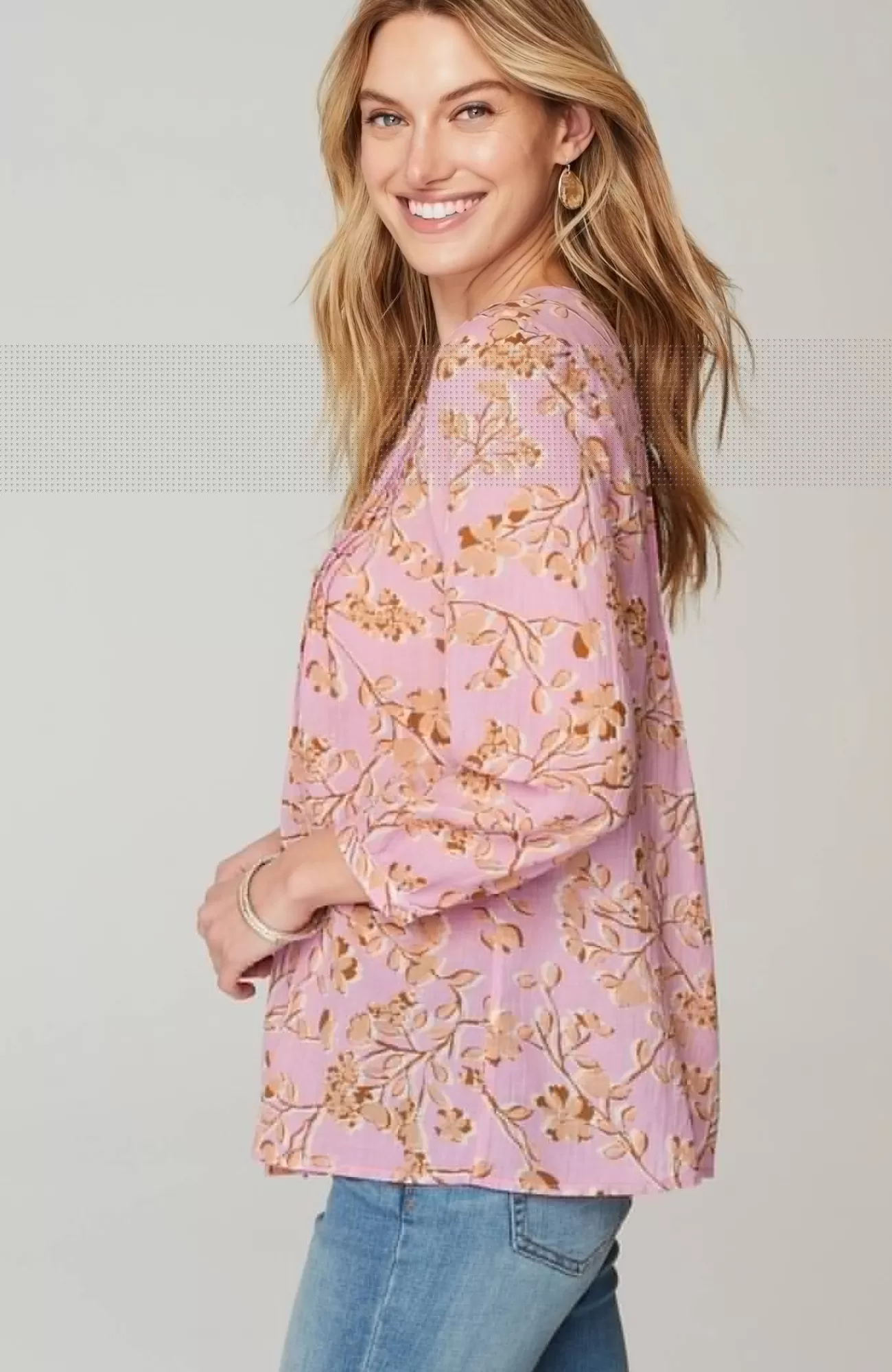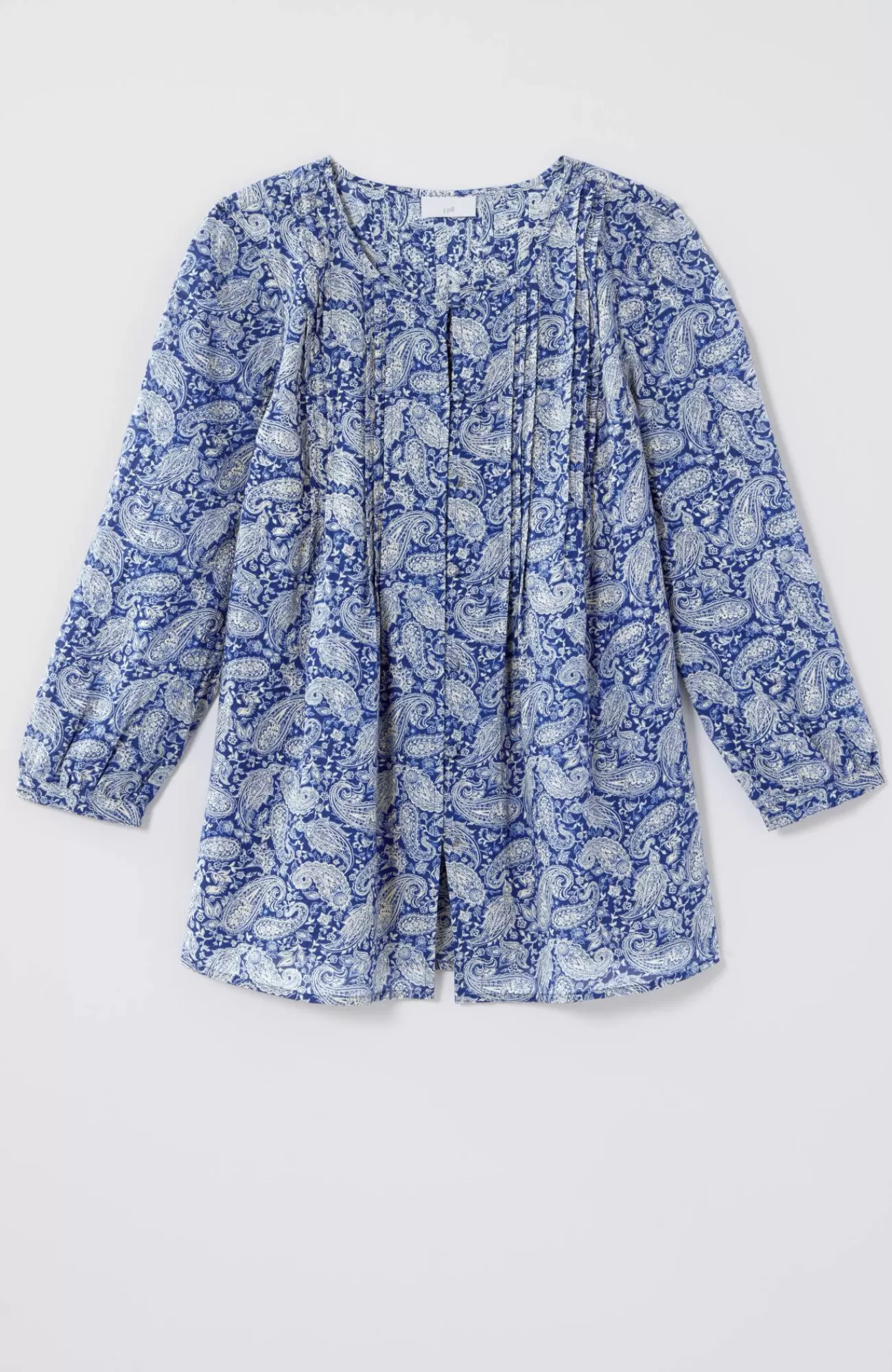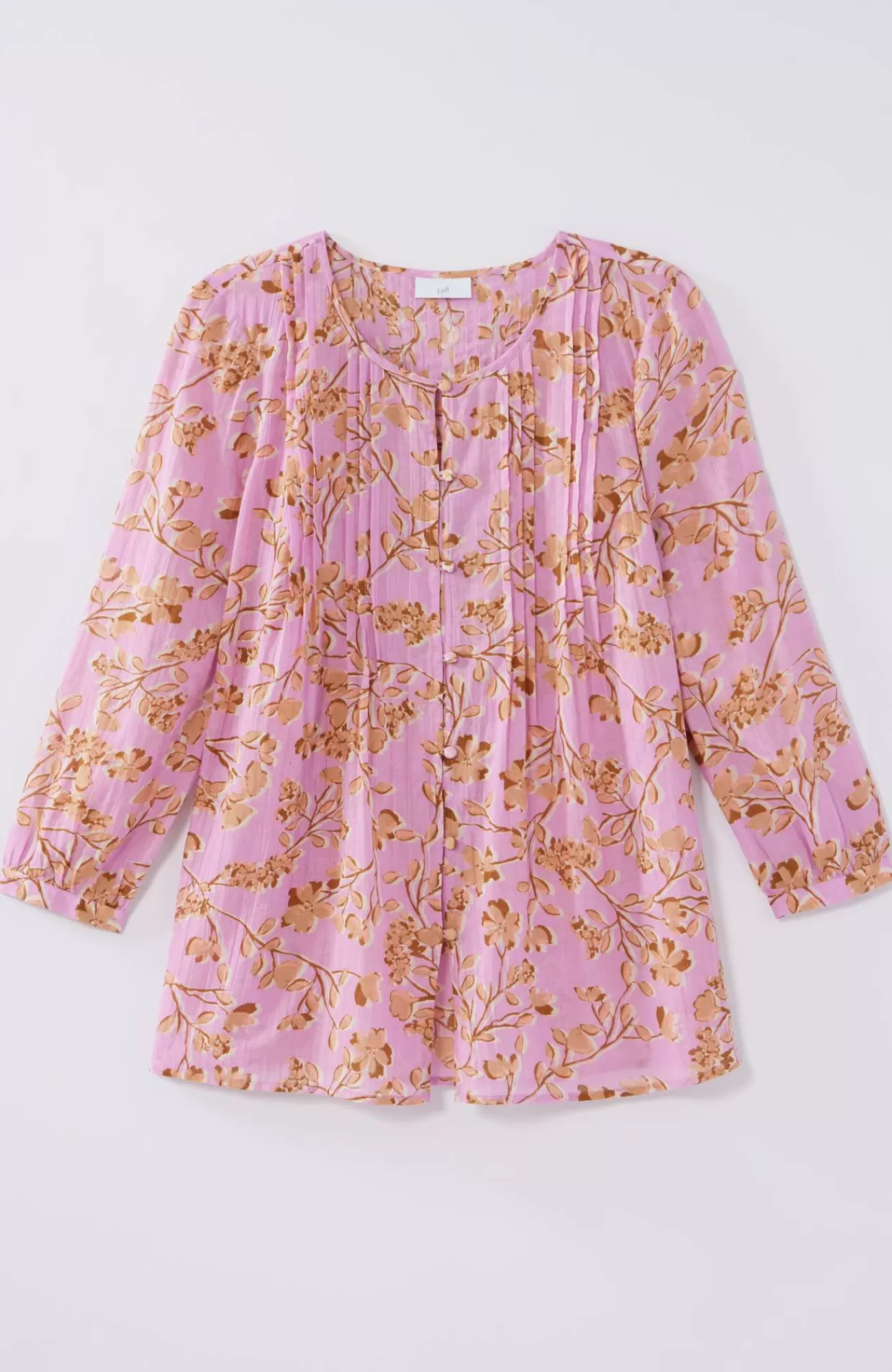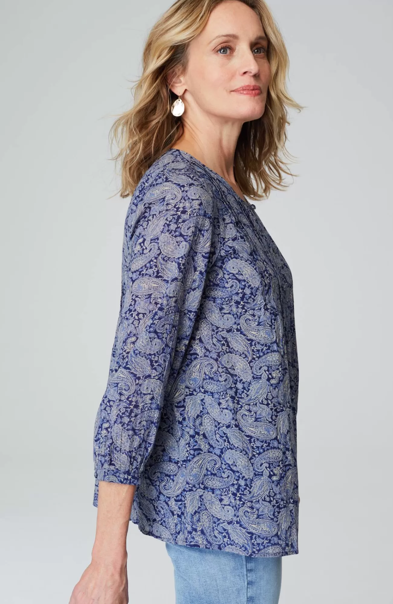 The A-line top, perfected for the season in a supersoft, light cotton, accented with delicate pintucked details and subtly shirred buttoned cuffs. Button-loop closure. Covered buttons.