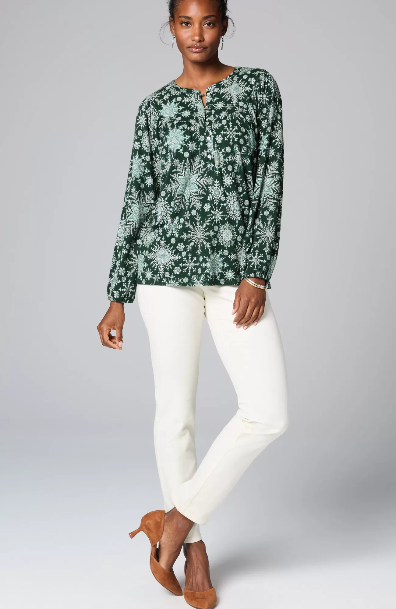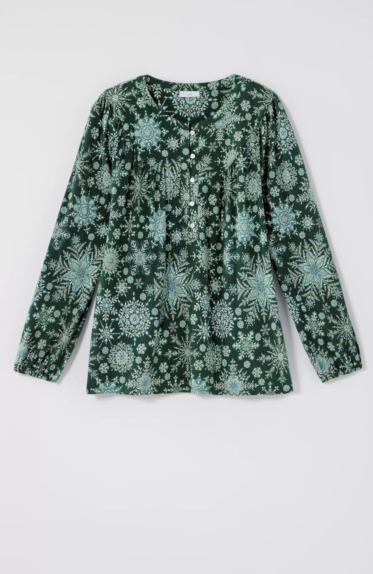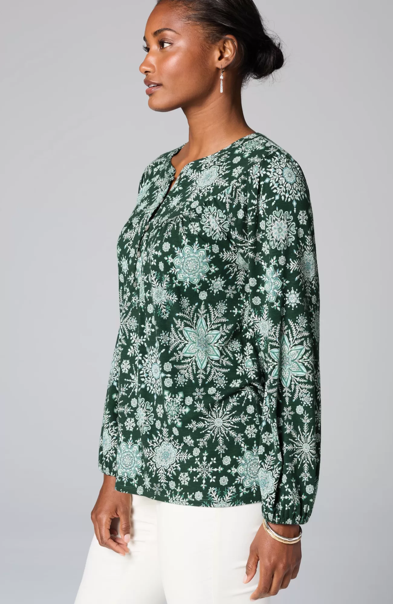 Designed with absolute softness, our snowflake-printed peasant top combines comfort with wintry style. You'll love it with your favorite jeans and cords for an on-repeat outfit. Rounded front and back yoke. Agoya-shell buttons with loop closure at front. Raglan sleeves. Elasticized cuffs.