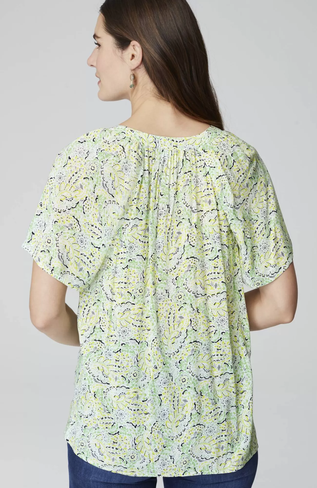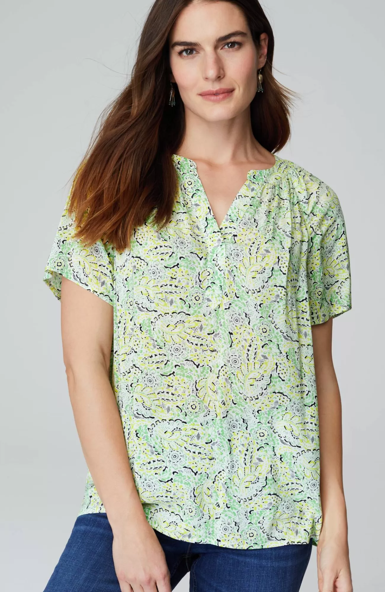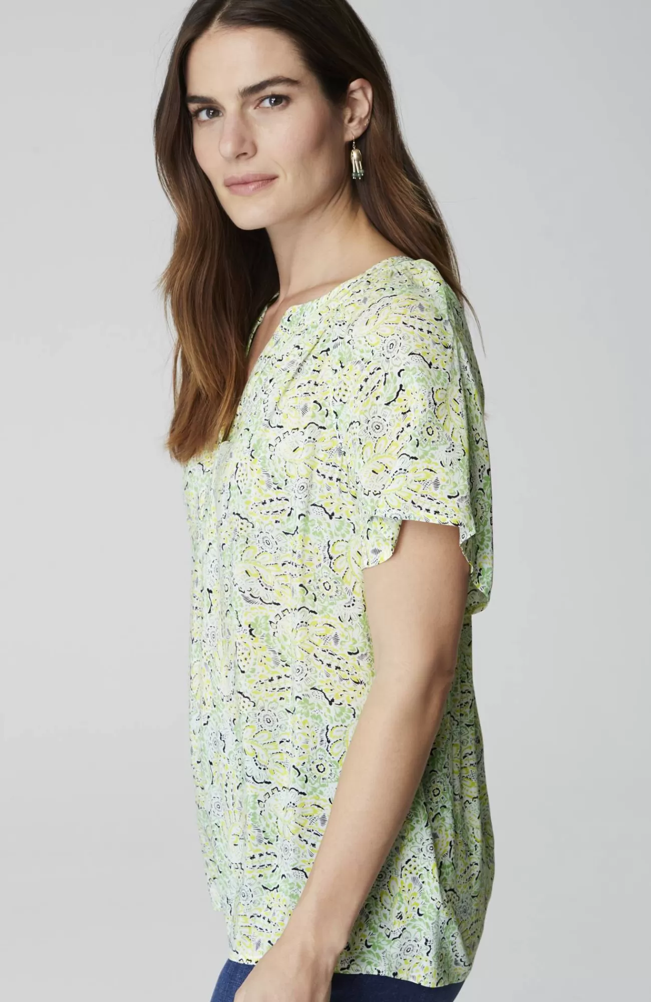 Light, fluttery and essential for spring—our newly designed rayon voile split-neck top, finished in a fresh allover print, with carefree flutter sleeves and subtle shirring at the neck.