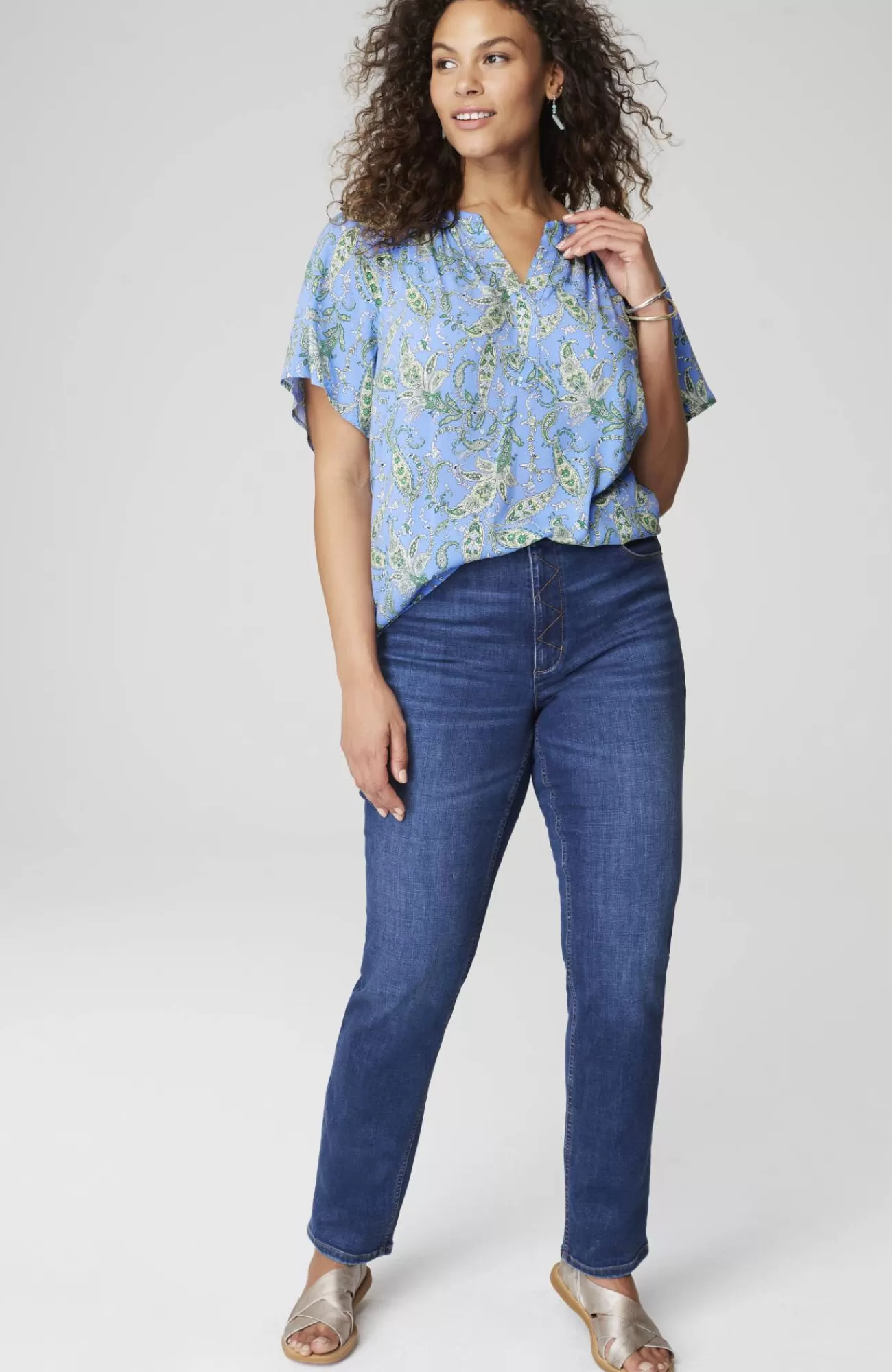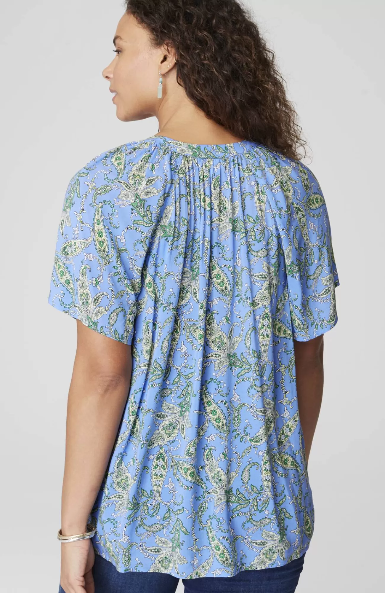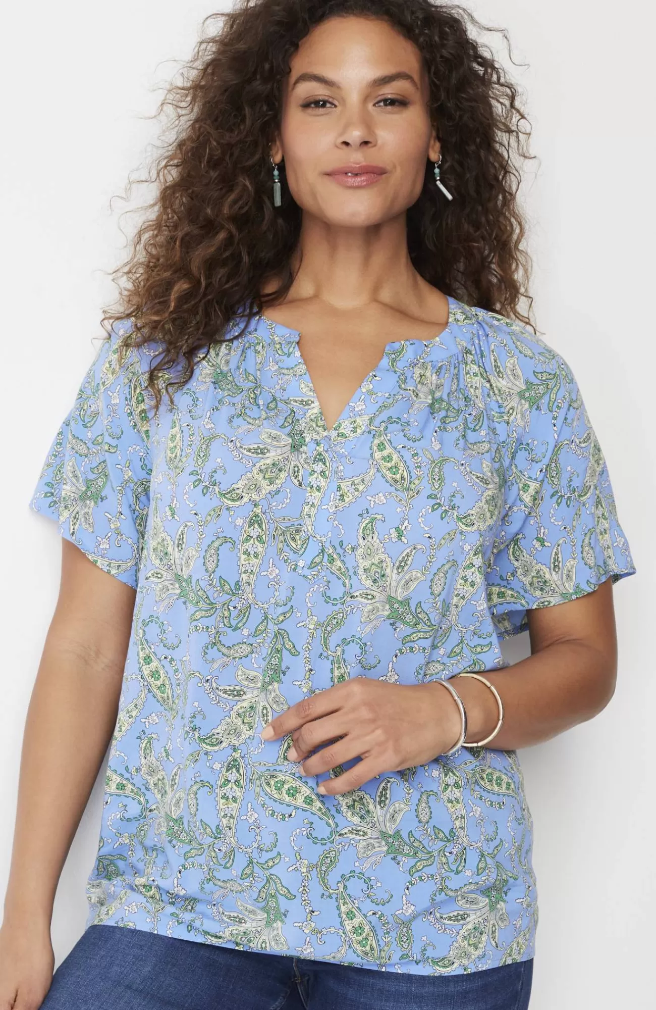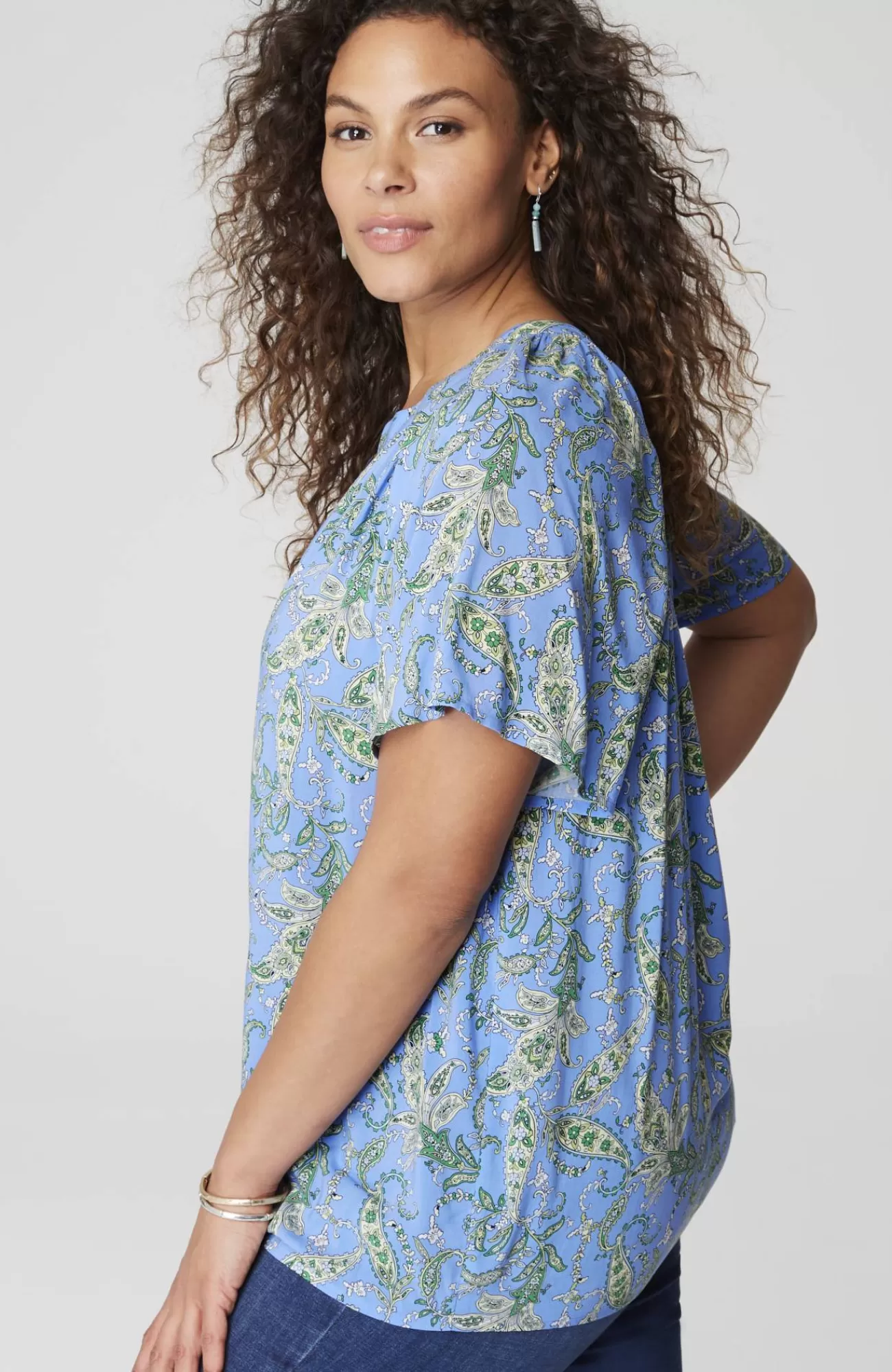 Light, fluttery and essential for spring—our newly designed rayon voile split-neck top, finished in a fresh allover print, with carefree flutter sleeves and subtle shirring at the neck.