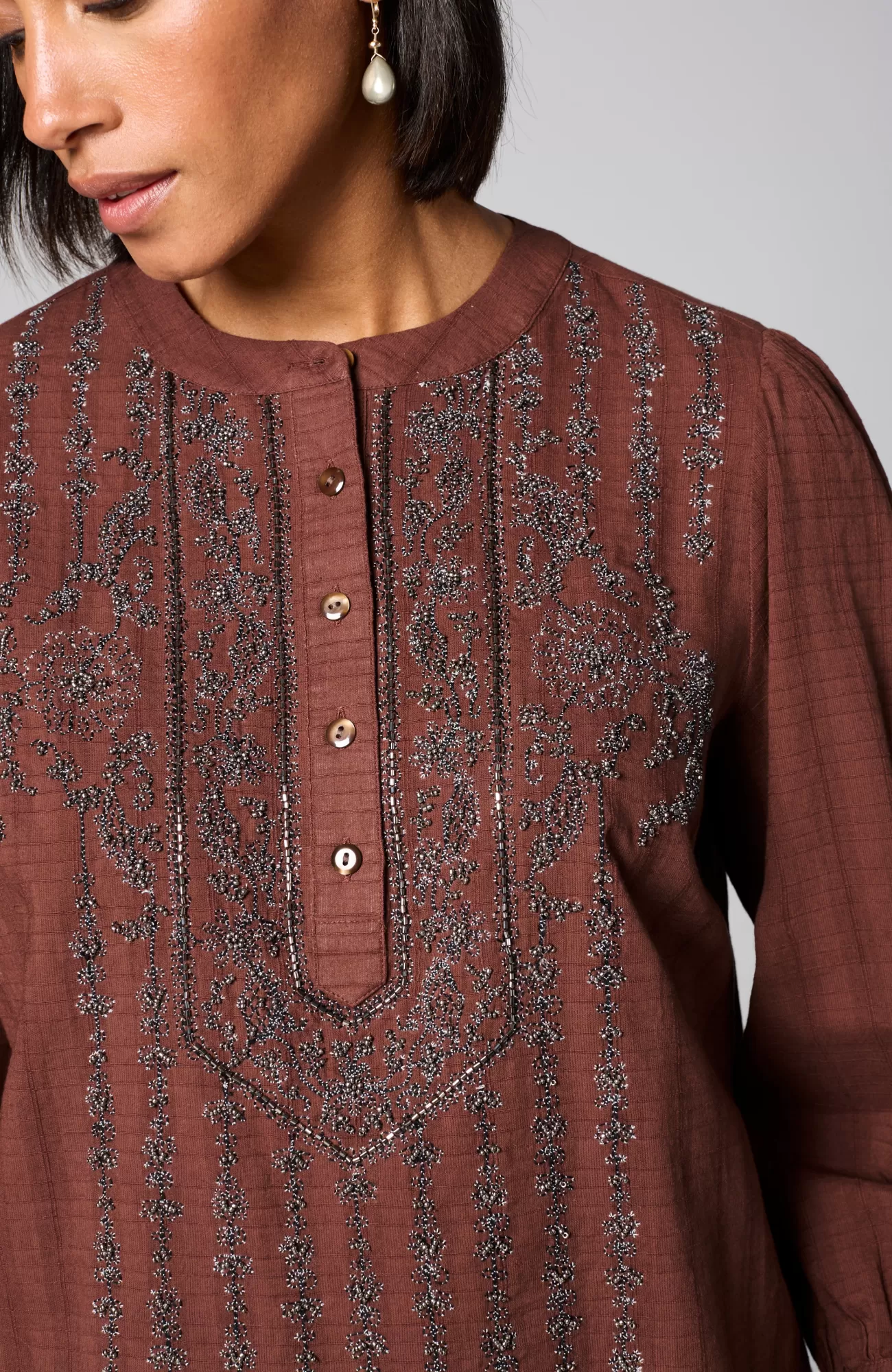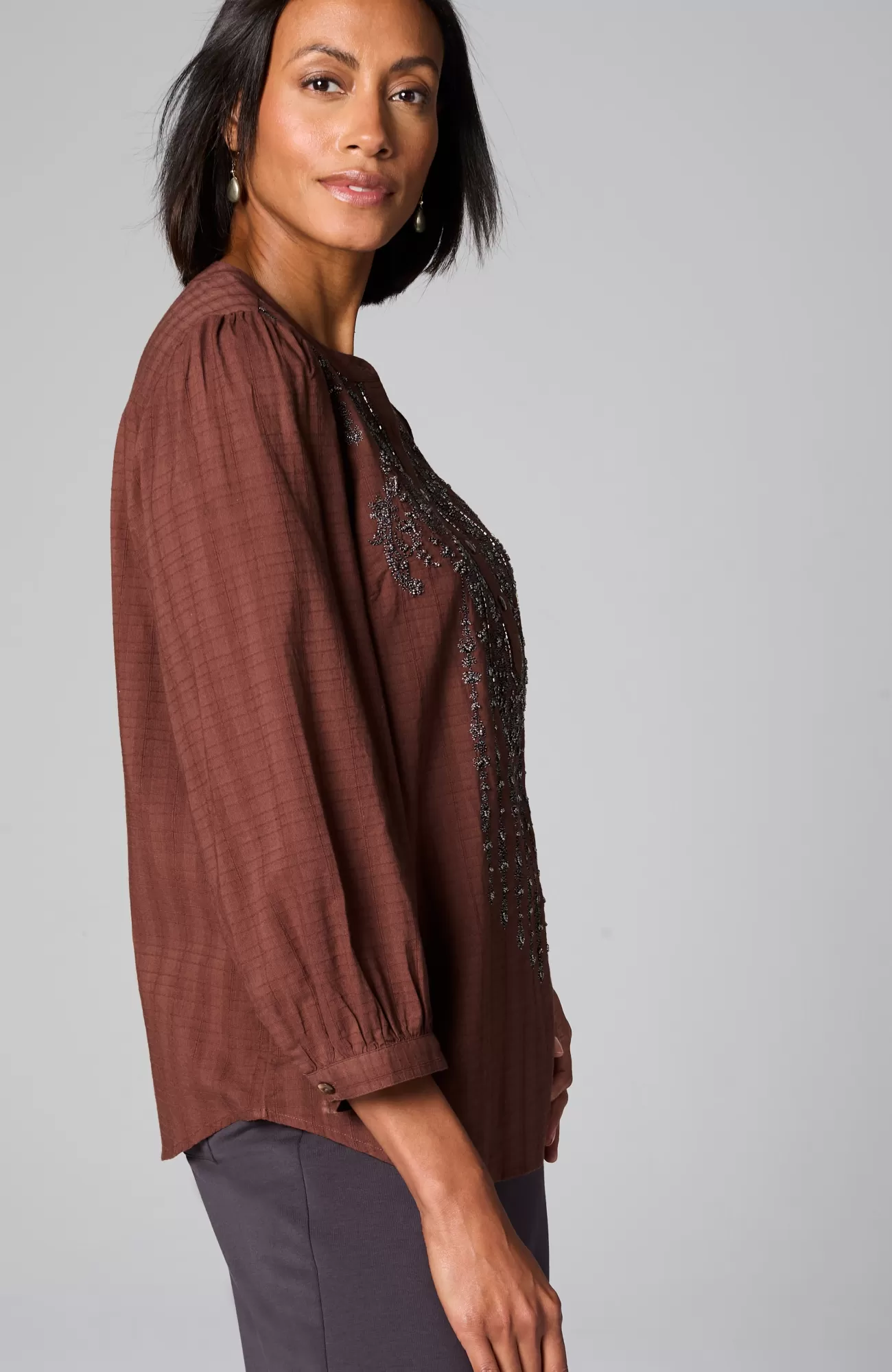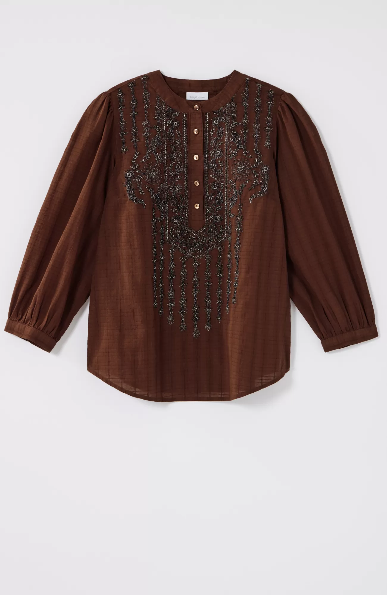 Exclusively part of our limited-edition Pure Jill Elements Collection. We love how the soft and easy texture of this cotton top contrasts with the ornate embroidery featuring shimmering seed beads. Functional trocas-shell buttons add a touch of extra luster. Button-tab cuffs.