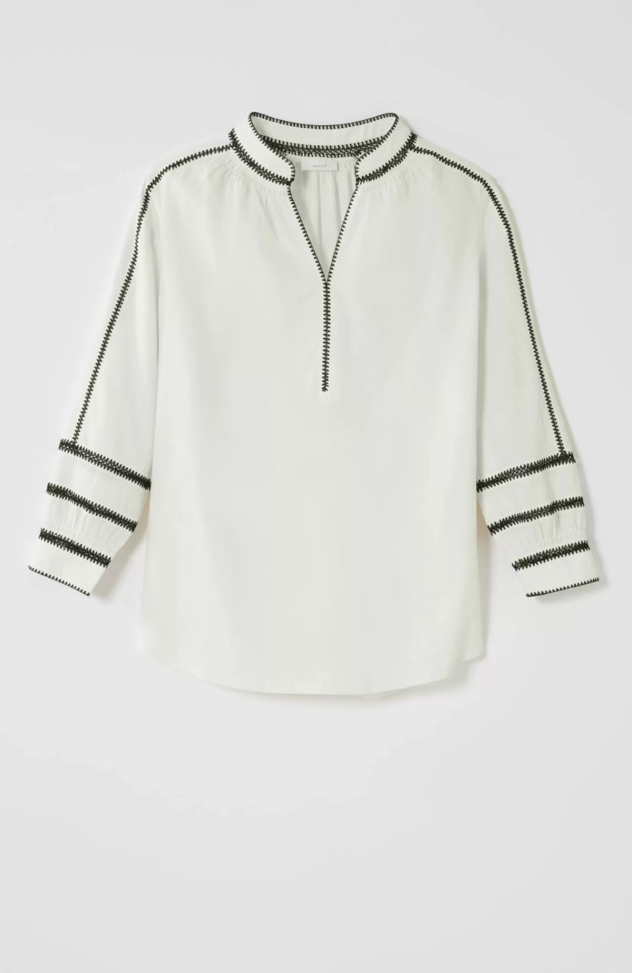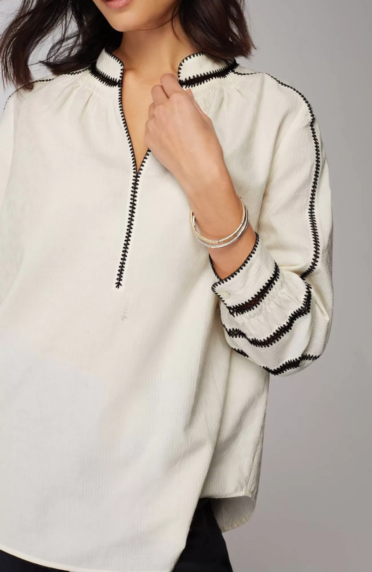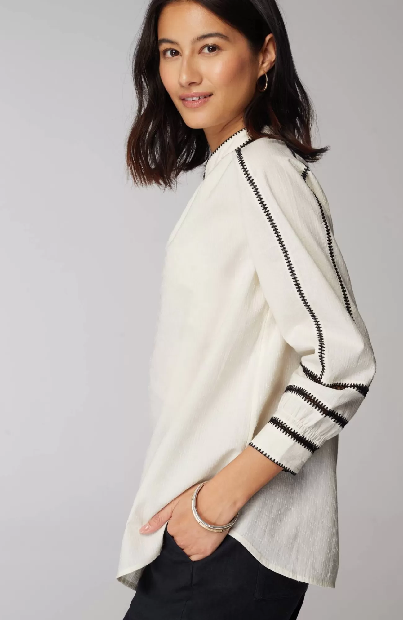 Every style deserves something special, so we gave this airy top open stitchwork that decorates the seams with intricate crisscrossed threads. Trocas-shell buttons finish the cuffs.