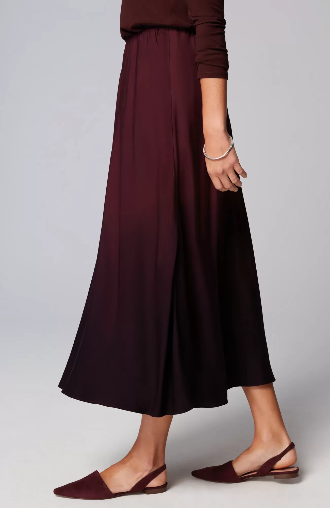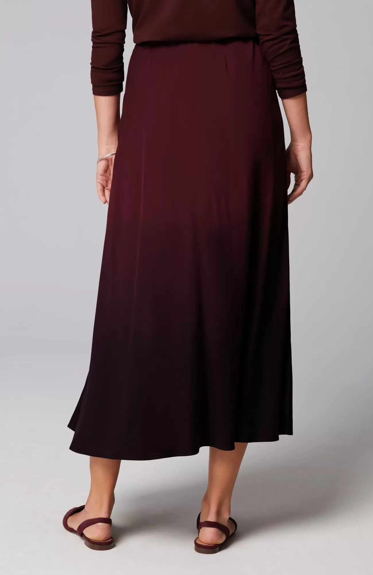Our satin A-line pull-on skirt is a showstopper with a bold ombré design. We gave it a magic waistband (simultaneously secure and smoothing) and back darts for the most figure-flattering fit. You can feel good about wearing this style because it contains LENZING™ ECOVERO™ fibers. The manufacturing of LENZING™ ECOVERO™ Viscose fibers generates up to 50% lower emissions and water impact compared to generic viscose. Unlined.