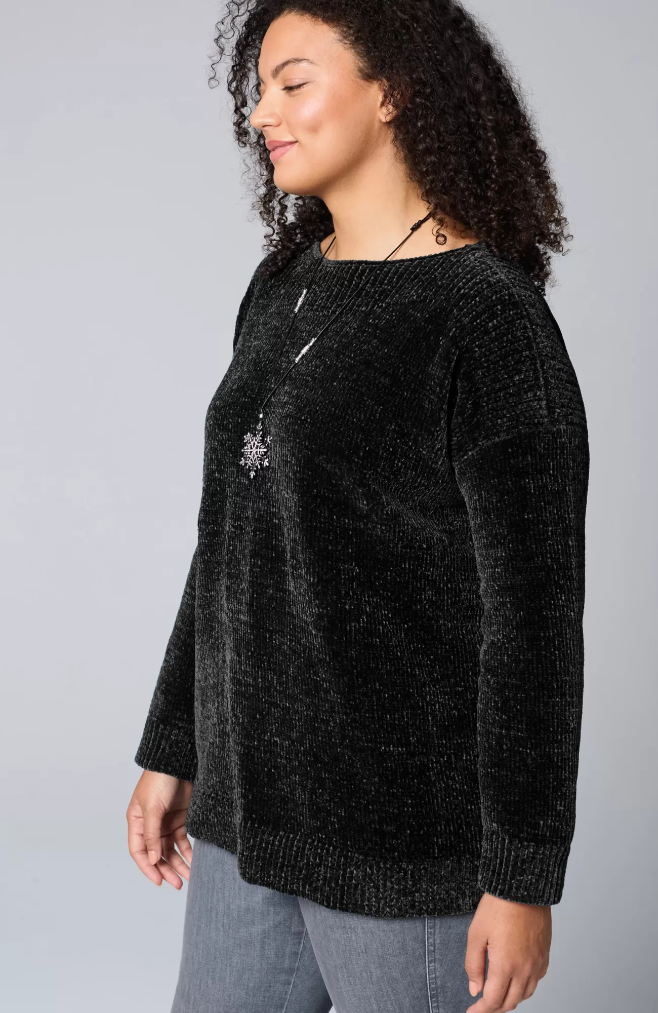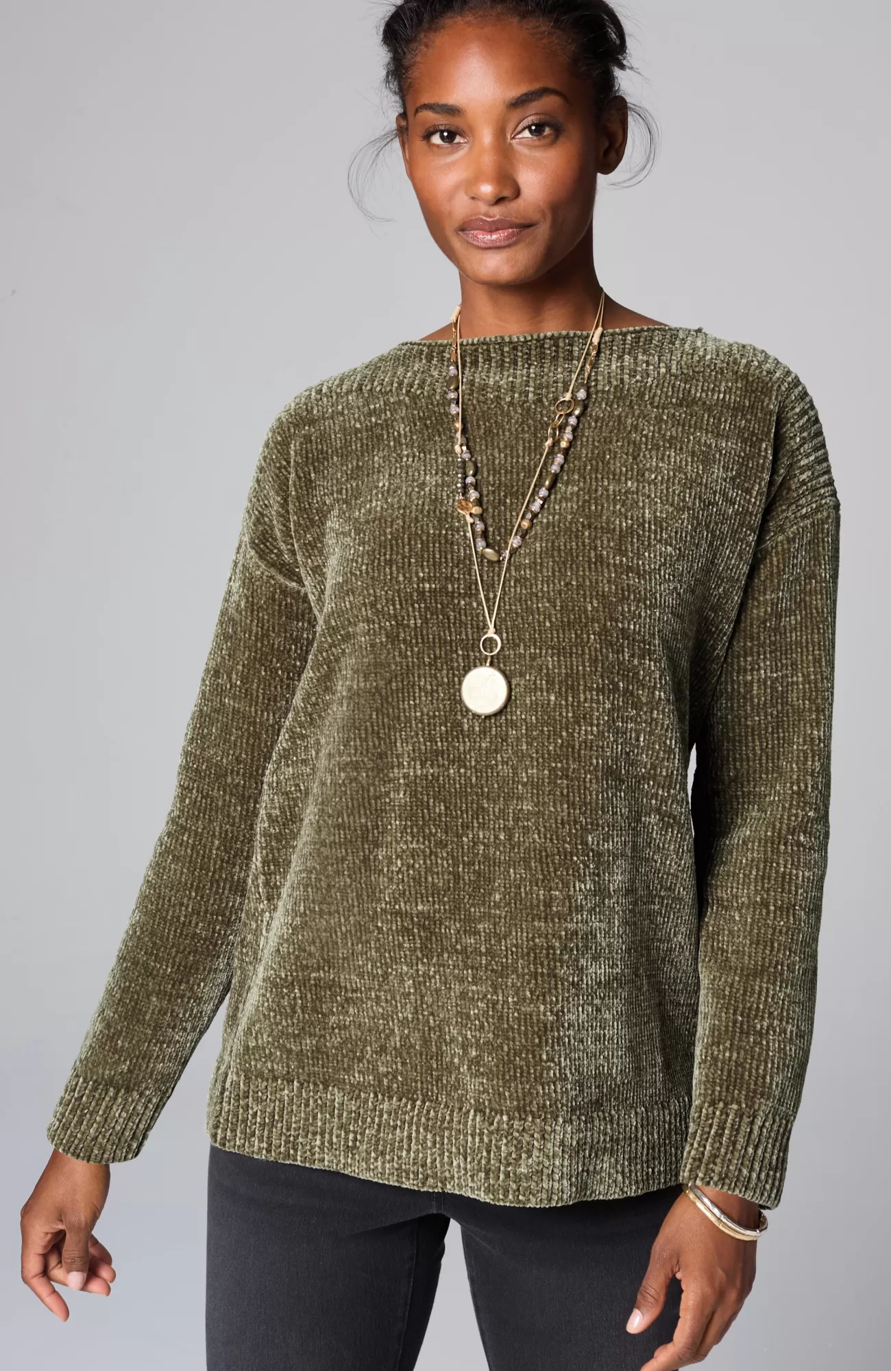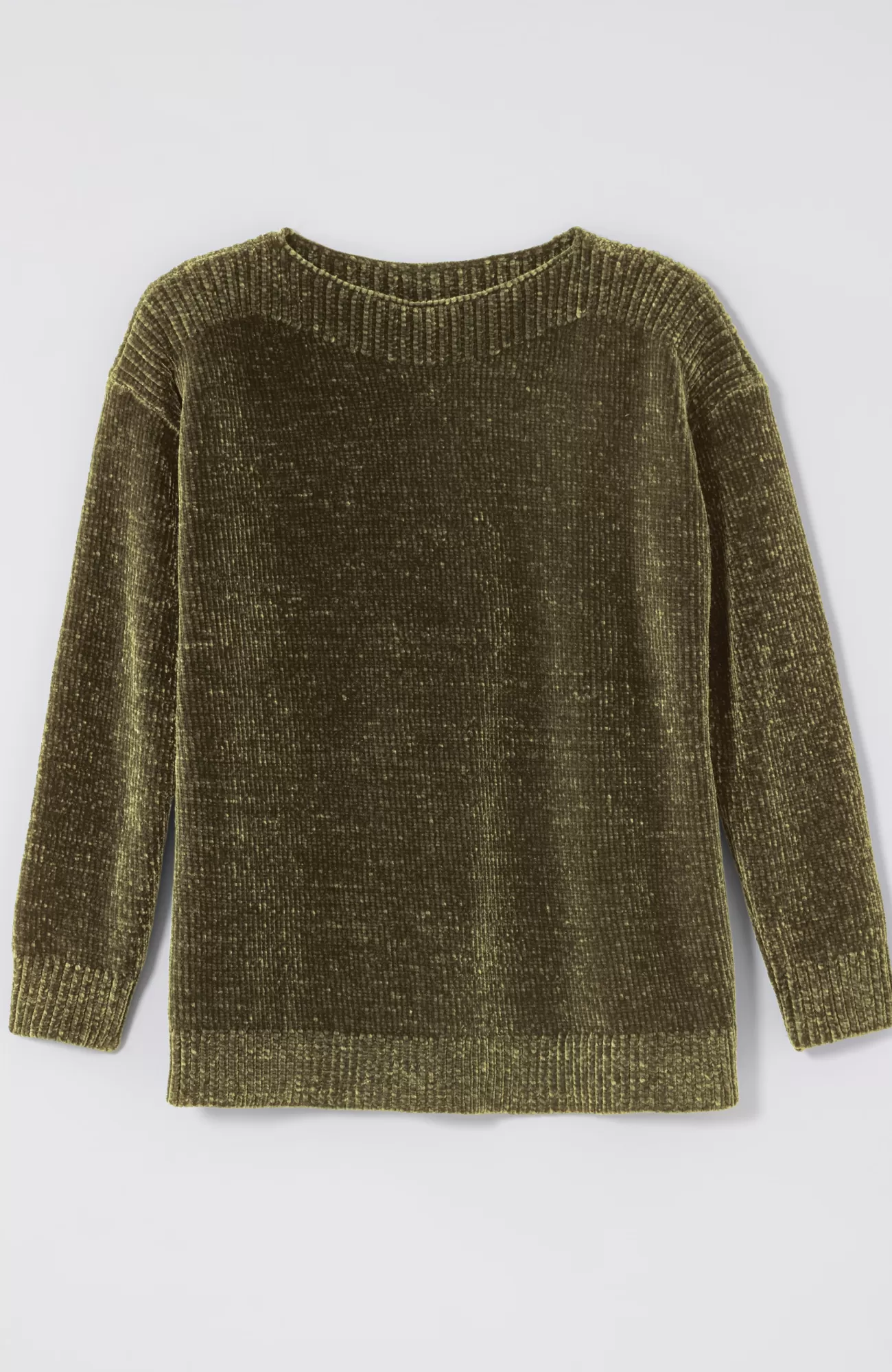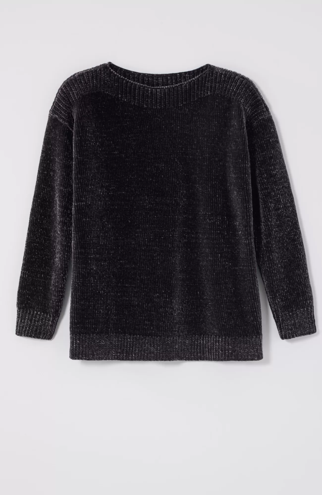 Sumptuous chenille gives this pullover softness that can be seen and felt and a beautifully subtle sheen. We also love how the ribbing at the yoke complements the flattering boat neckline. Finished with ribbed cuffs and hem.