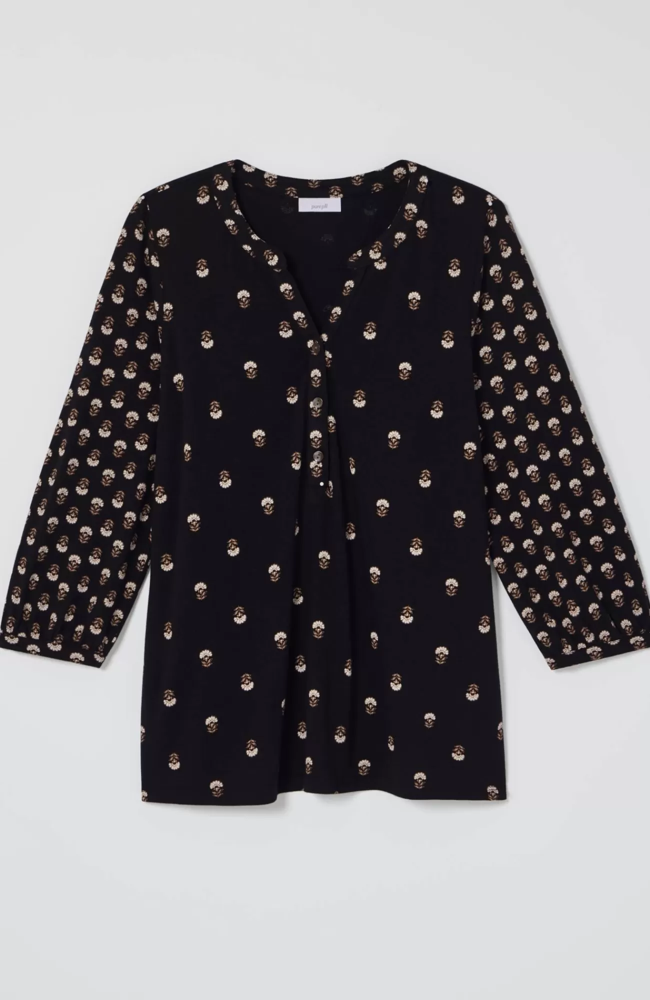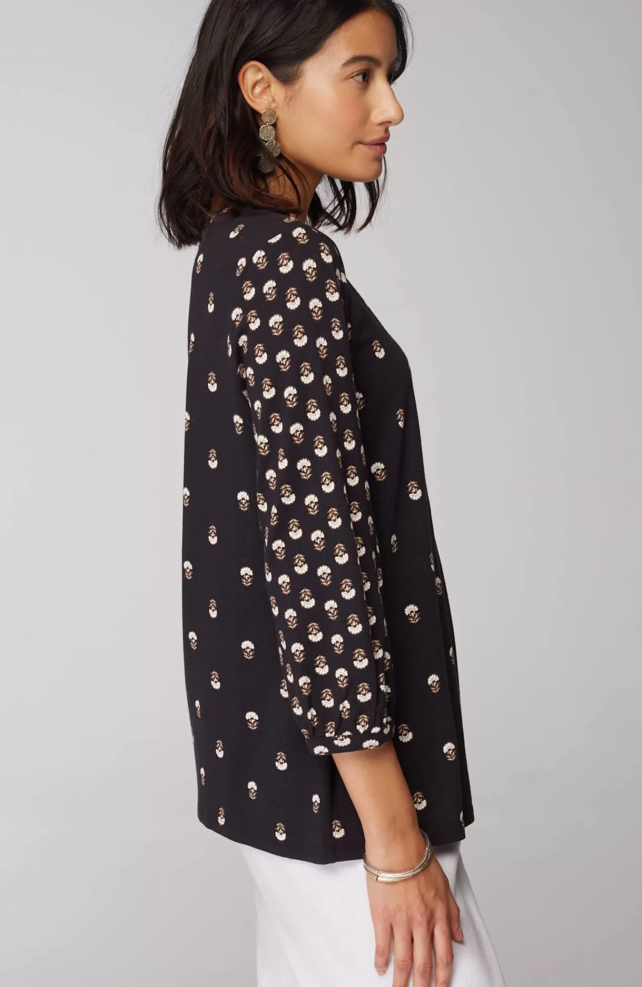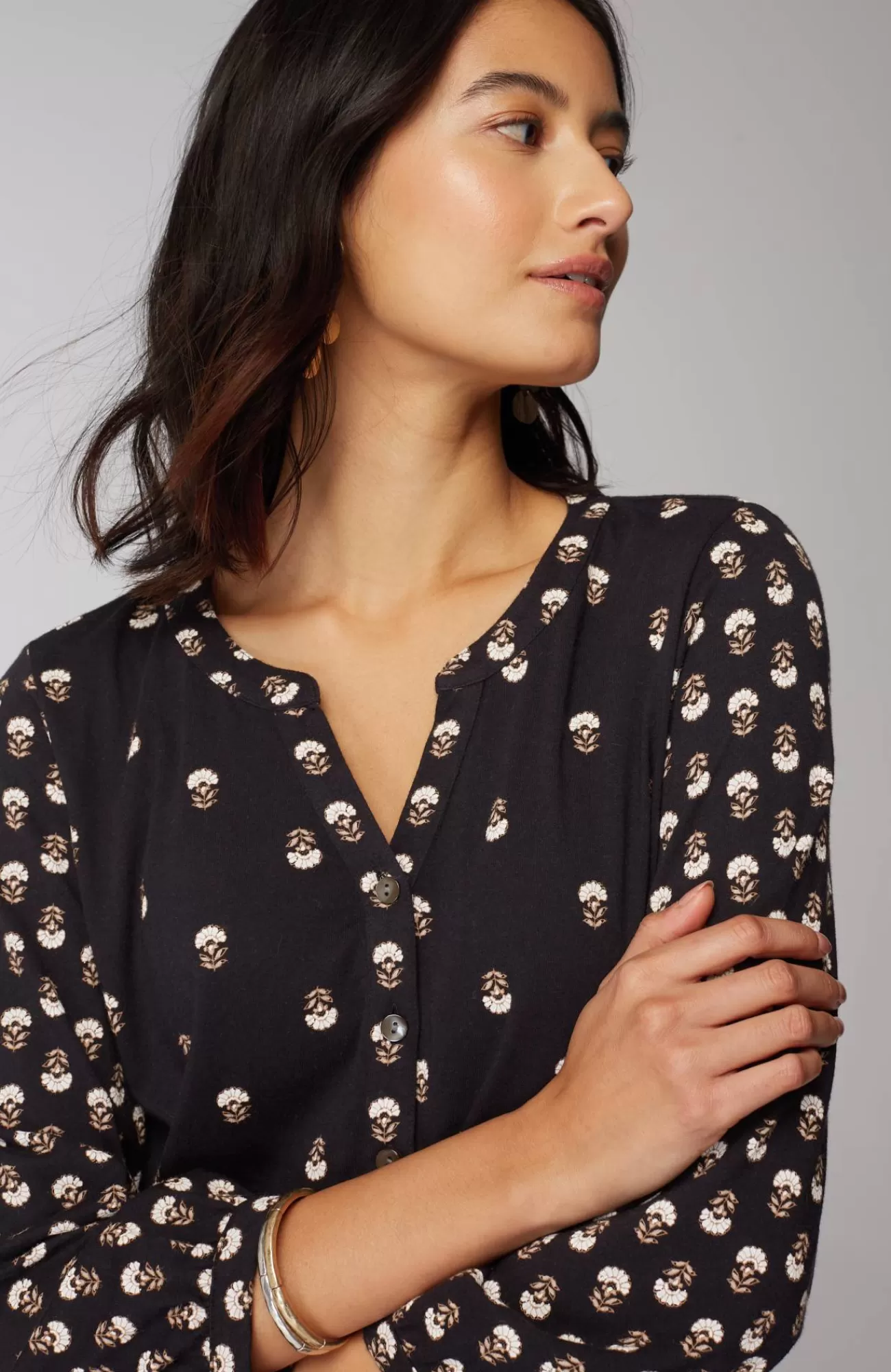 The elegant printed top for every day: crafted from an airy, lightweight cotton blend, with soft shirring and trocas-shell buttons at the split neckline.