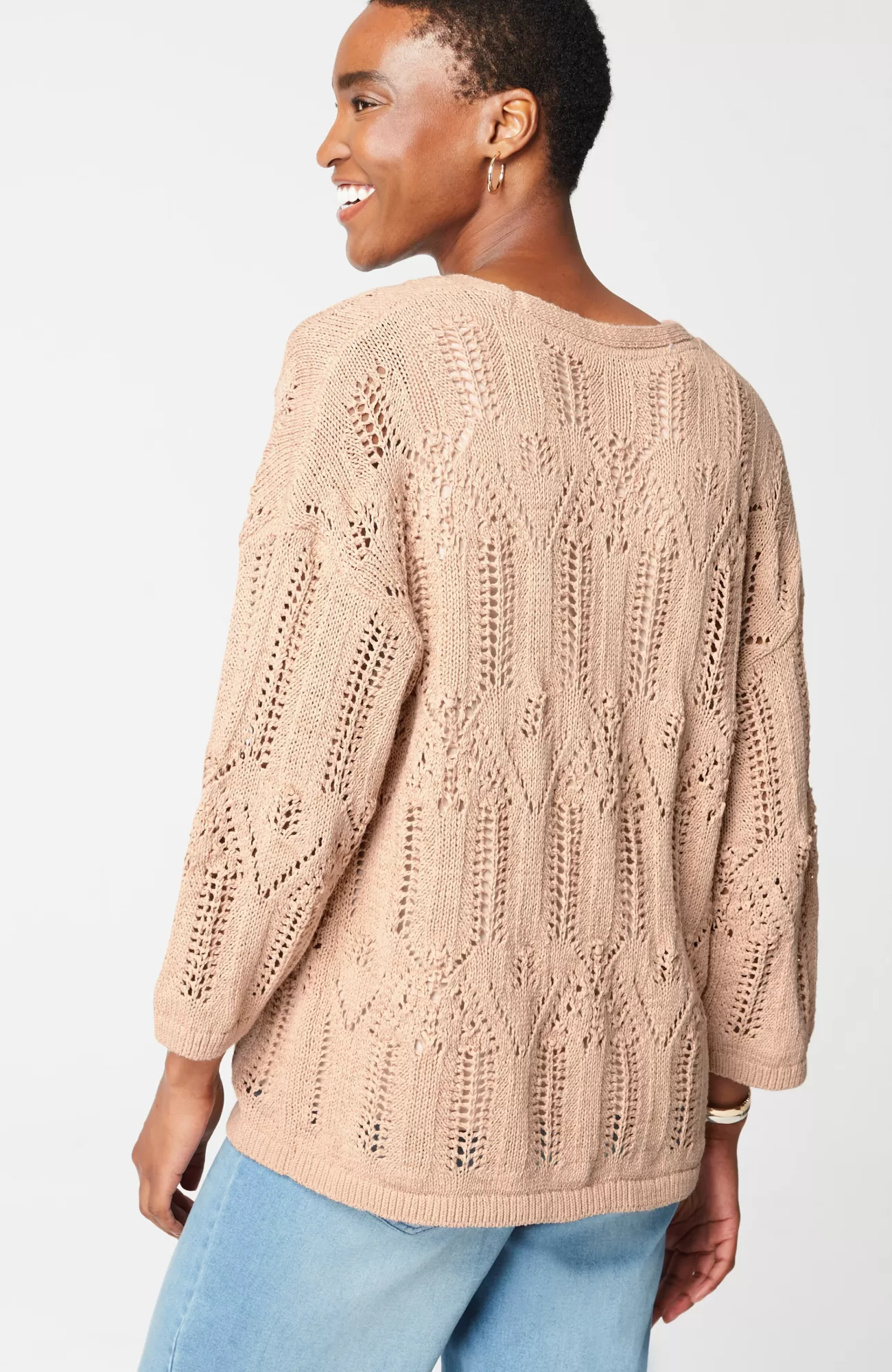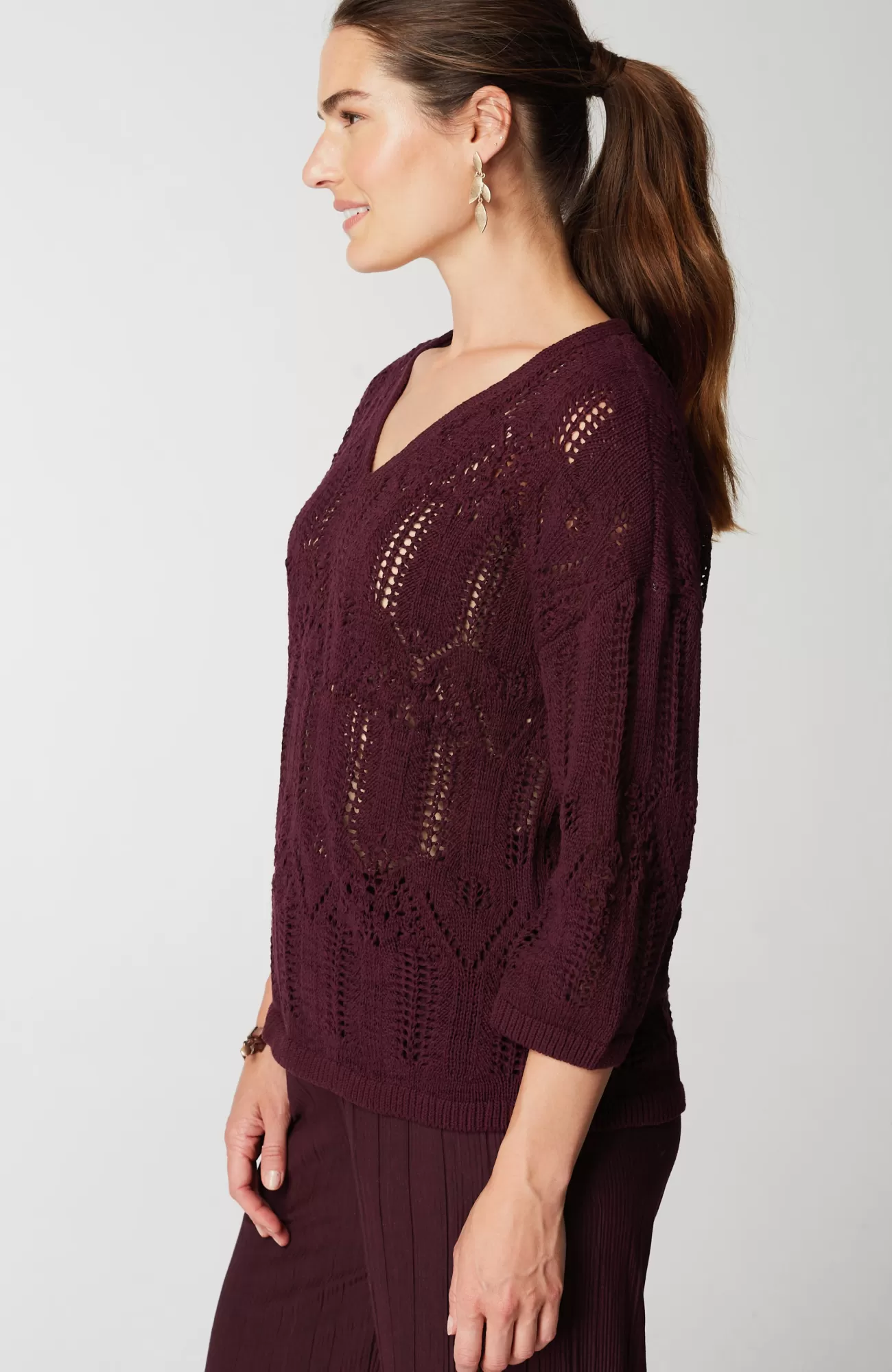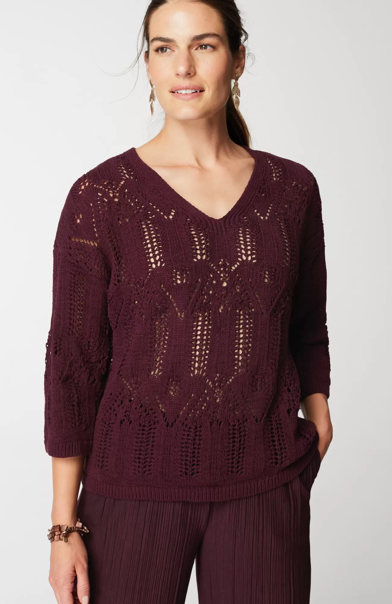 Exclusively part of our limited-edition Pure Jill Elements Collection. Our elegant V-neck sweater features a fine lace knit crafted from a rich cotton blend. The open texture makes it an ideal transitional piece—we recommend pairing it with our Pure Jill Layering Tank. Ribbed neckline, cuffs and hem.