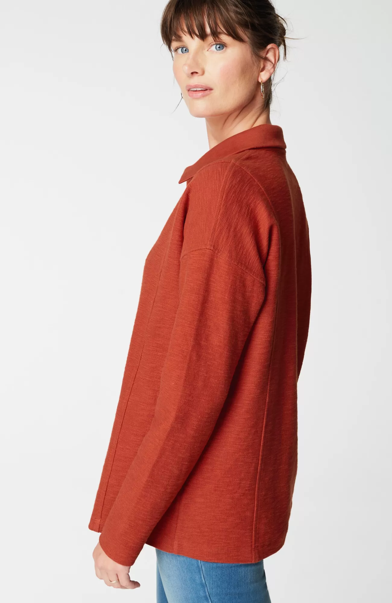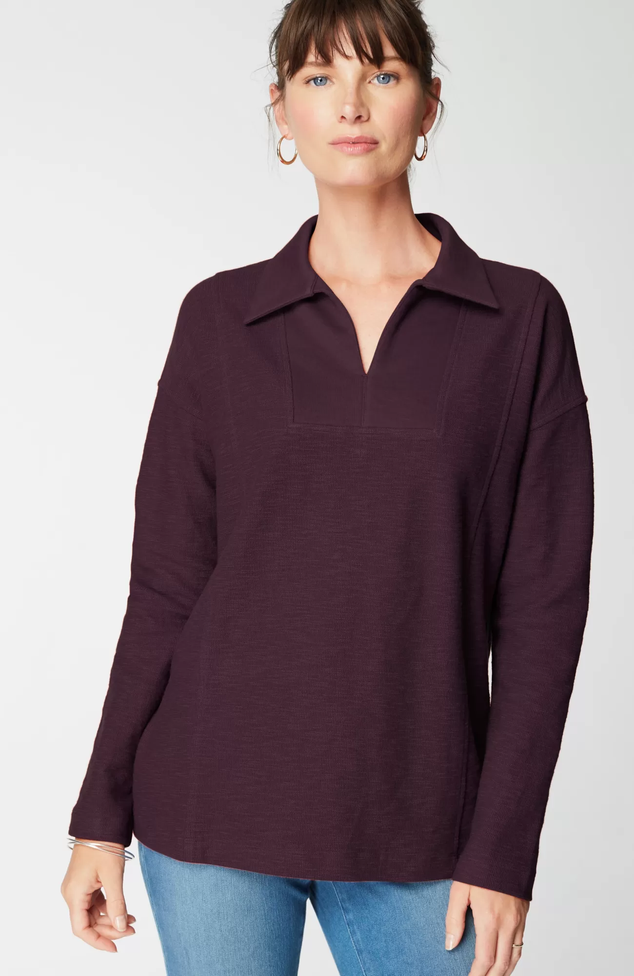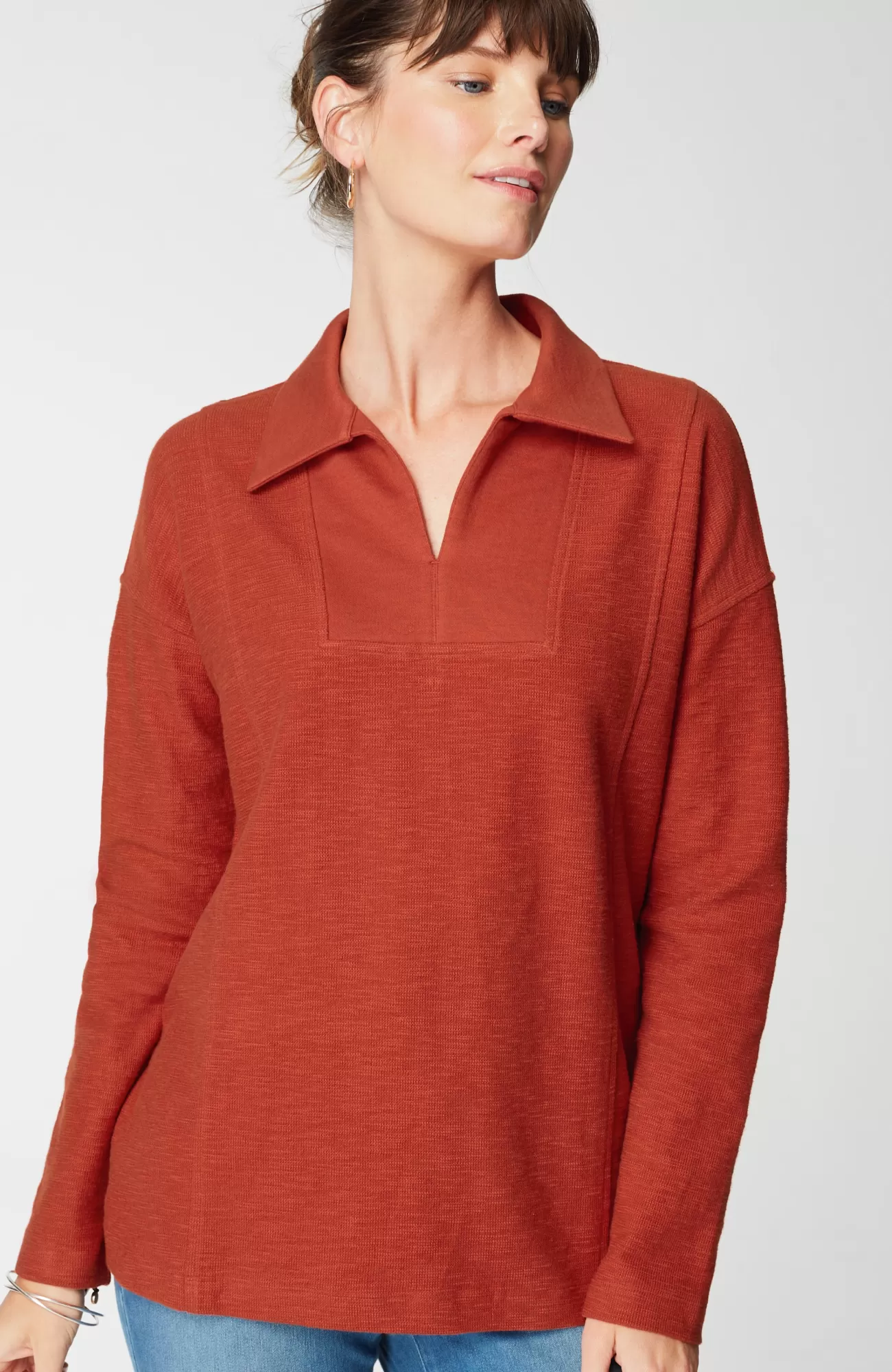 All the “it” factors you look for in a top: sumptuously soft fabric, a relaxed fit with princess seams for subtle structure, and an easy-to-style pullover design. We love the fold-over collar and split neck too—it gives this comfy piece an extra bit of polish.