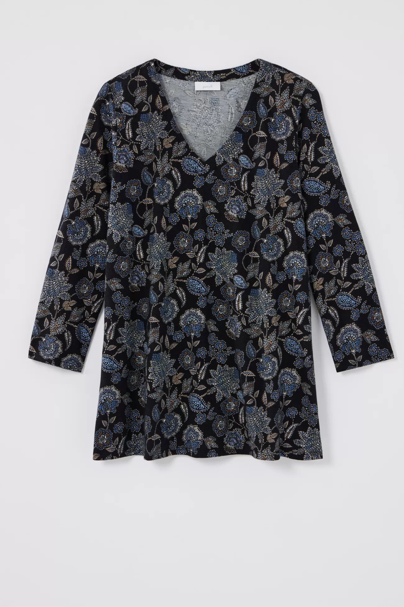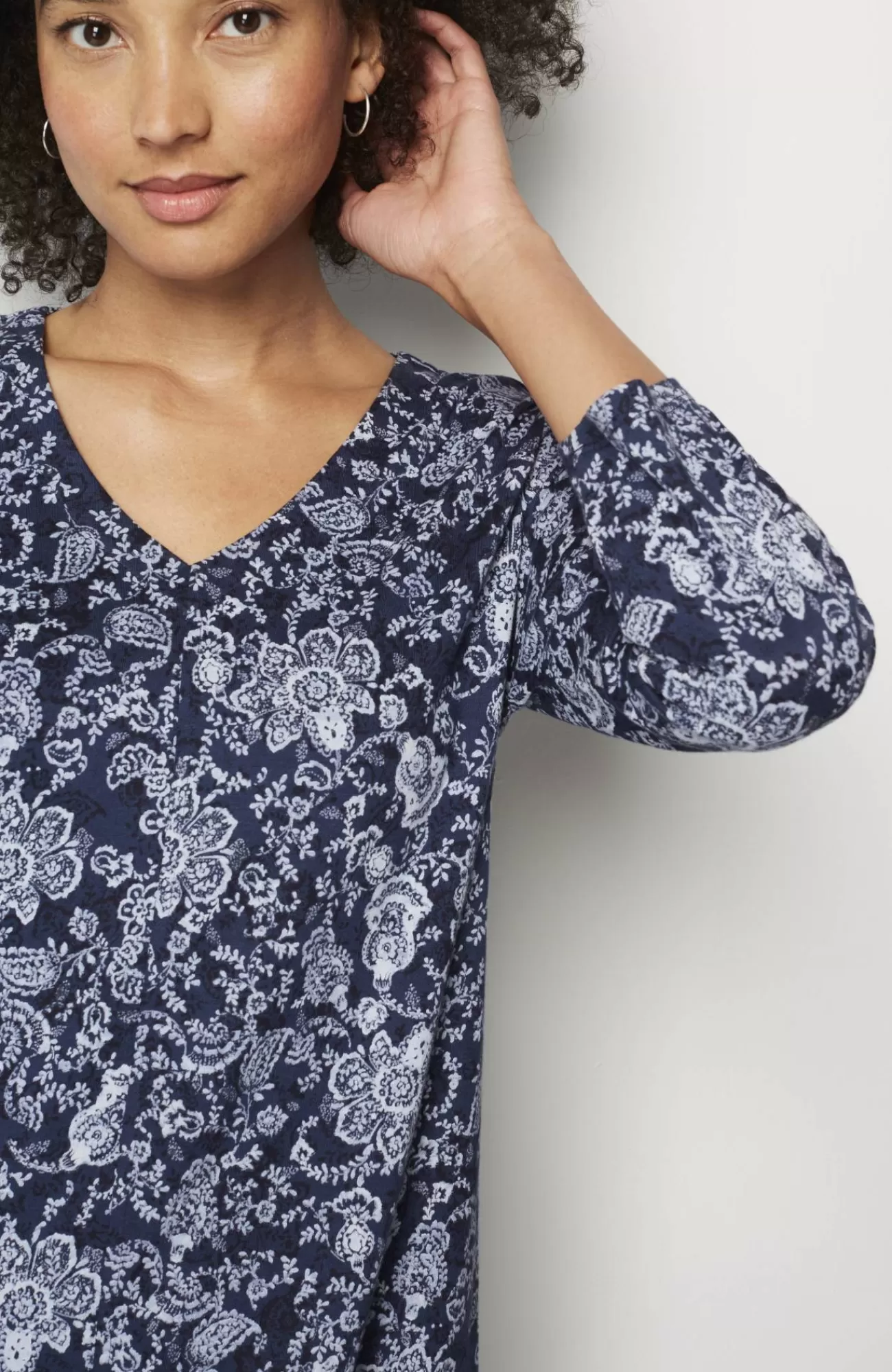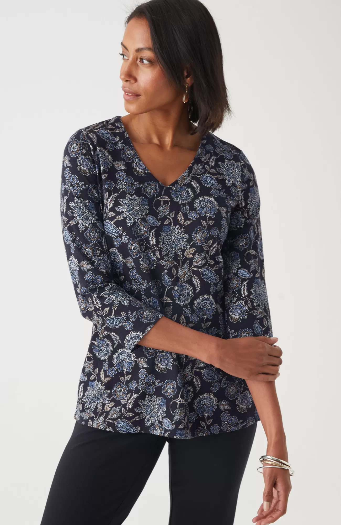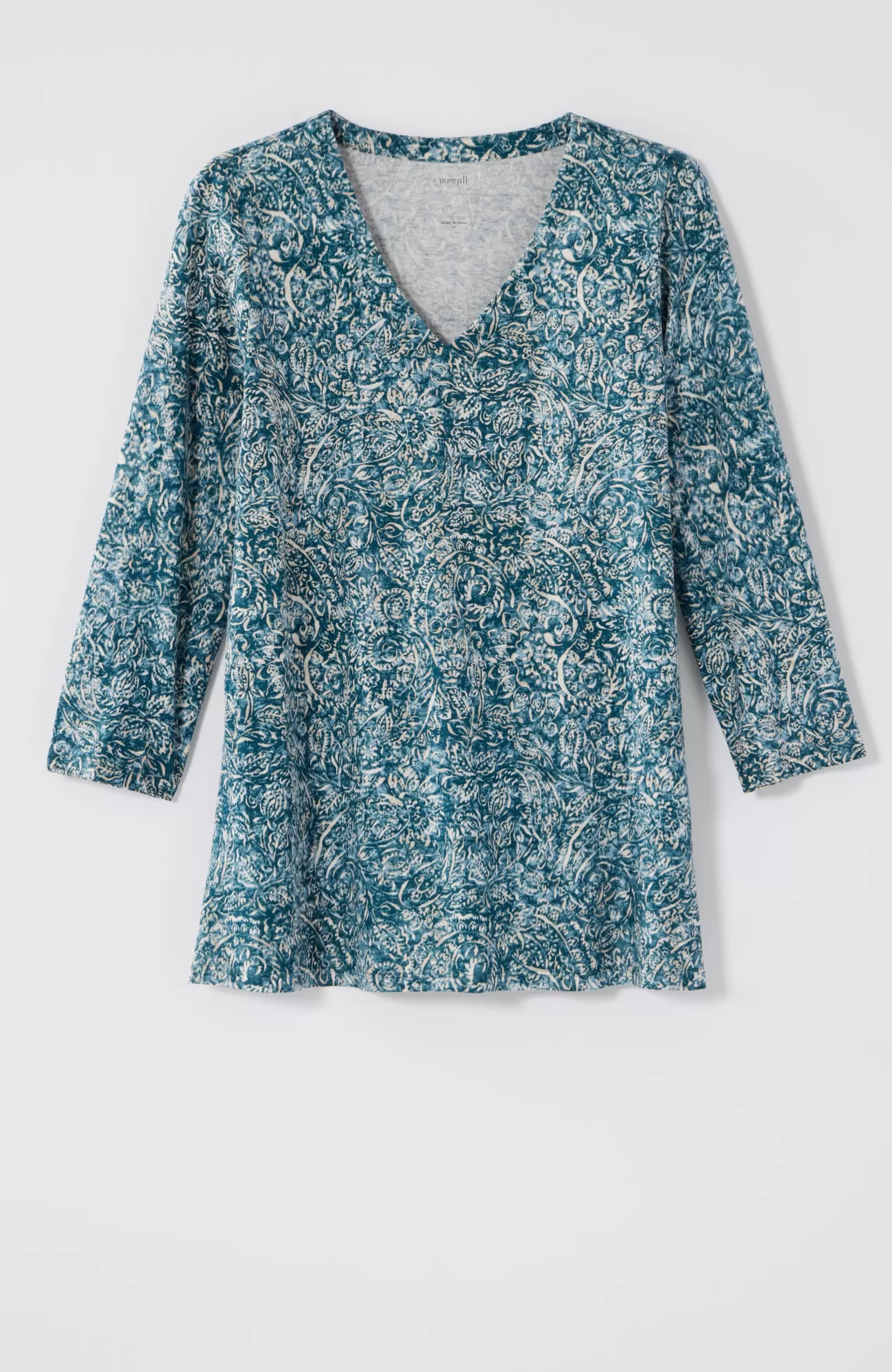 Designed in 100% cotton, our V-neck tee is a comfortable essential with an easy A-line shape. You'll wear it again and again, on its own or layered under a cardi or jacket. Center front and back seams.