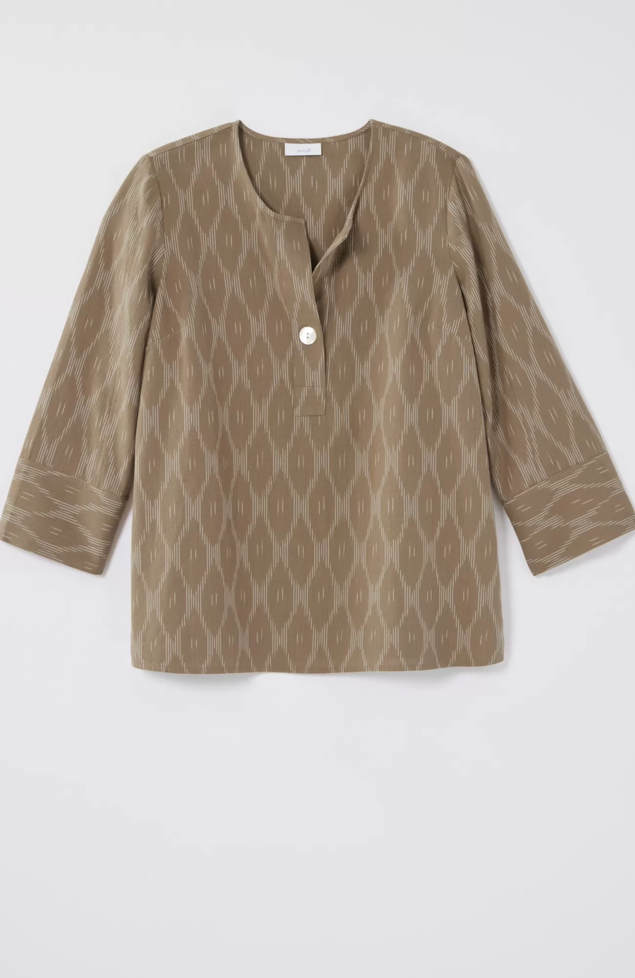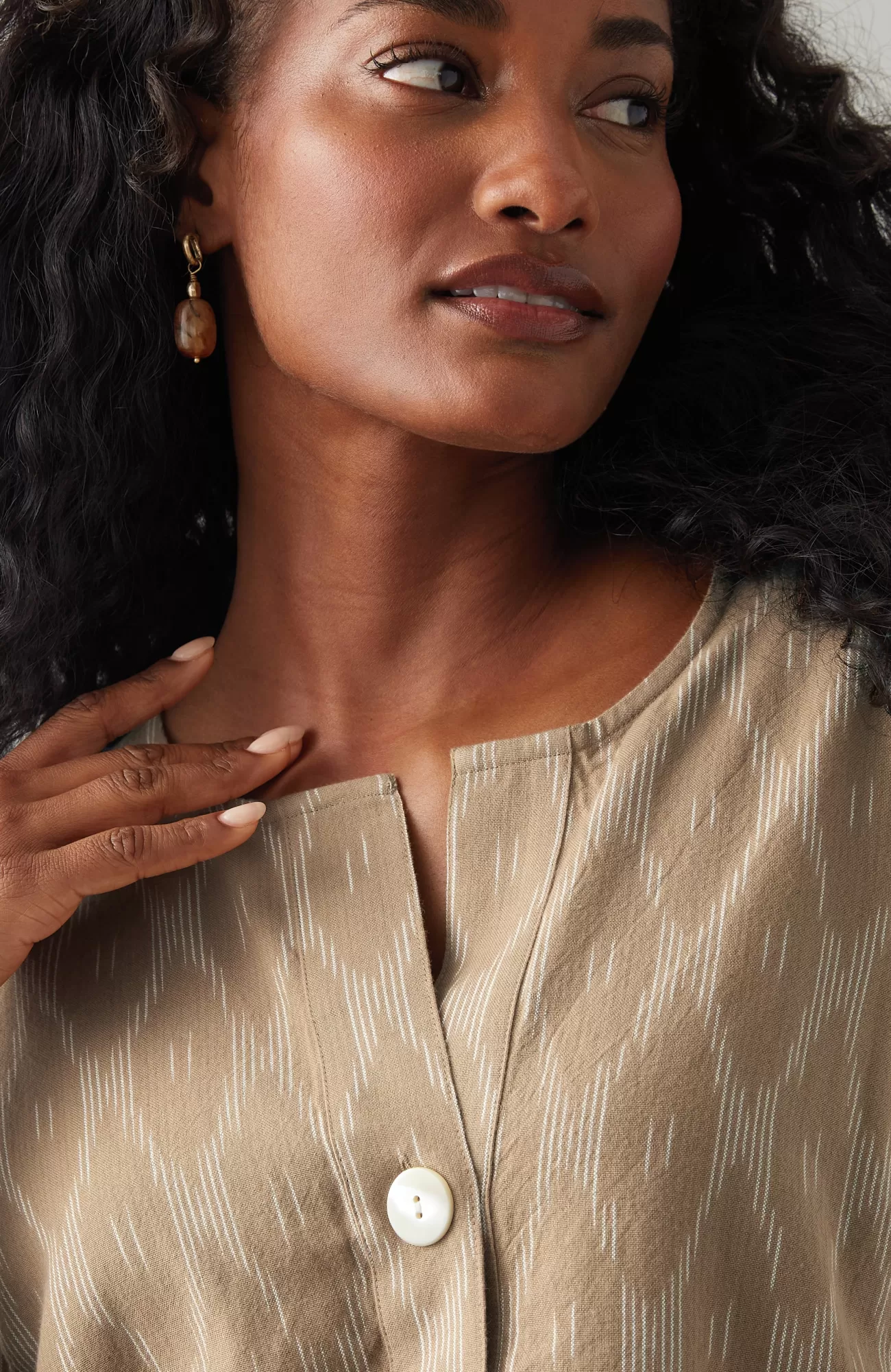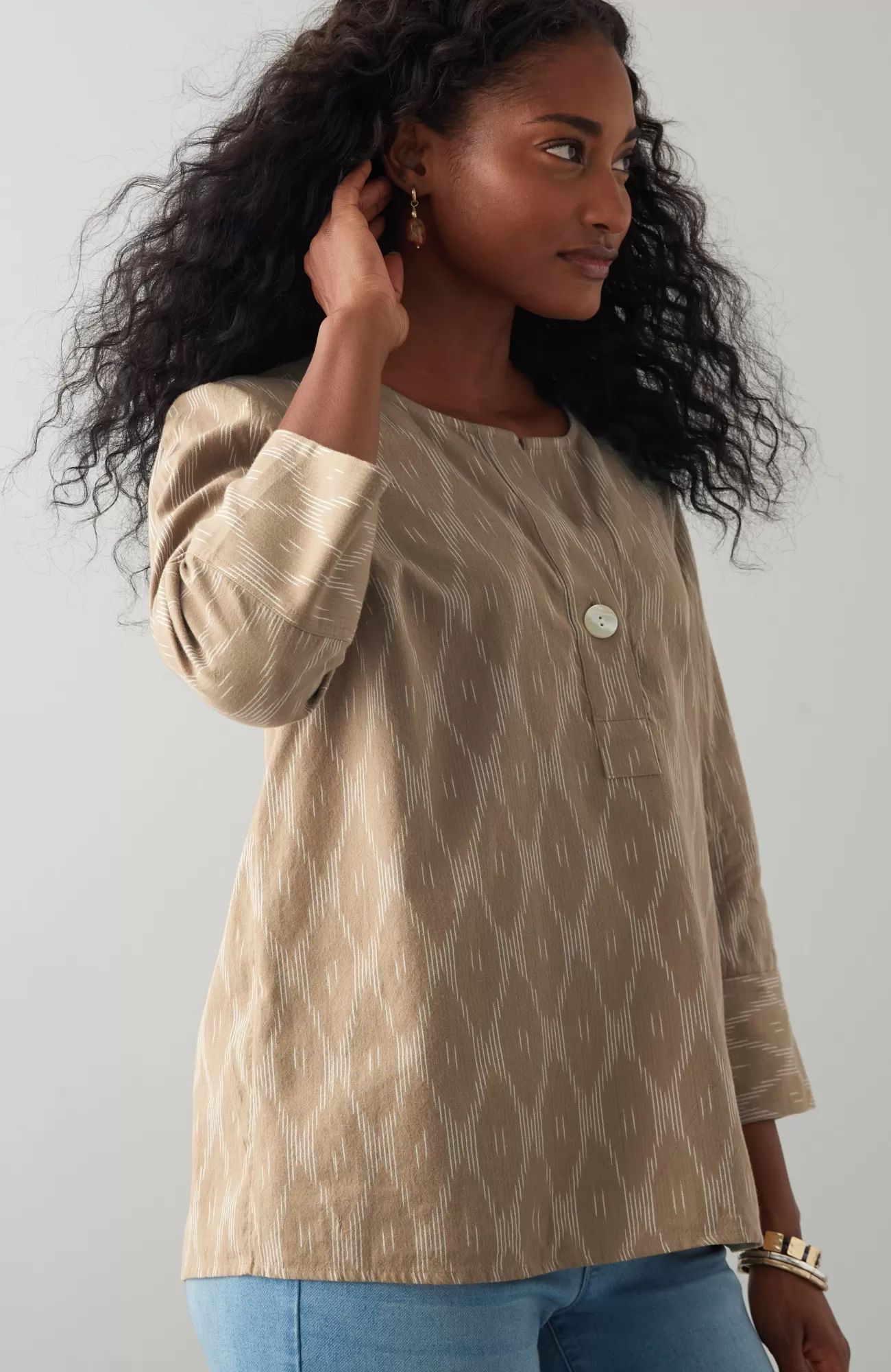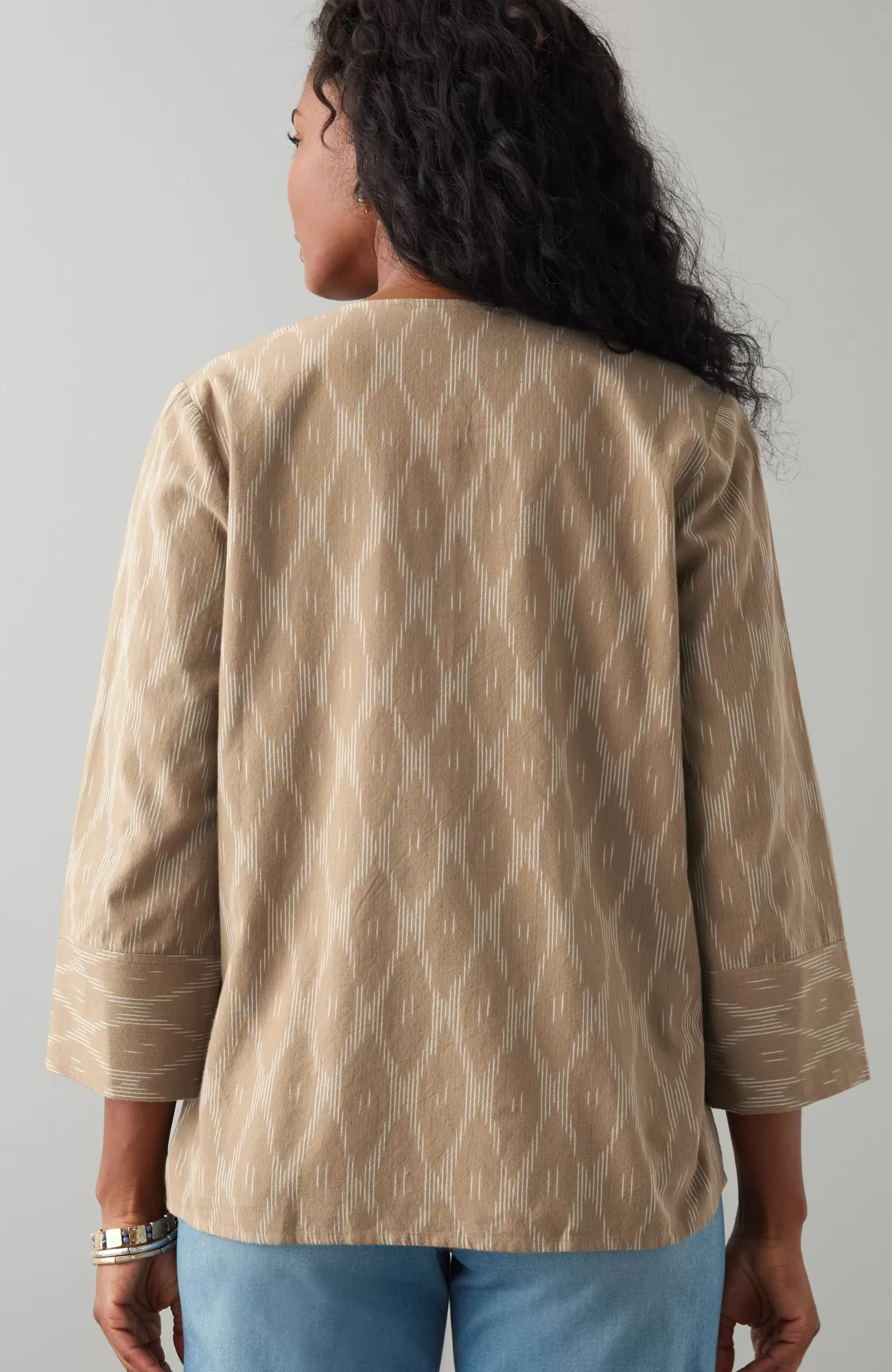 You’ll look forward to reaching for this top because it’s one of a kind—the genuine ikat design was woven on a loom so each piece is unique. Designed in a neutral shade that pairs with everything.