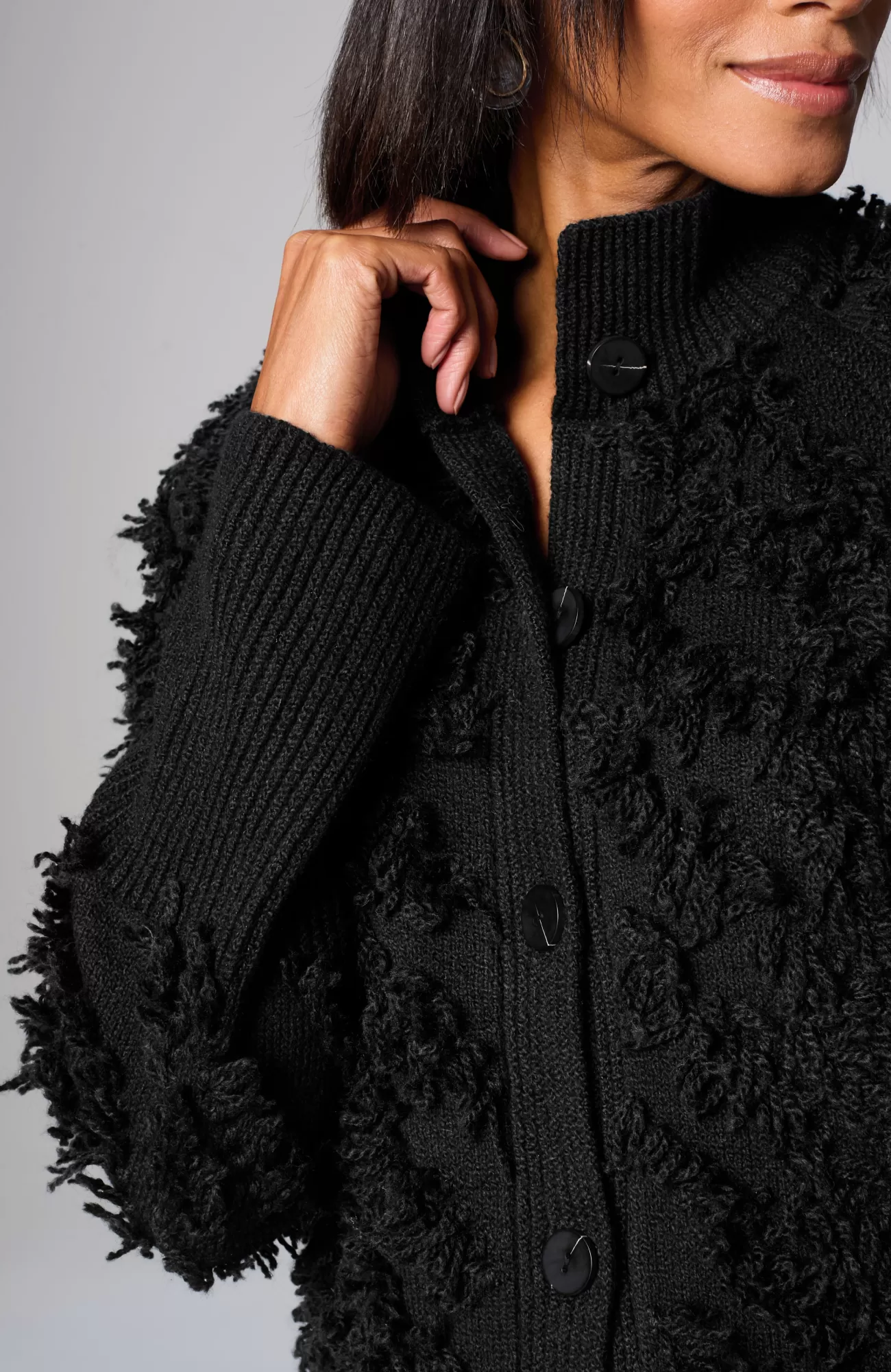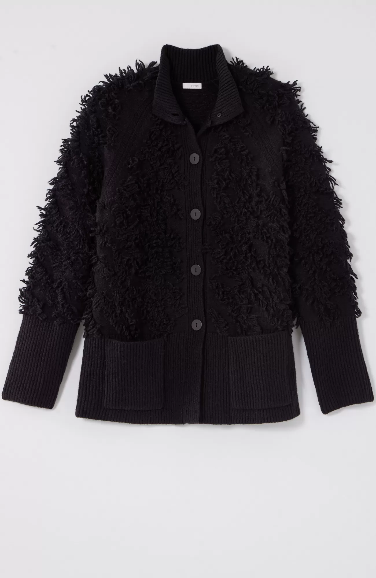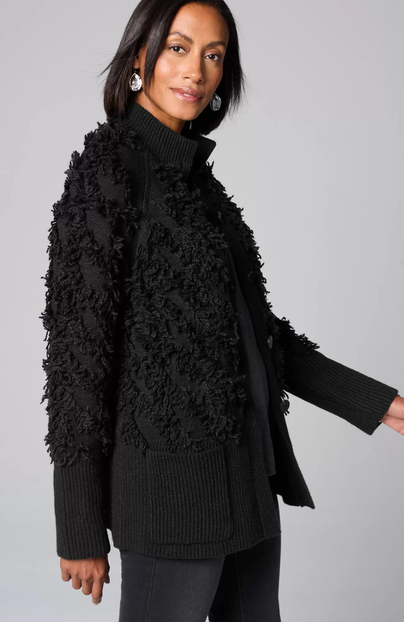 Exclusively part of our limited-edition Pure Jill Elements Collection. This layer promises to add a special touch to all your looks. Soft, cotton-rich yarns create a clipped-jacquard pattern for dramatic texture. Finished with a ribbed neckline, cuffs and hem. Stand collar. Five-button closure at front. Patch pockets.