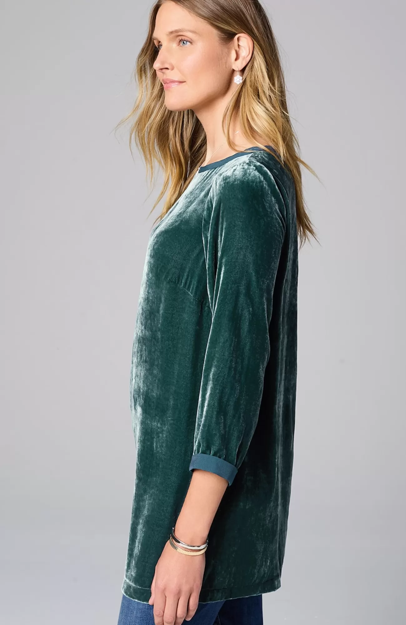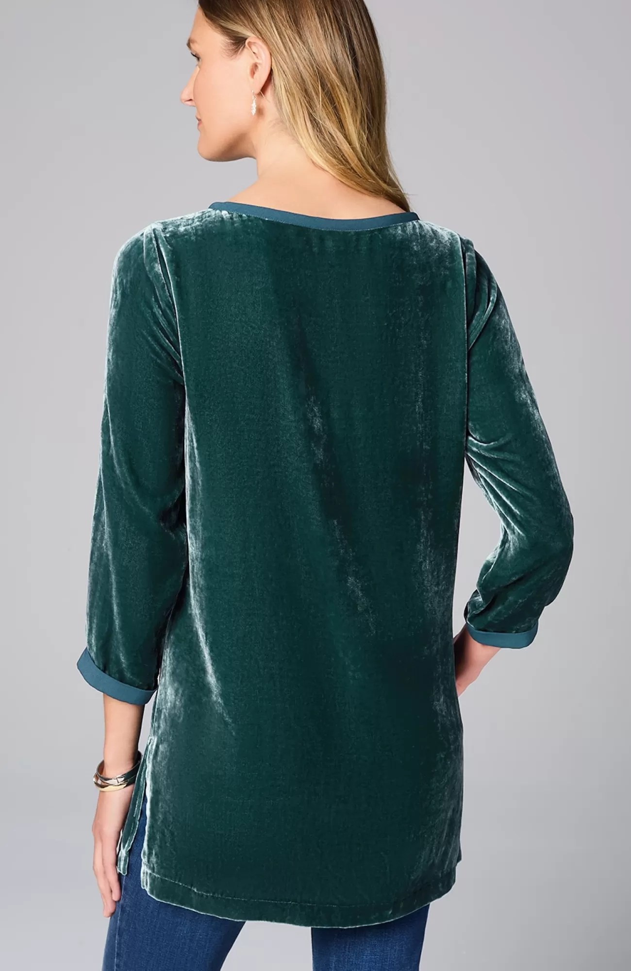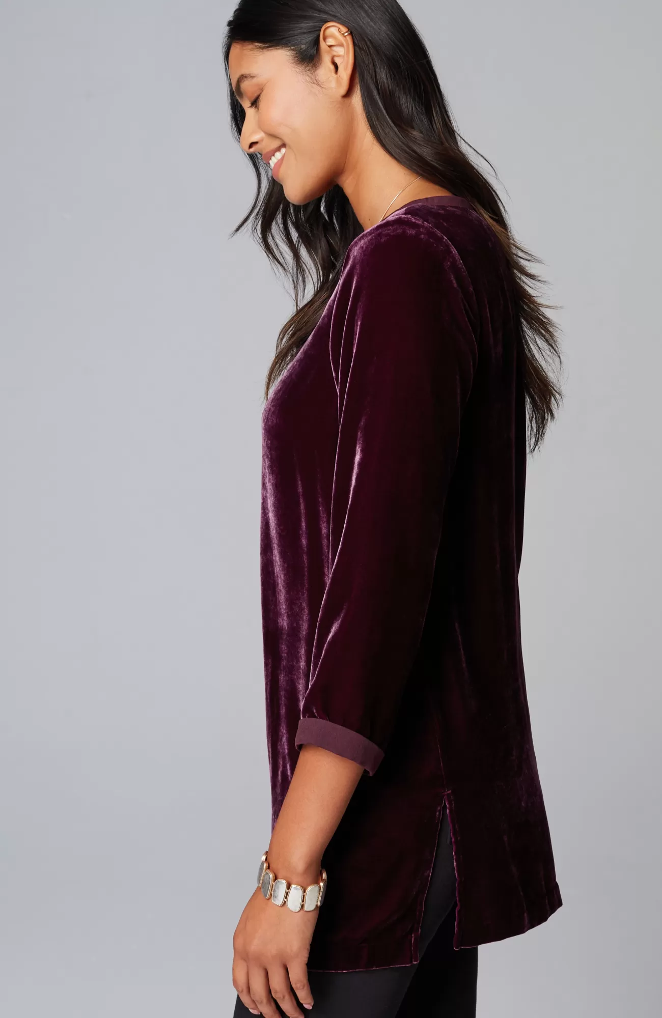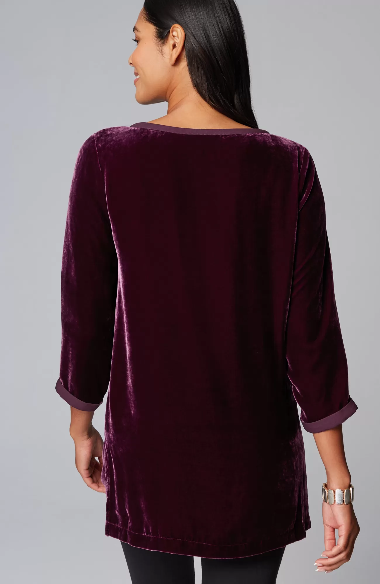 Our pullover tunic combines rayon and silk to create a woven velvet shirt that’s exceptionally soft and has a subtle sheen. The matte satin trim around the neckline and cuffs adds contrast. Side vents.