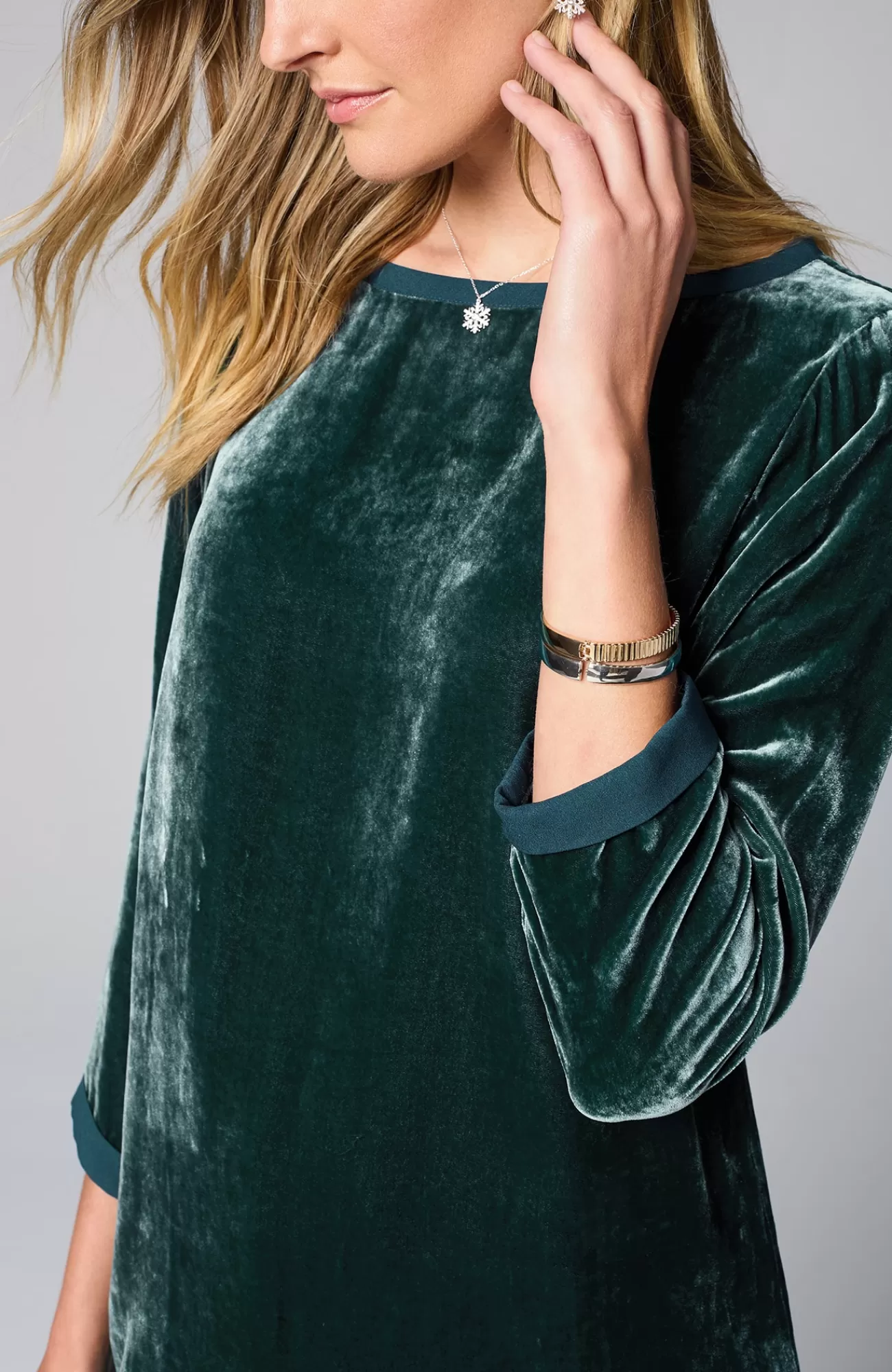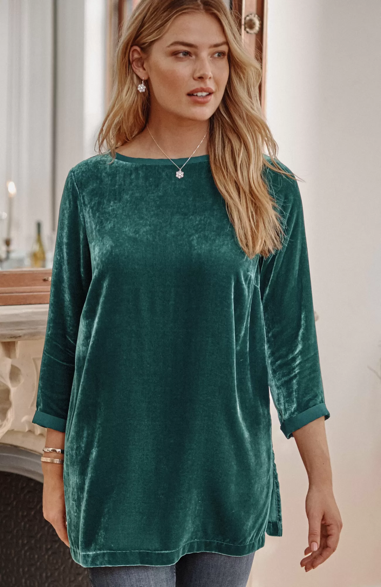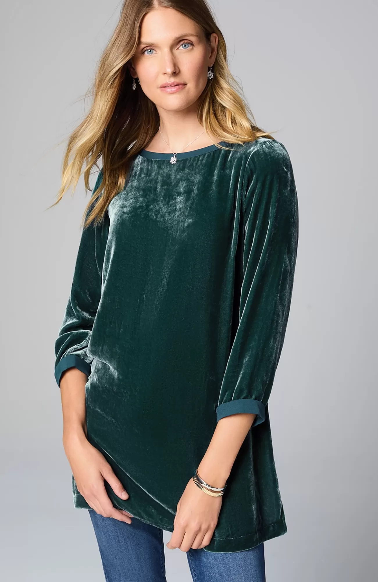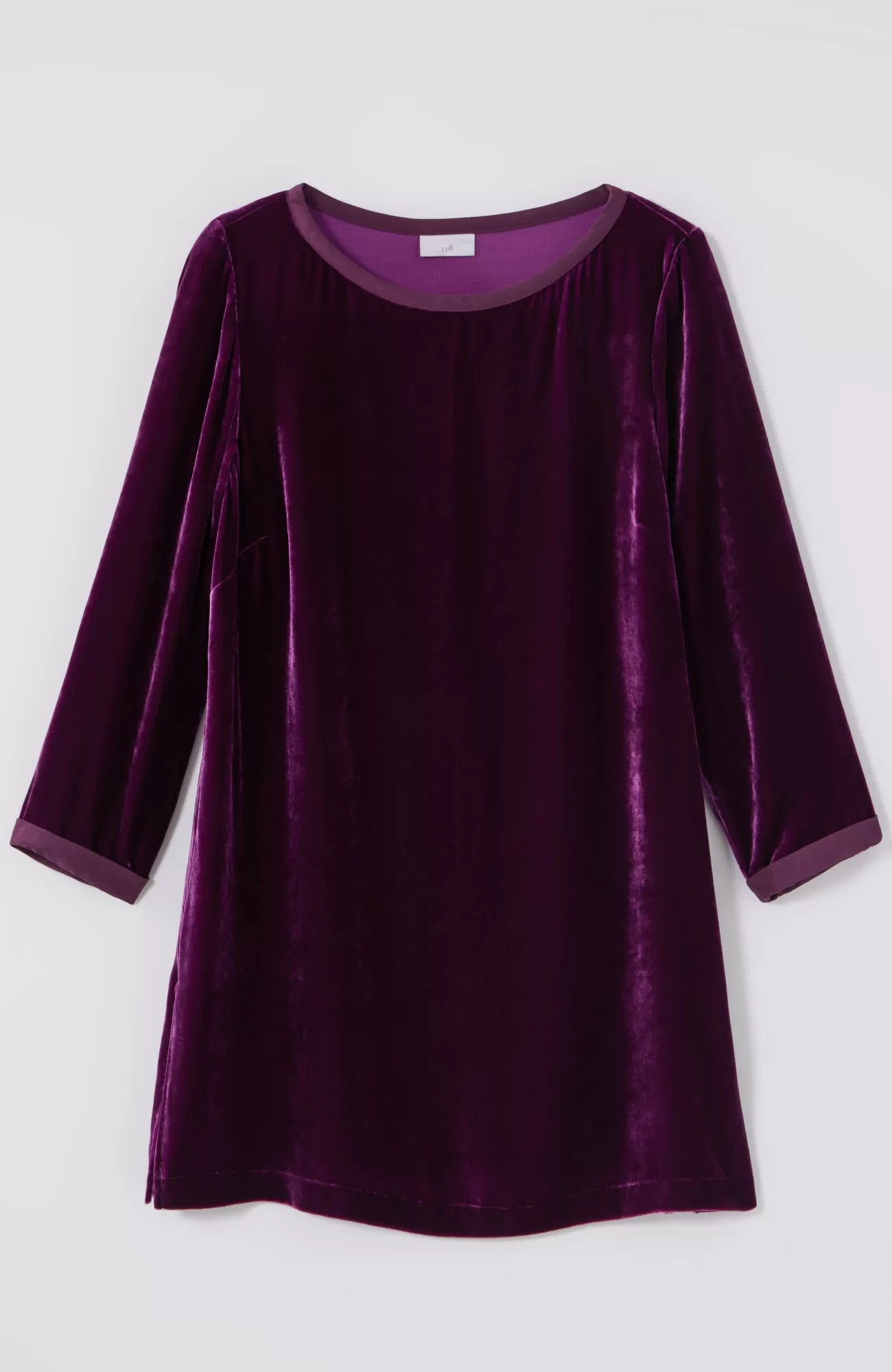 Our pullover tunic combines rayon and silk to create a woven velvet shirt that’s exceptionally soft and has a subtle sheen. The matte satin trim around the neckline and cuffs adds contrast. Side vents.