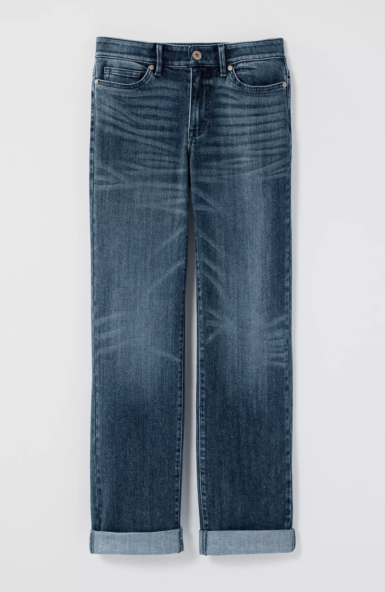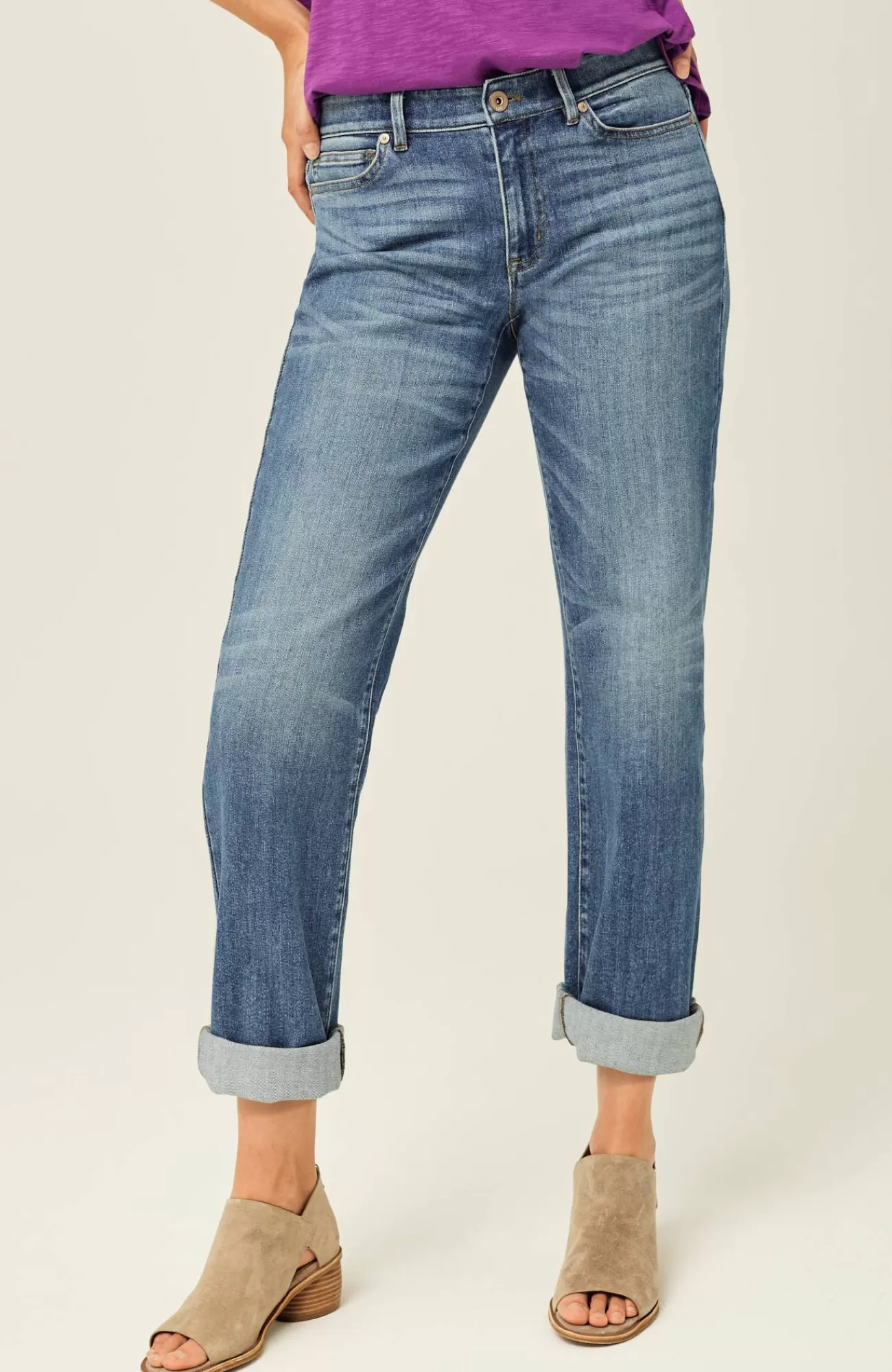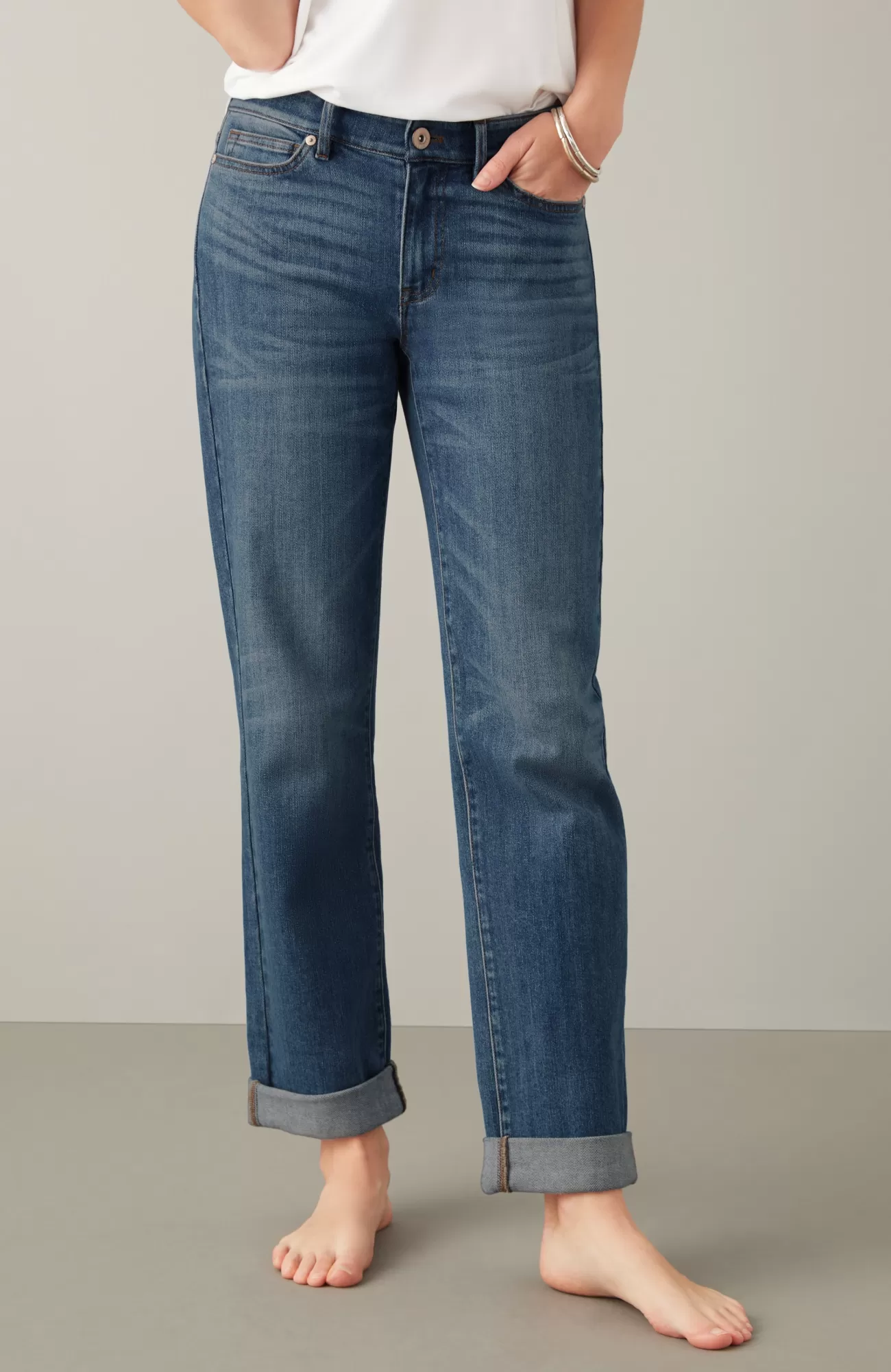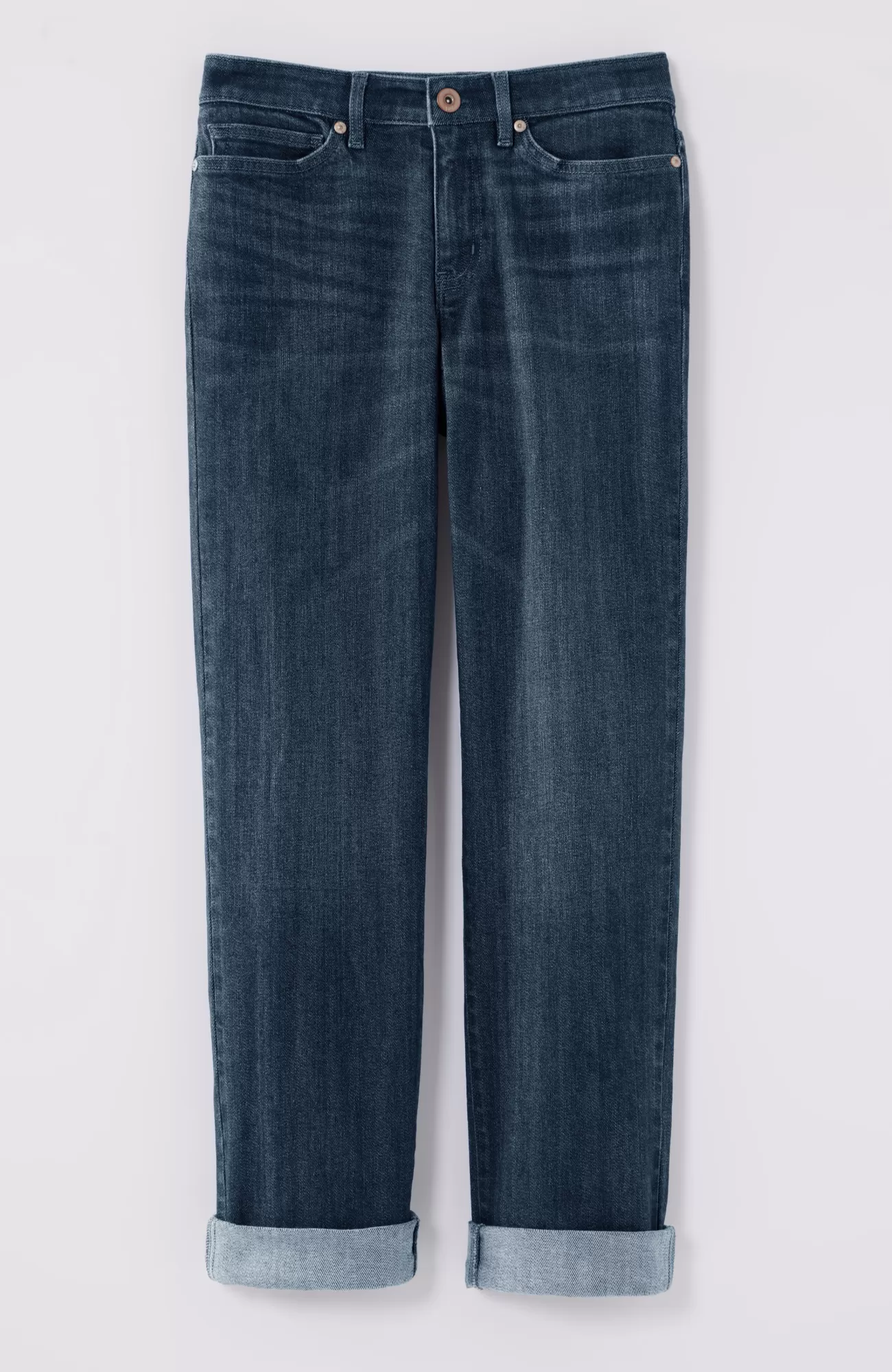 Our 5-pocket boyfriend jeans are back in a more relaxed cotton blend for the softness and ease you know and love. They’ll be one of your casual-day favorites to pair with shirts, tees and sweaters. Rolled cuffs can be adjusted to your desired height. Belt loops. Fly front with tack closure.