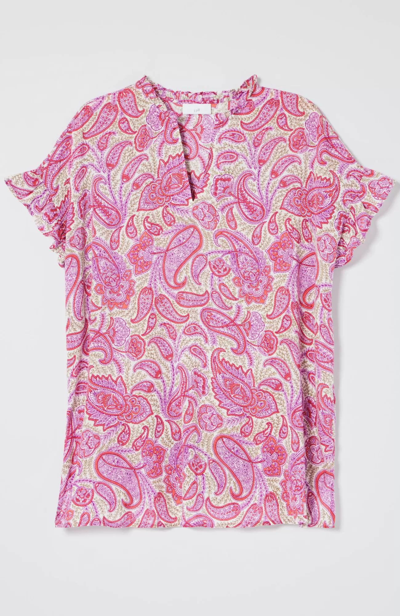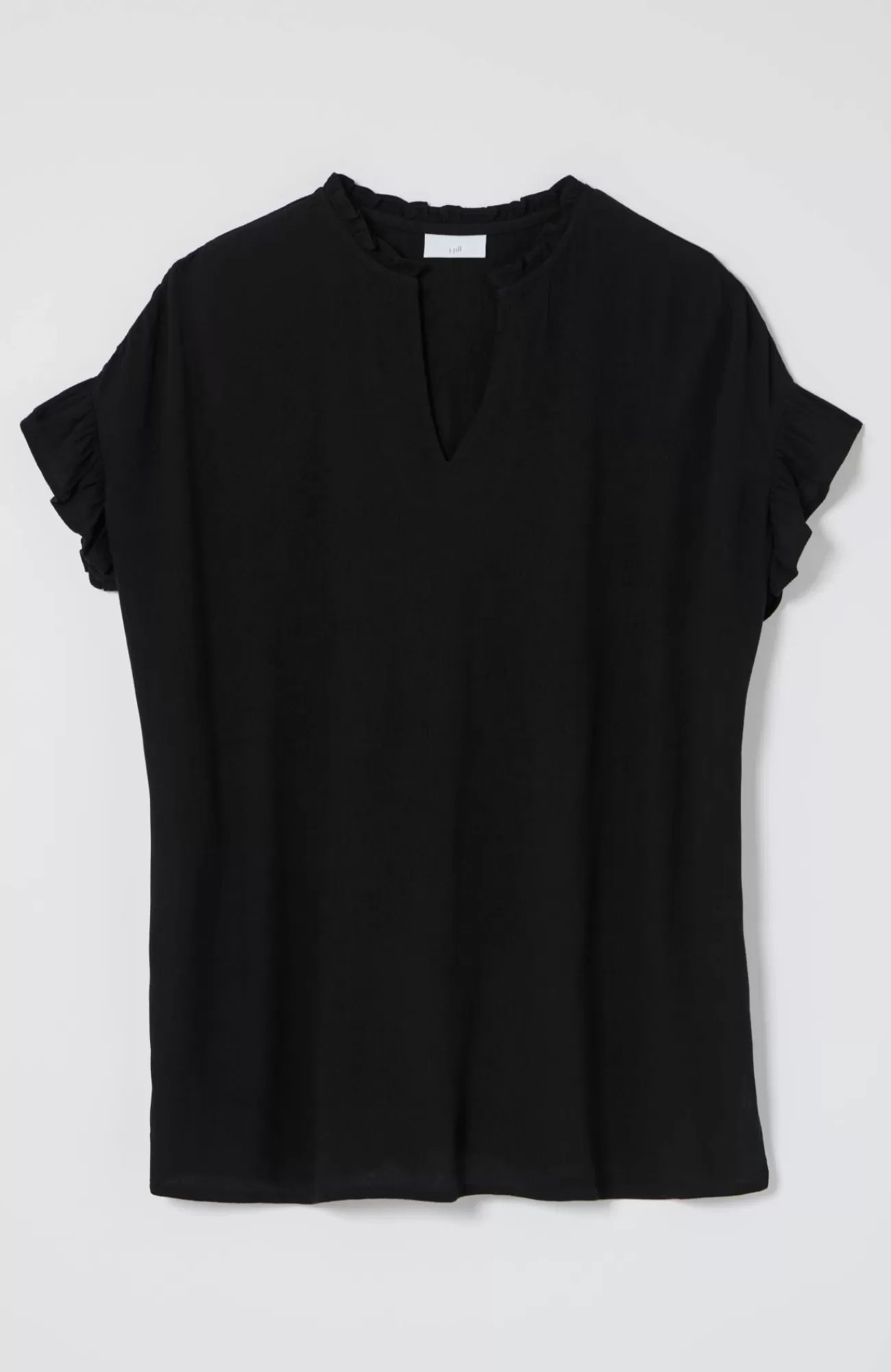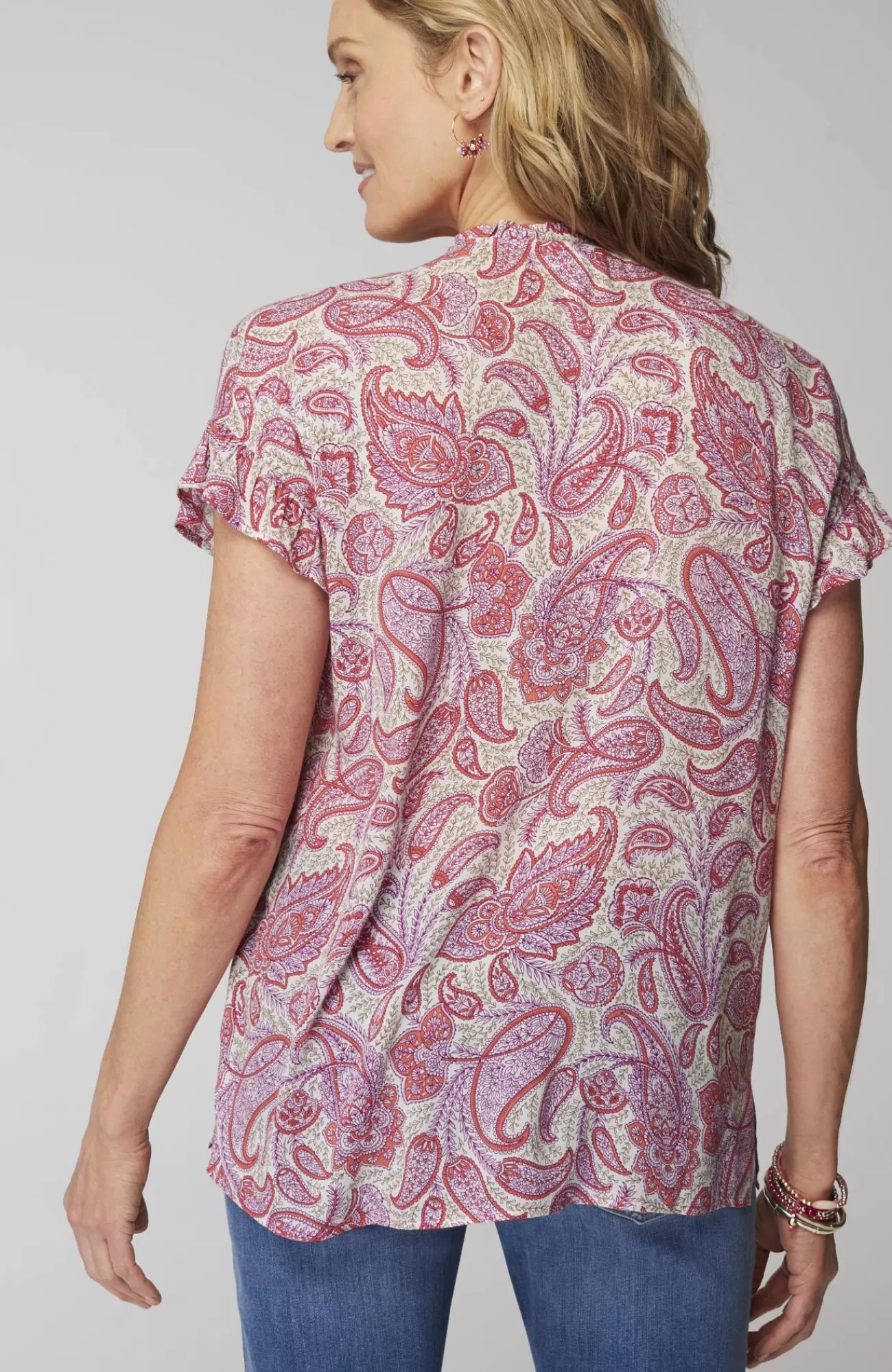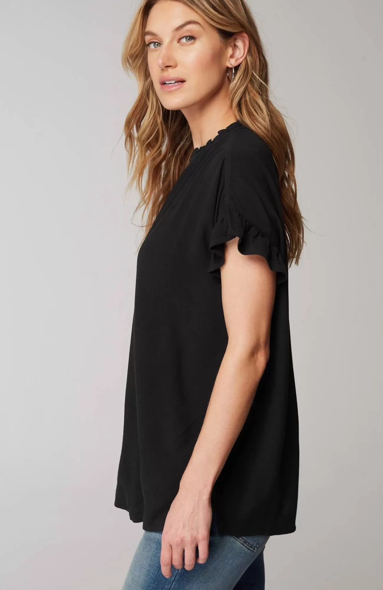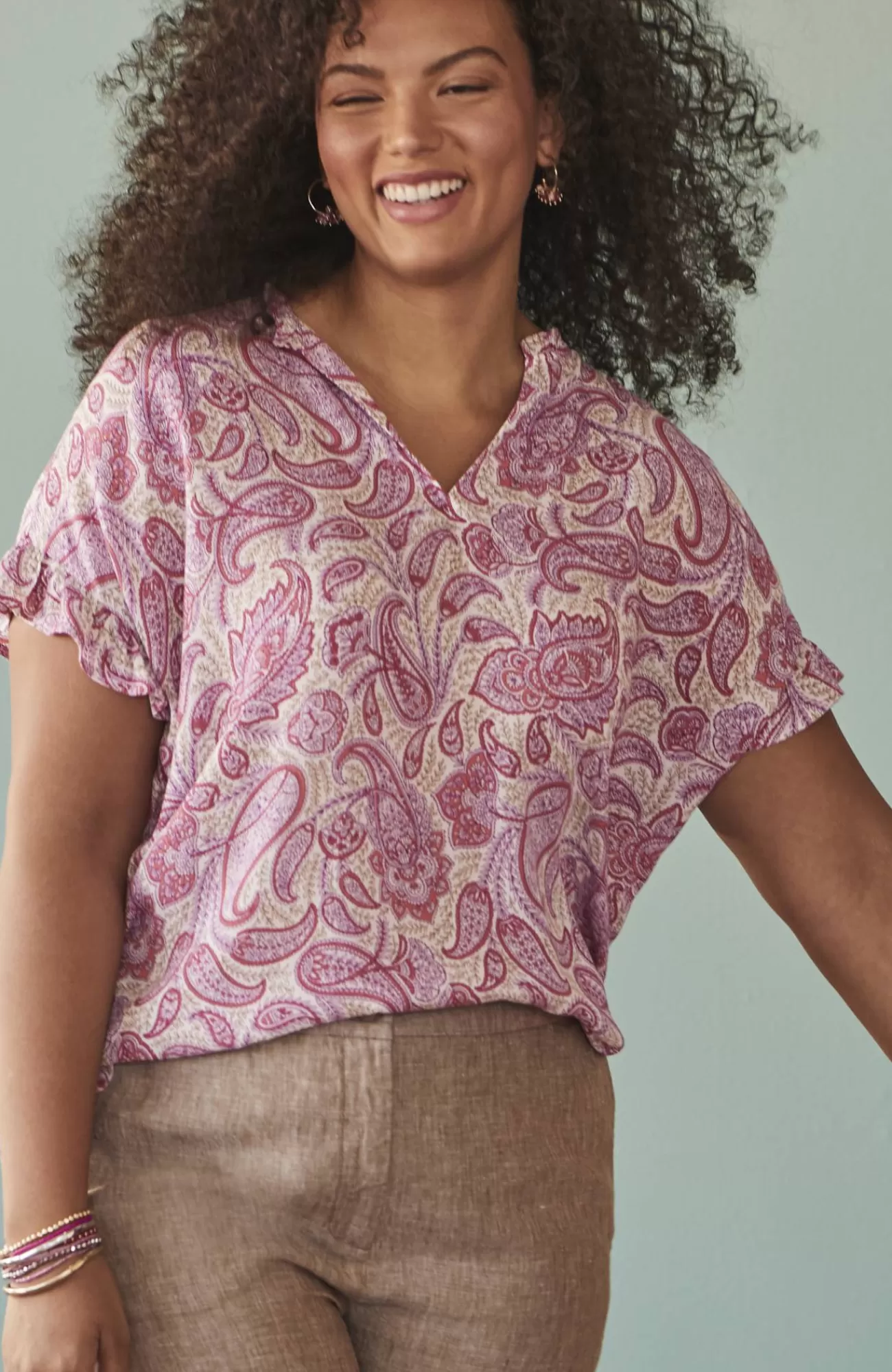 Everyday summer style in a relaxed top that's ready for all your plans. Allover crinkle texture with ruffle details accenting the split neckline and sleeves. Side vents.