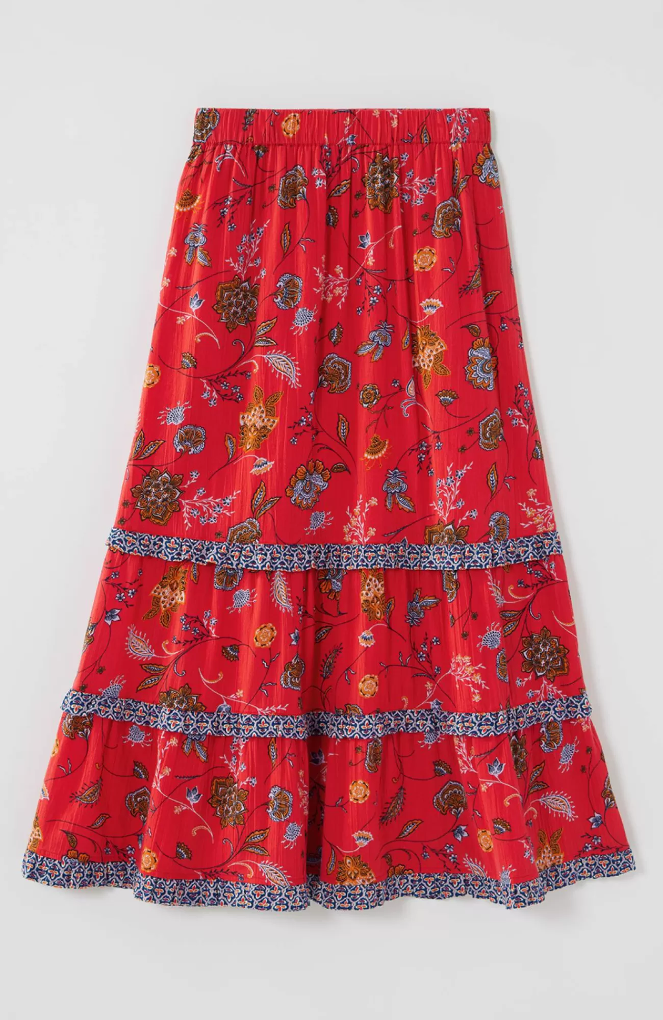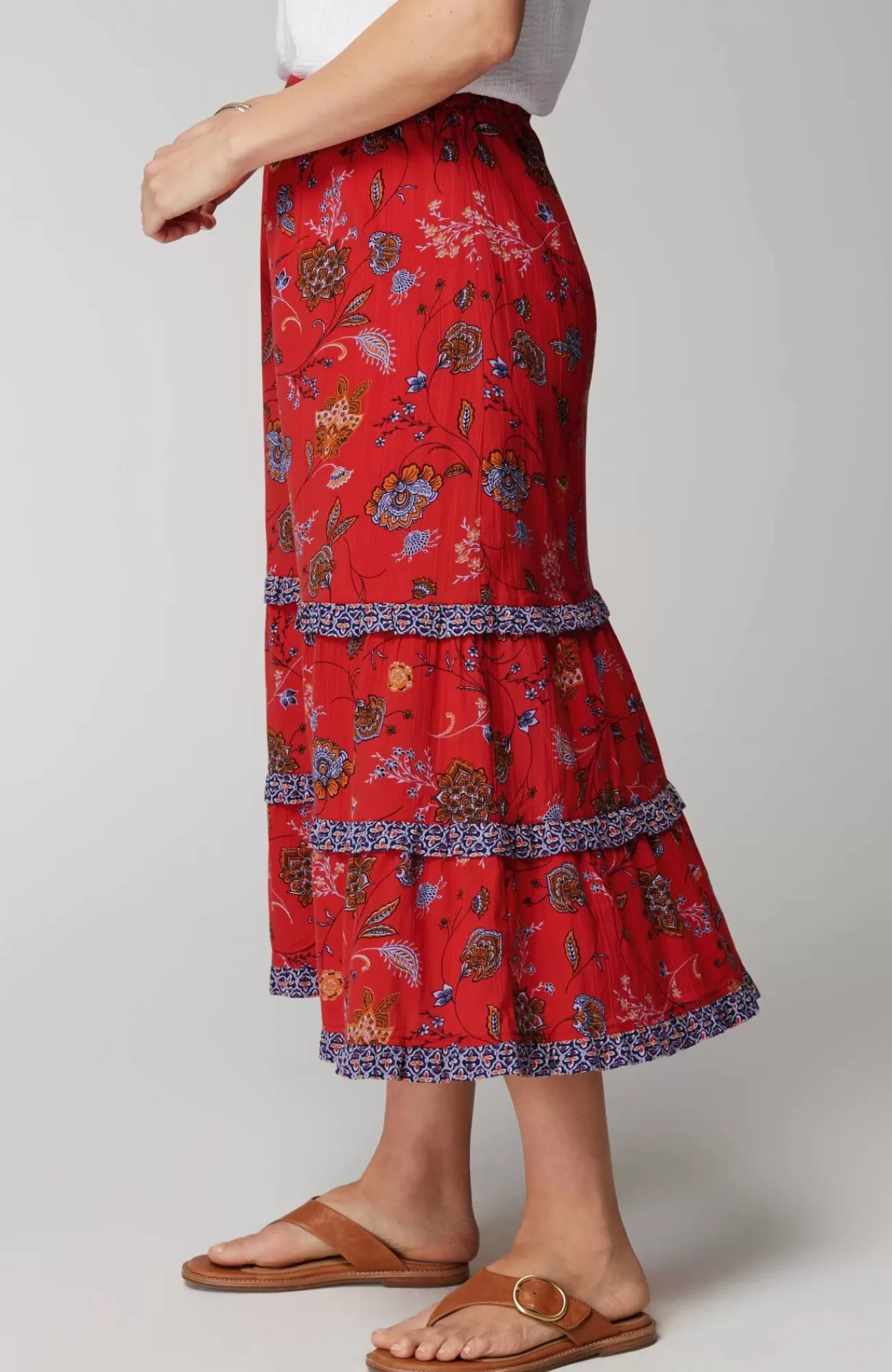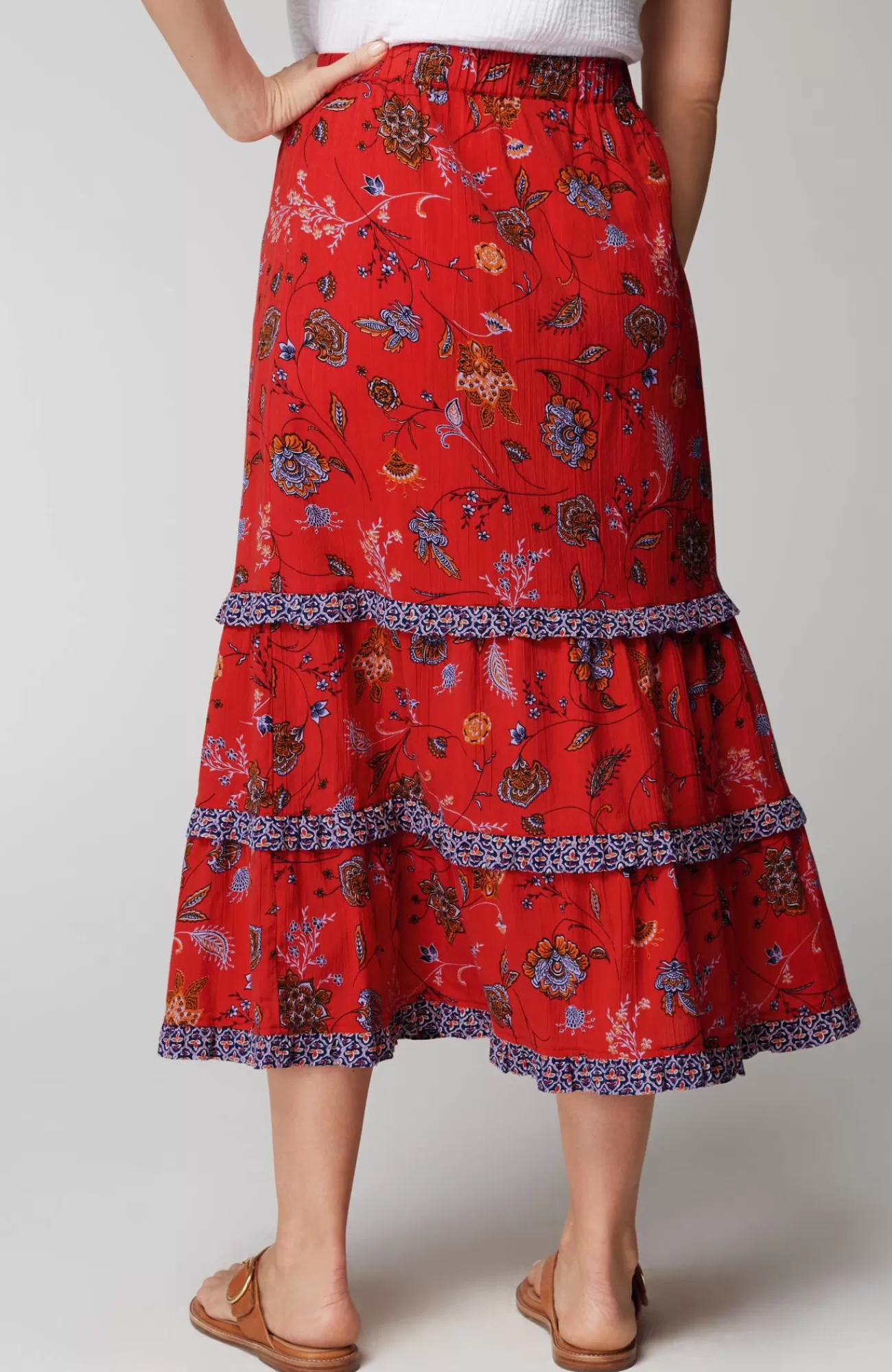 Meet the summer maxi skirt that always makes a statement. The moves-with-you design is elevated with ruffled tiers and a contrasting mix of prints. Elasticized waist. Partial lining to the knee.