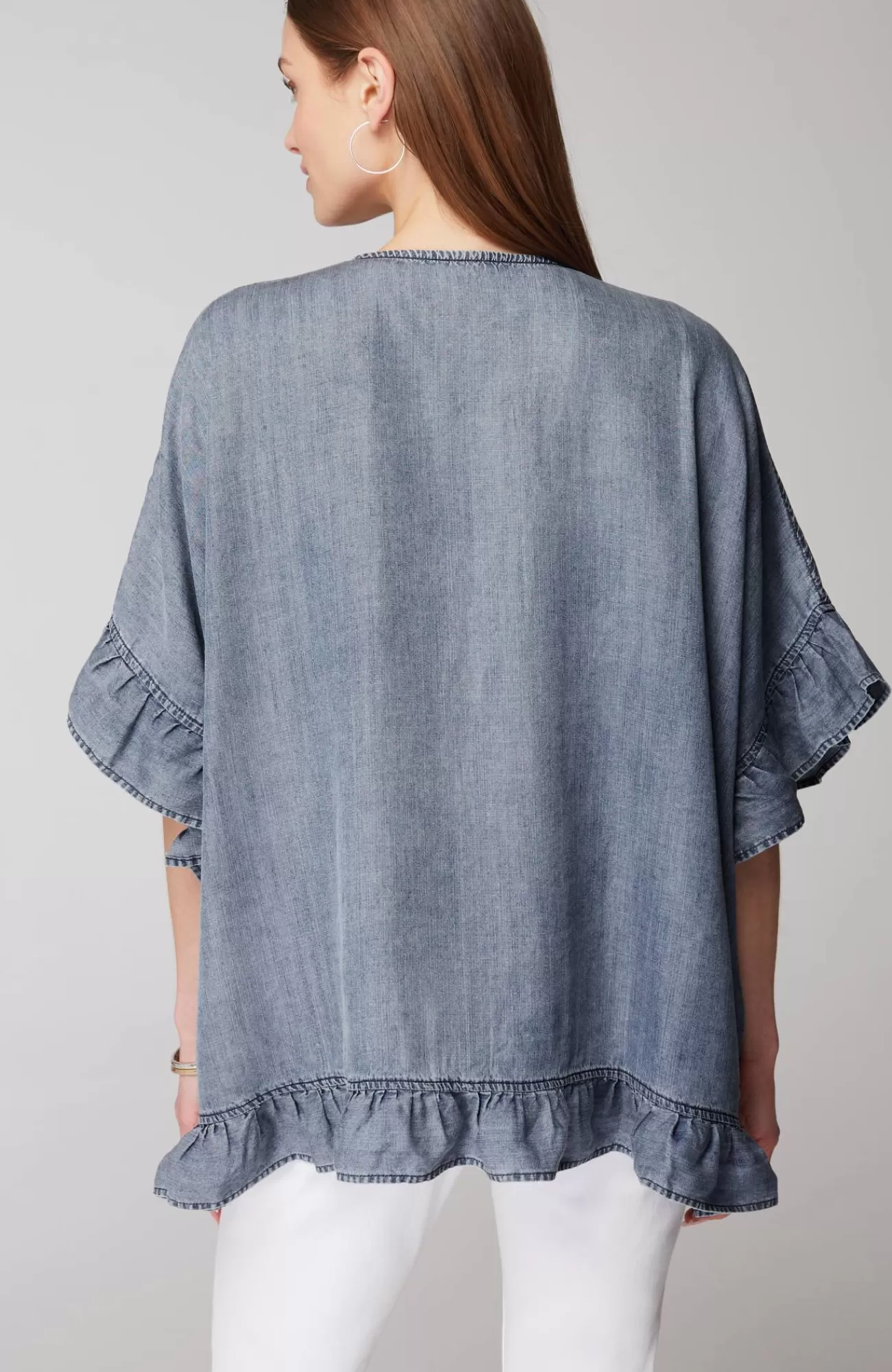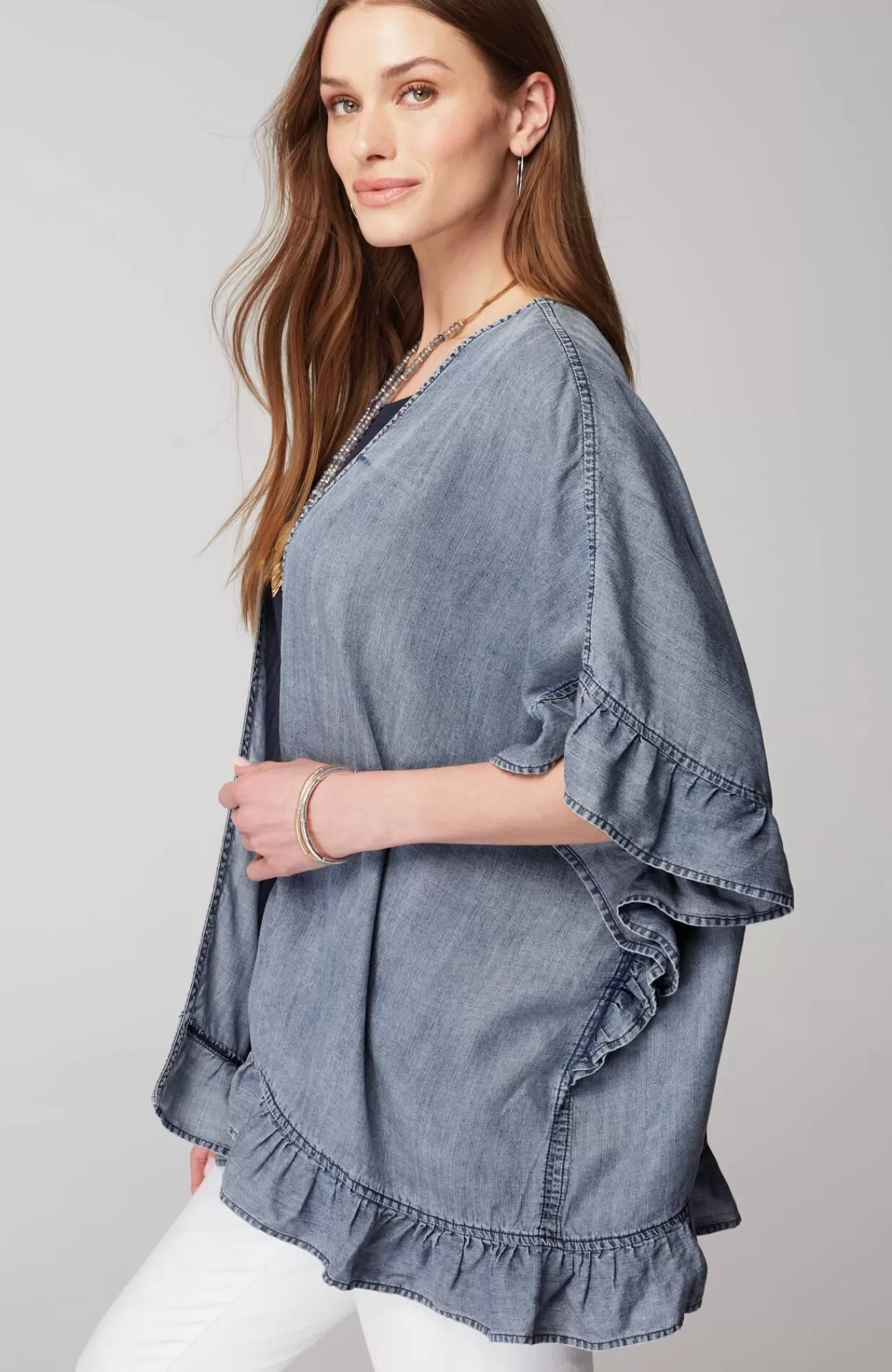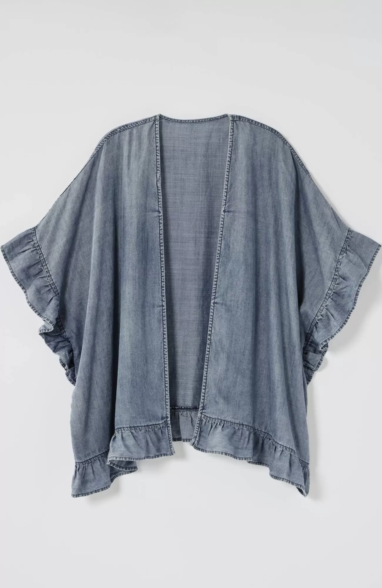 We've taken the classic ruana style you love and elevated it with a denim twist (because what's summer without a little denim?). Designed with an open front and playful ruffles along the sleeves and hemline, it's a must-have layer for your everyday outfits. Stitched closed at sides.