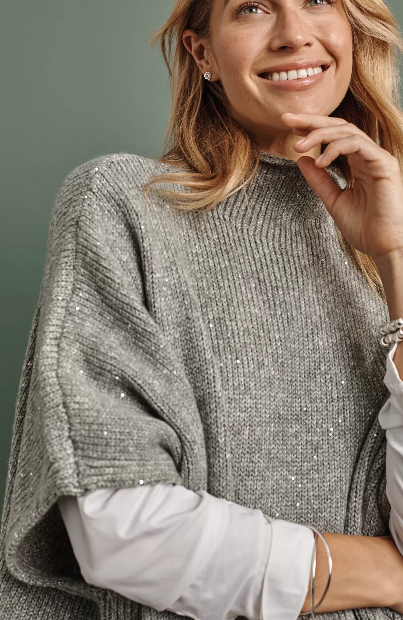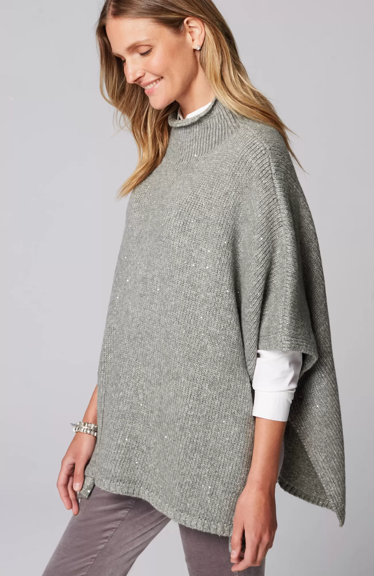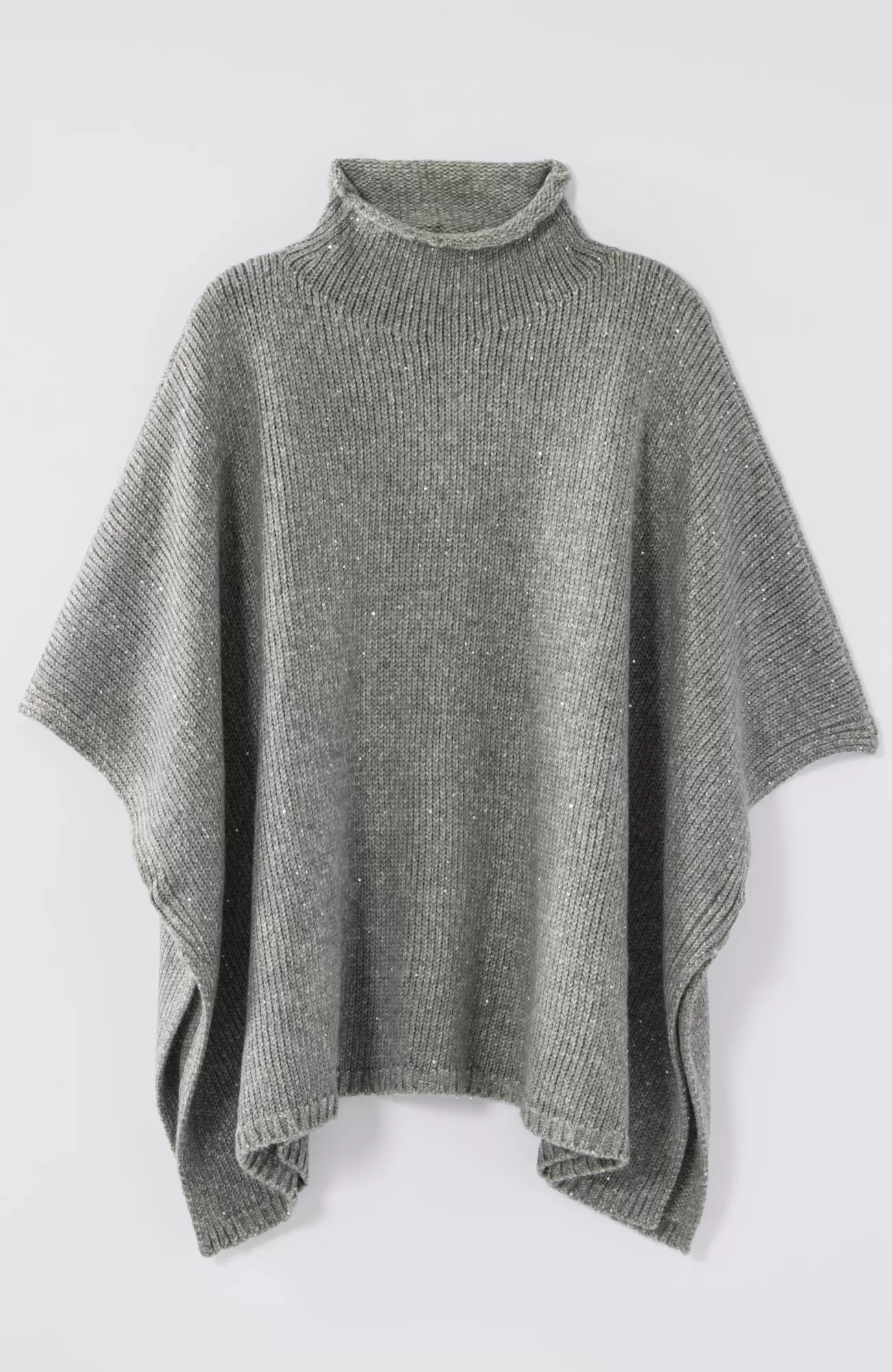 Our blanket-like poncho is an elevated take on the cozy turtleneck sweater. Sequins add a touch of sparkle throughout the cotton-blend yarns. Finished with a ribbed neckline and hem. Tacked at the sides.