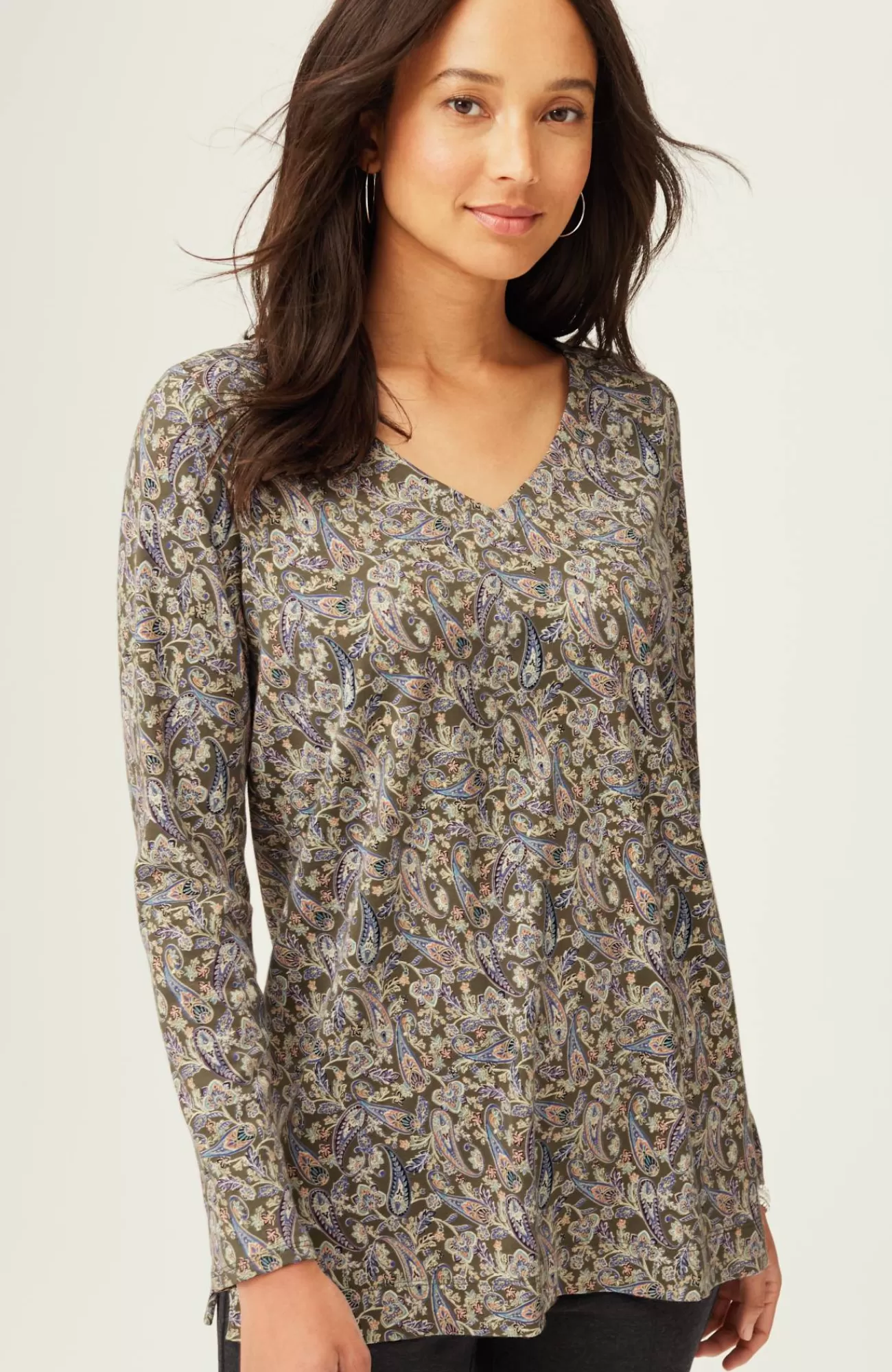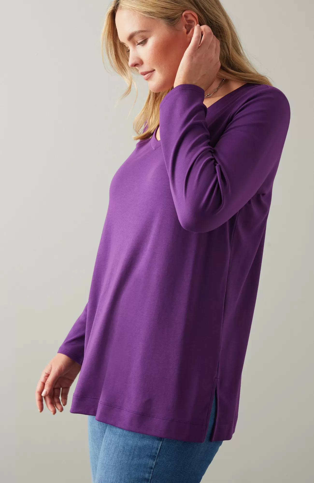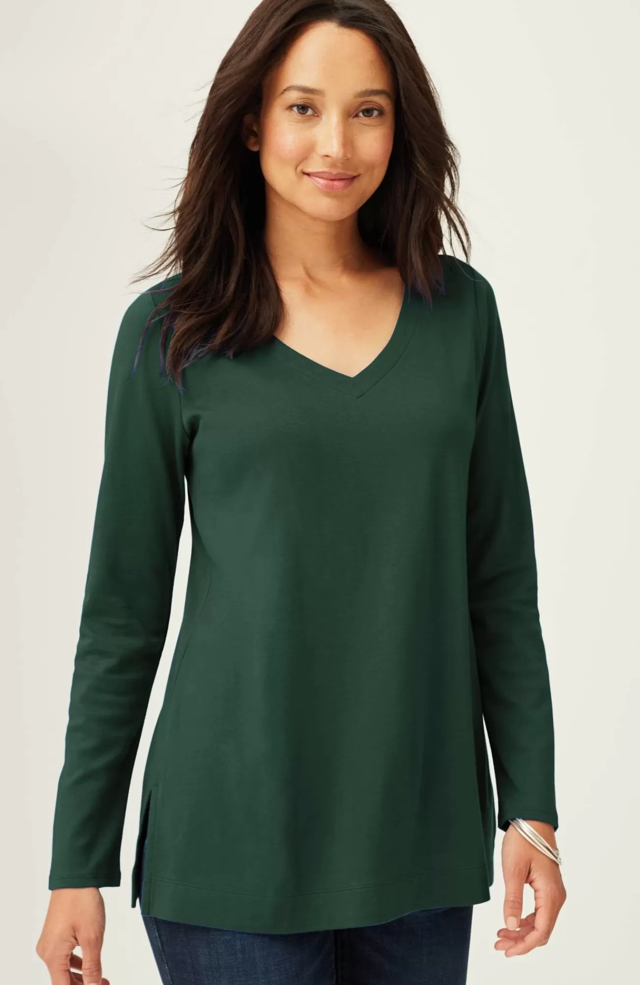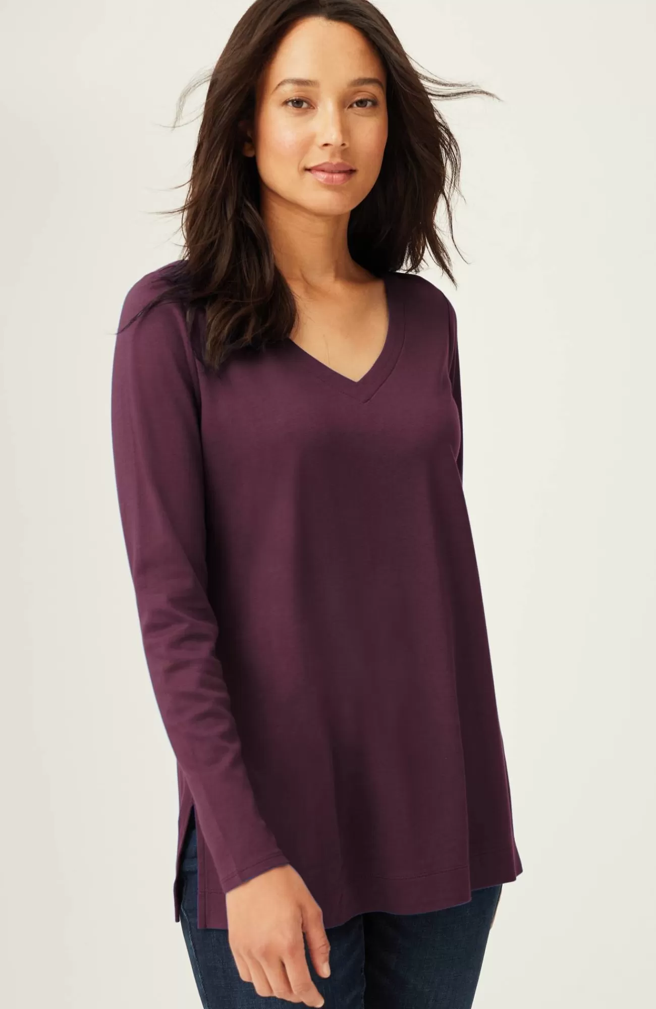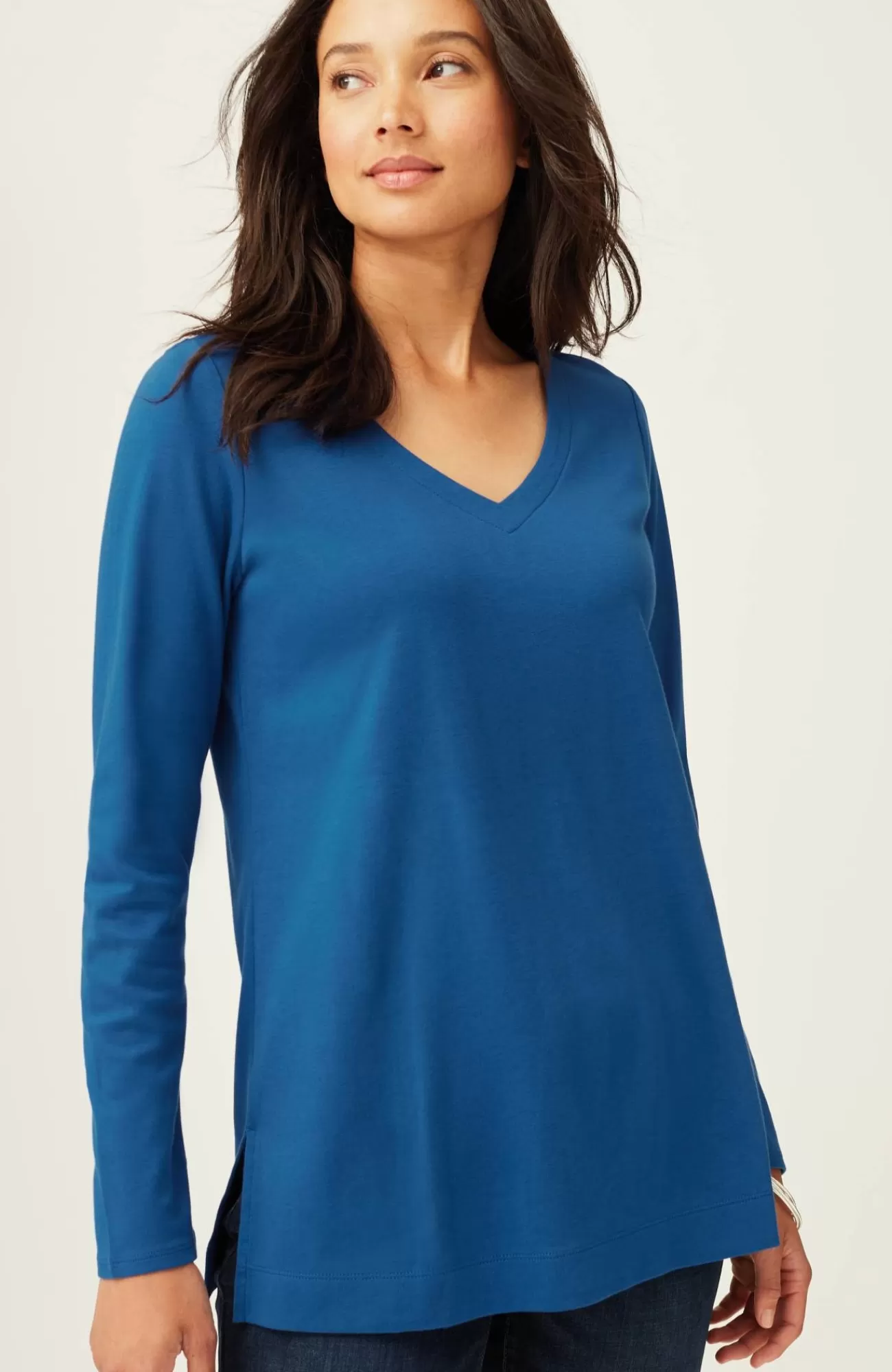 Our better-than-basic tunic is designed with the ultimate softness of Supima® cotton for all-day comfort and style. V-neckline. Side vents.