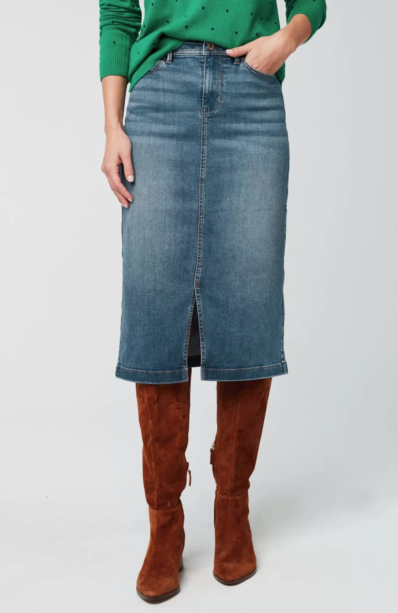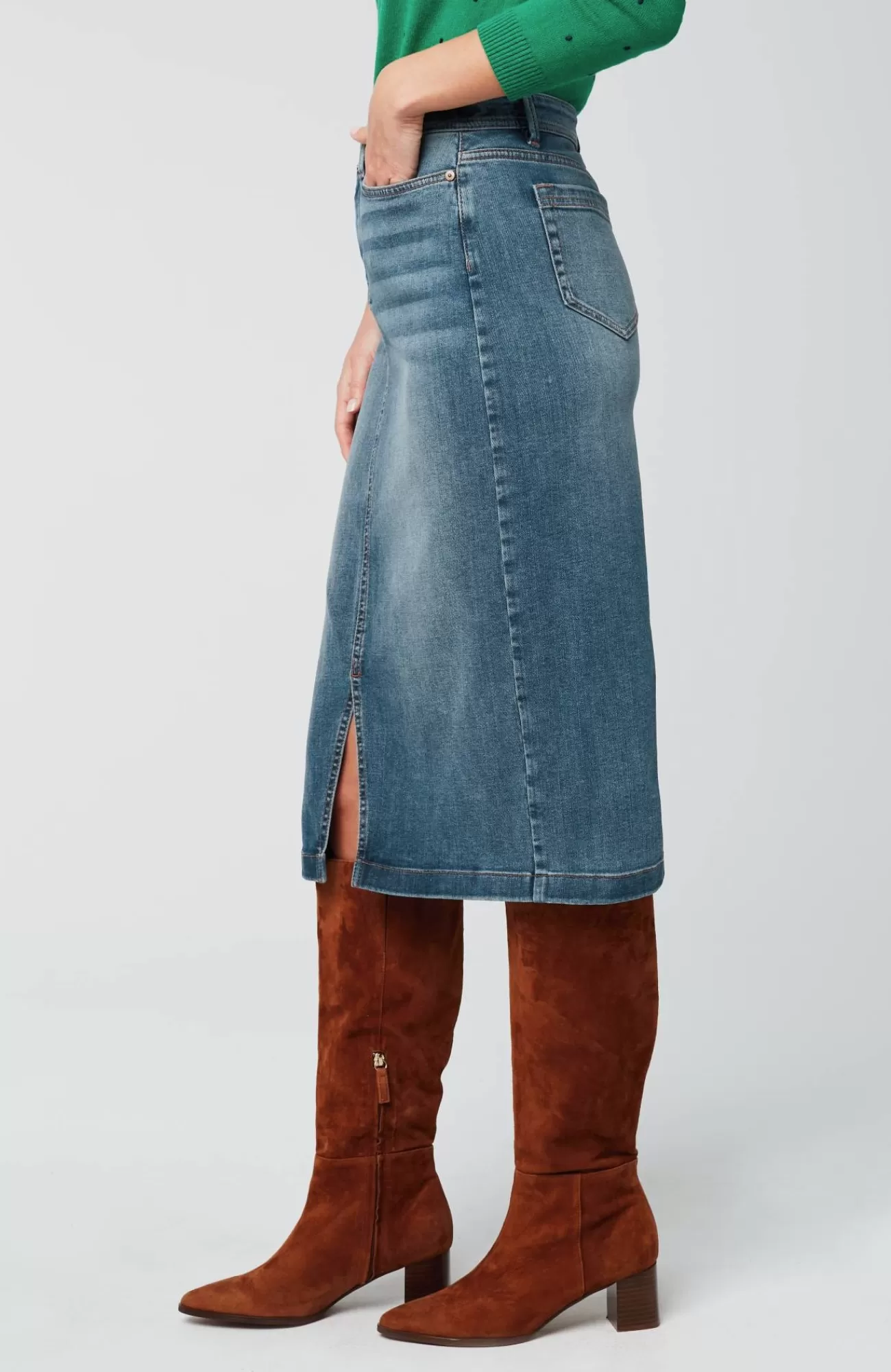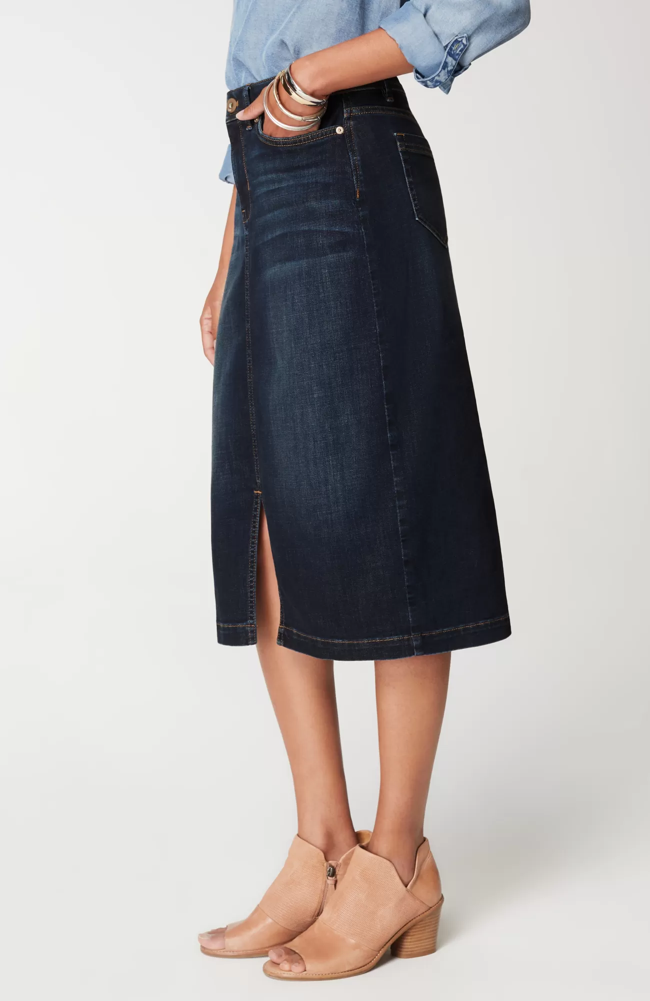 More than denim, perfect for every day. Meet our slit-hem denim midi skirt, a dressed-up step up from jeans, designed to go anywhere comfortably.
