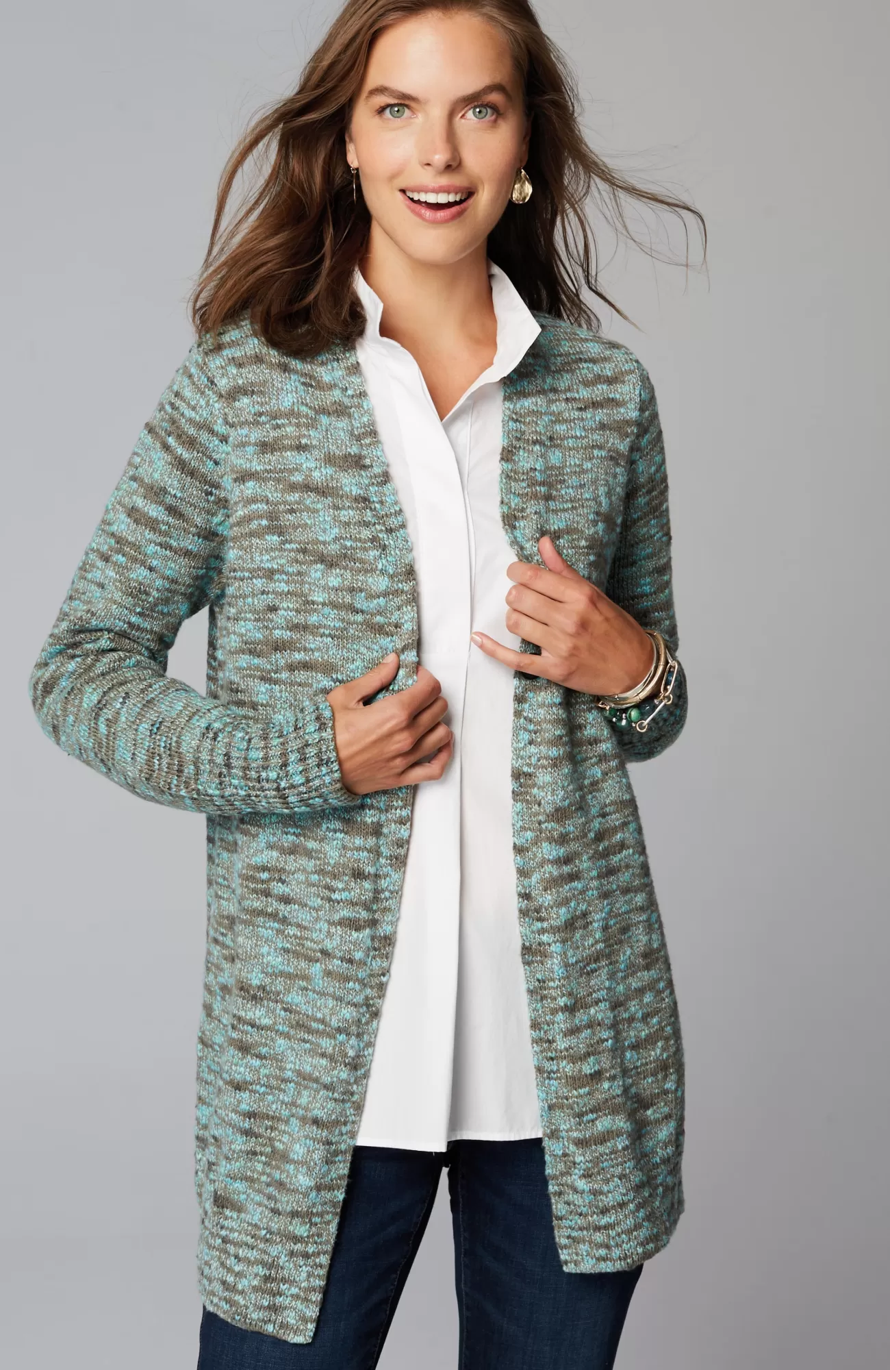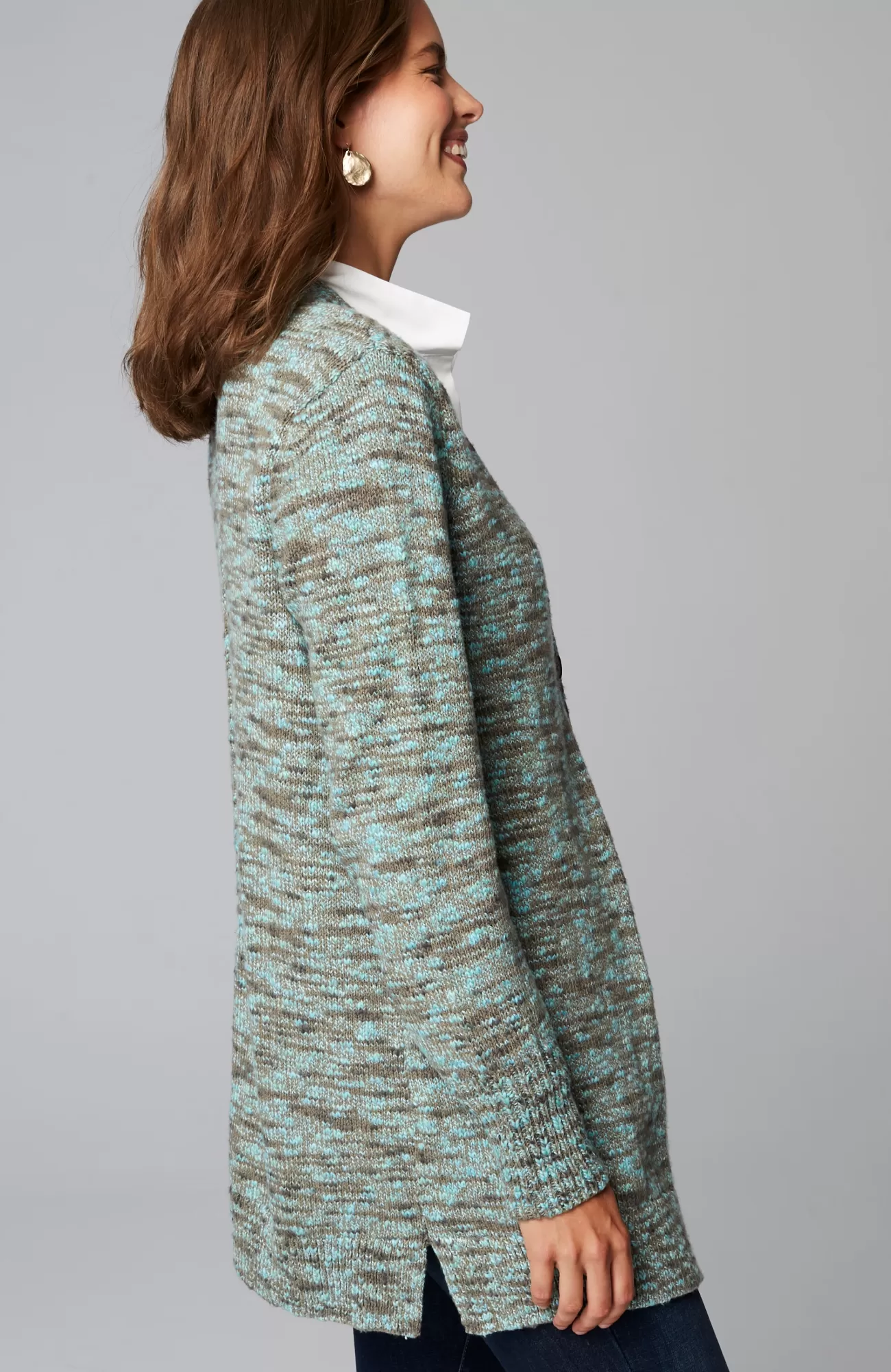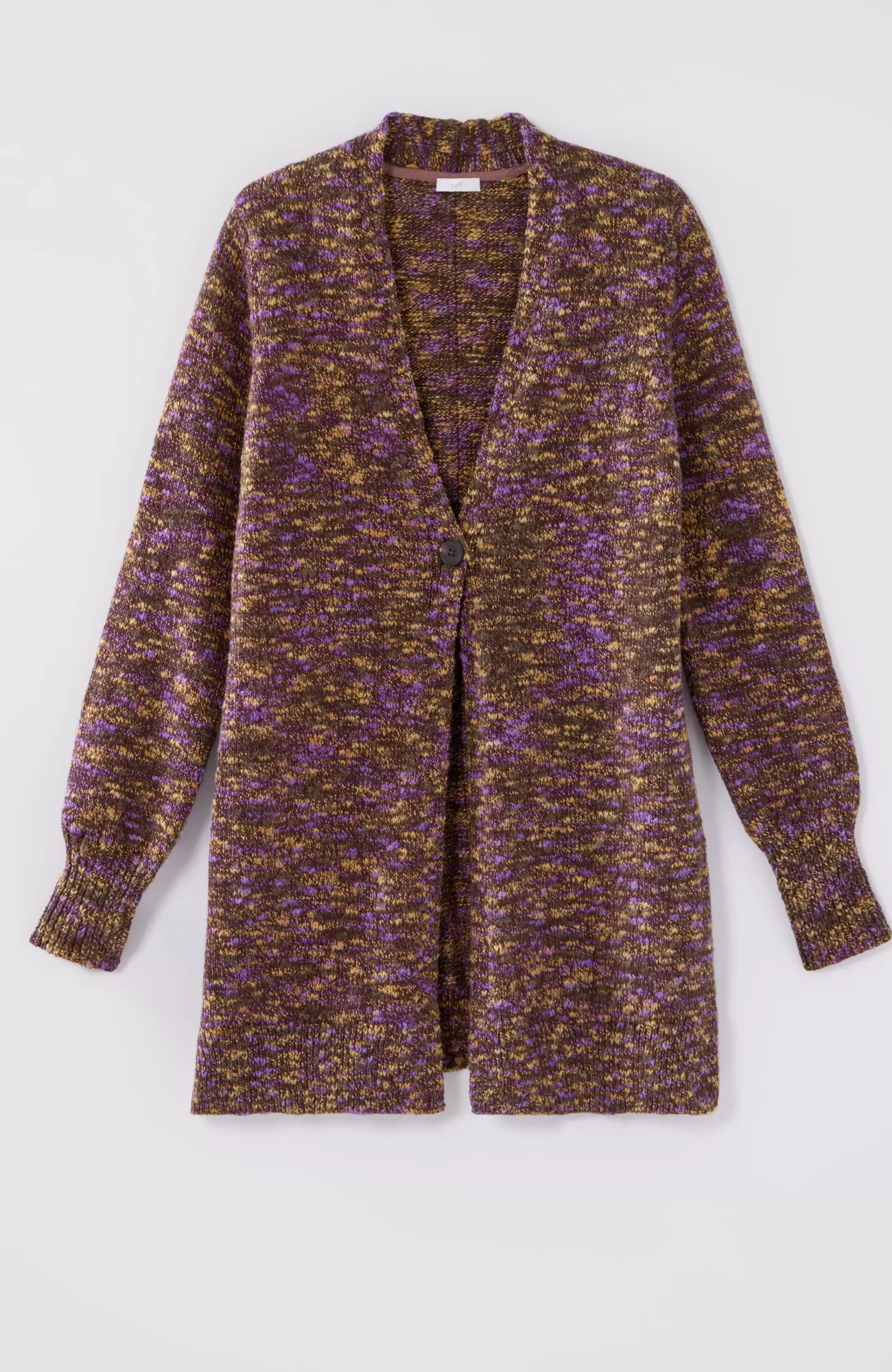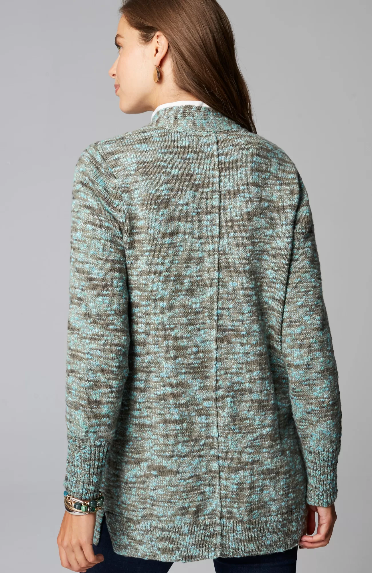 Knit from soft, multicolored yarns, this space-dyed sweater has a textured look and feel you’ll love. A center pintuck highlights the back. Single-button closure. Side vents. Elongated ribbing detail at the cuffs.