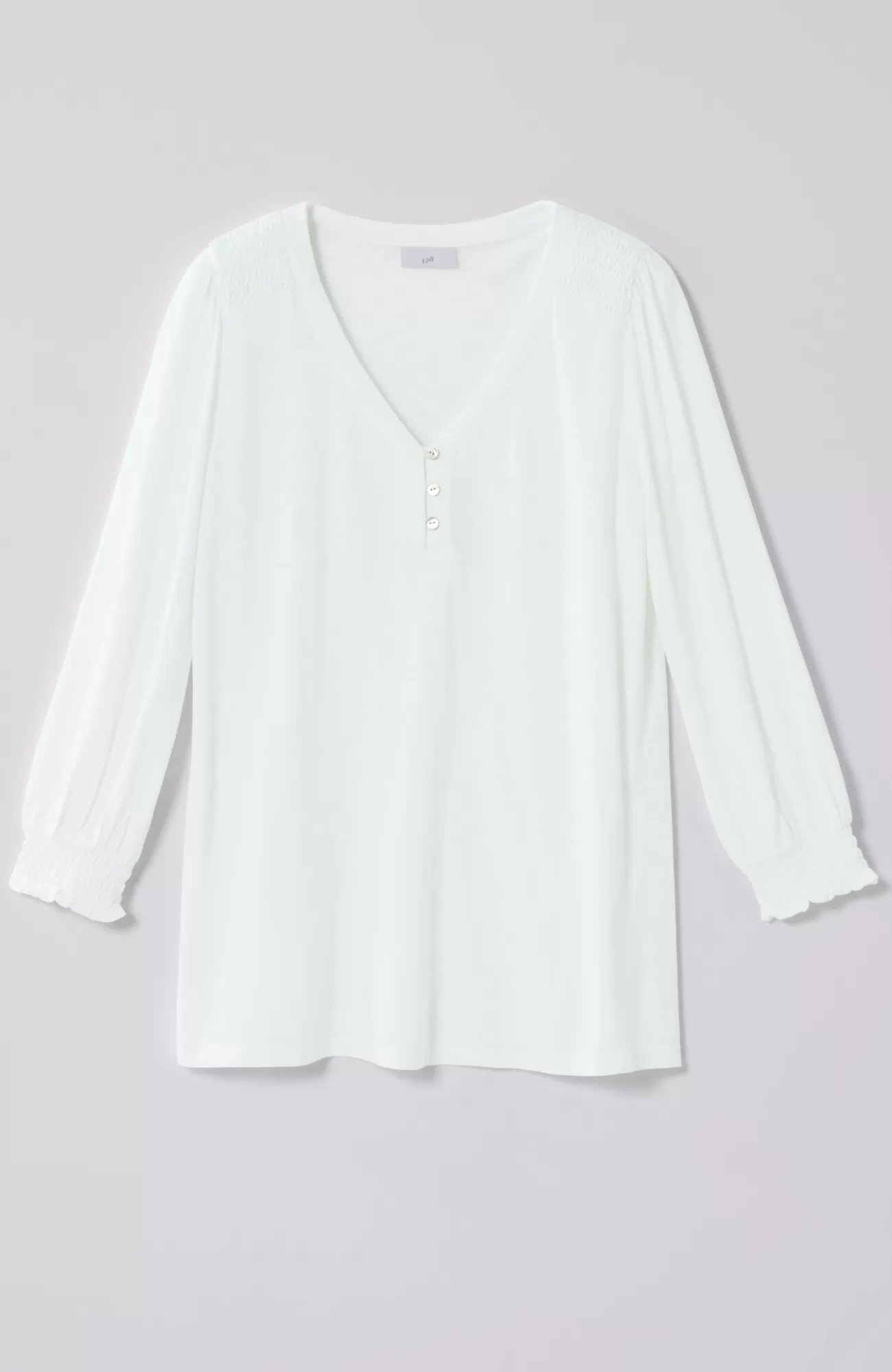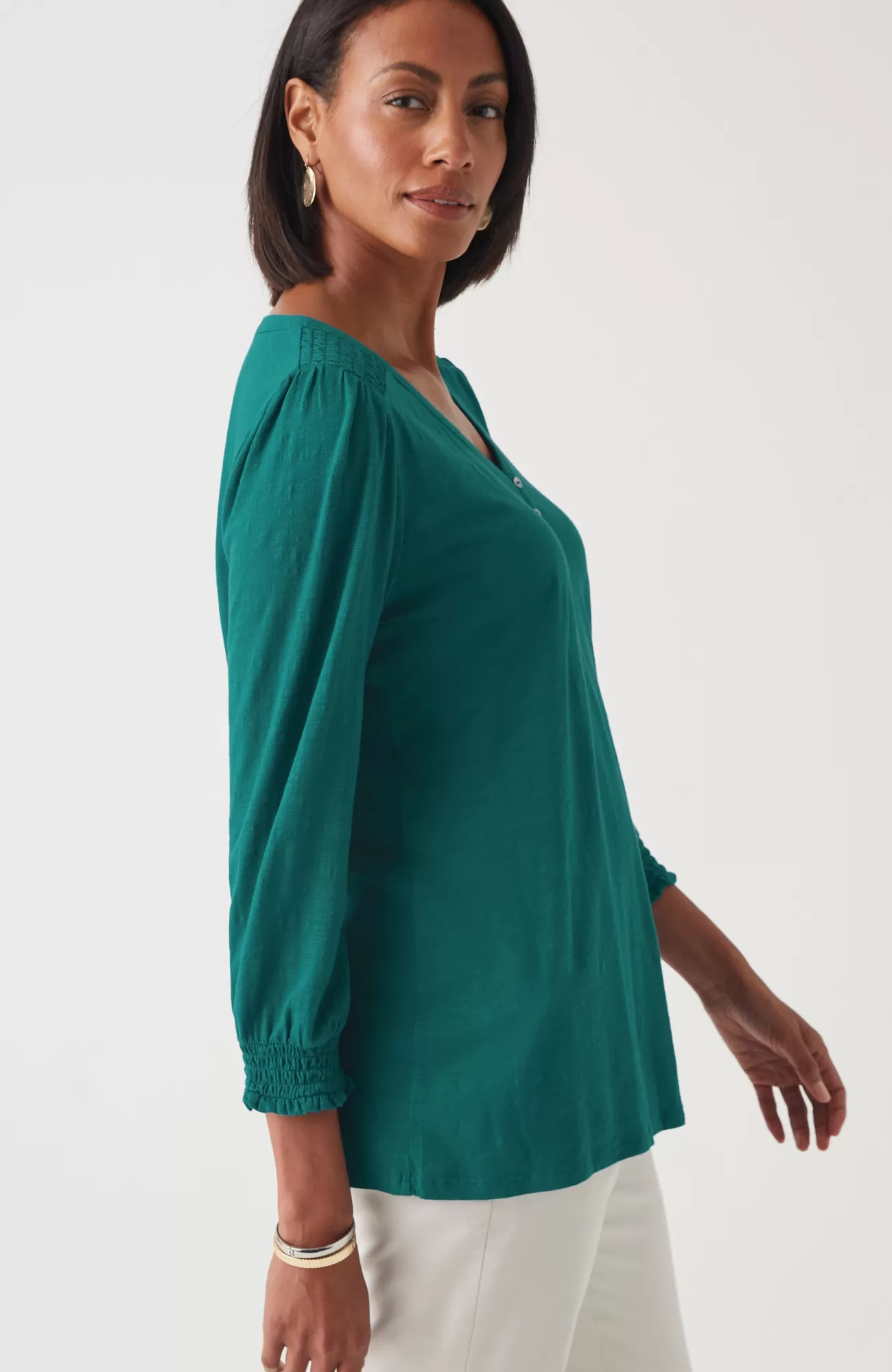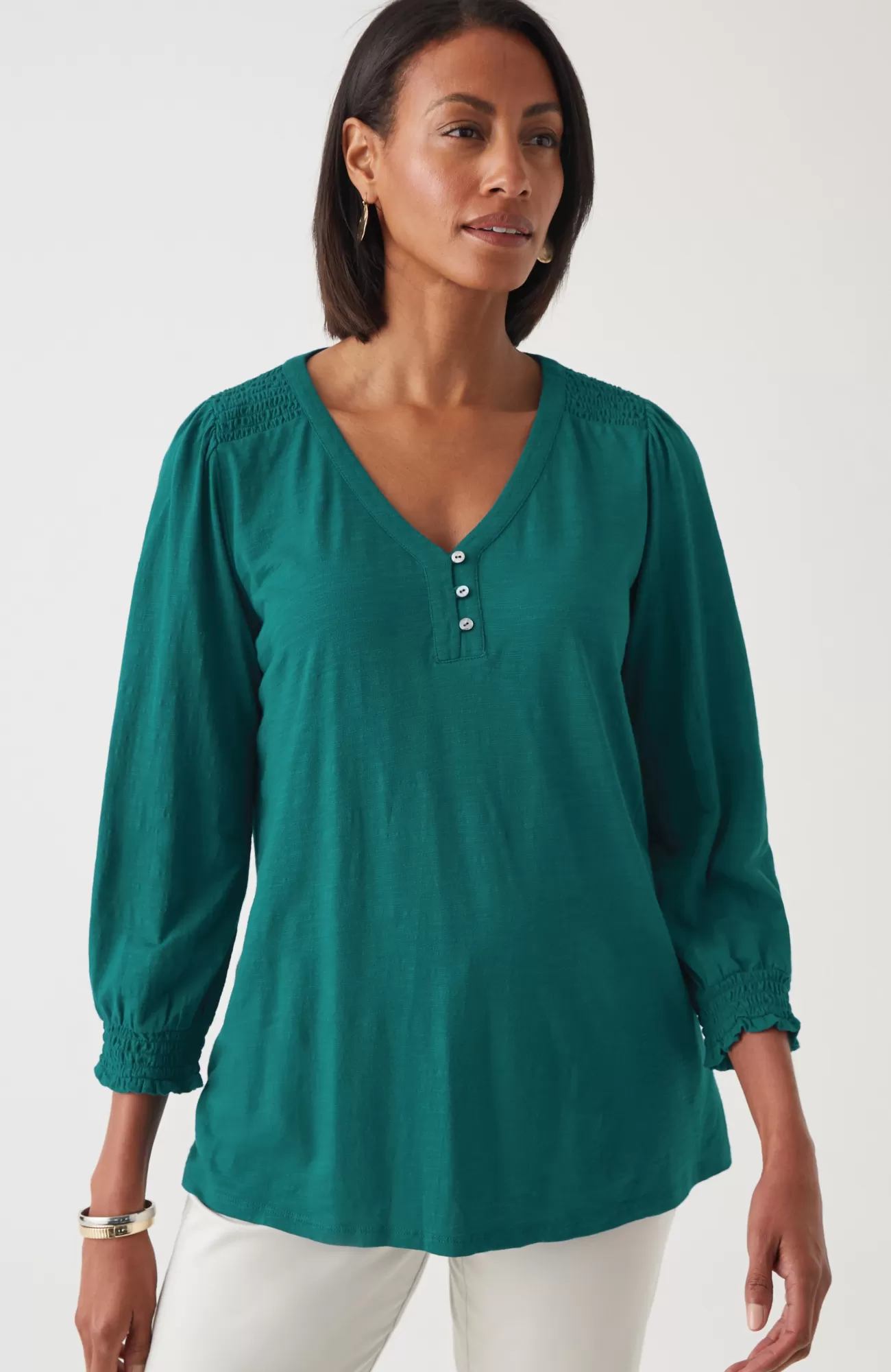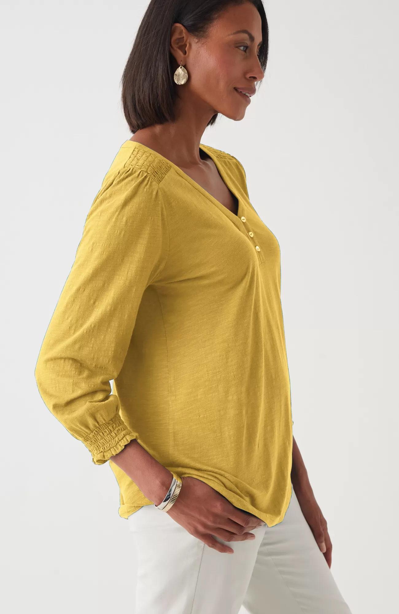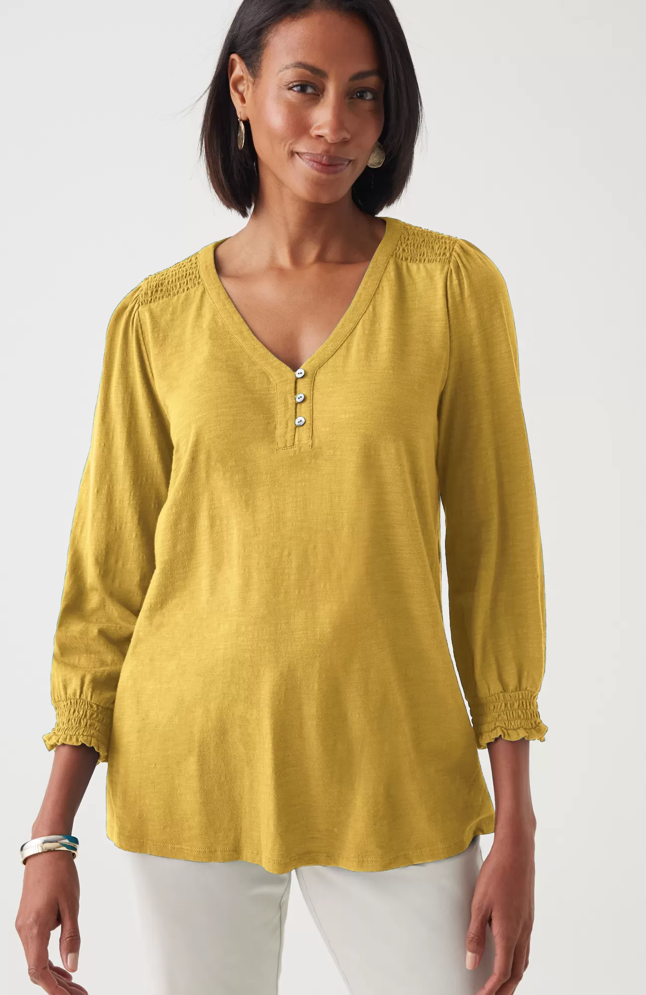 The Henley top you know and love, with a little something extra. Smocking along the shoulder and sleeve cuffs elevates this style and adds a touch of texture. Self-loop closure. Agoya-shell buttons.