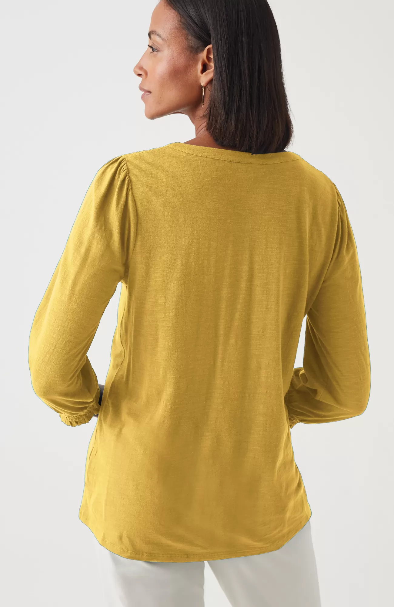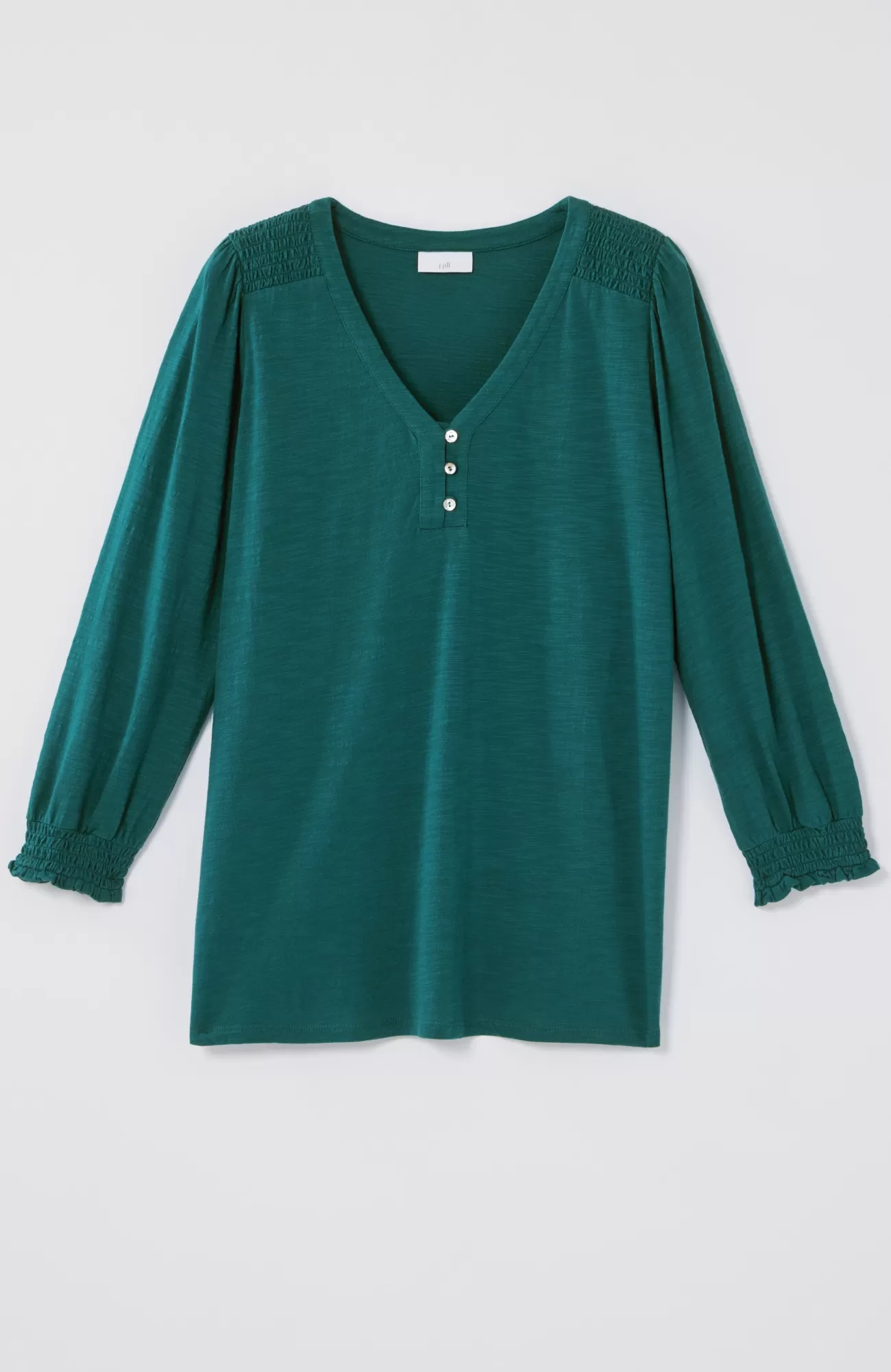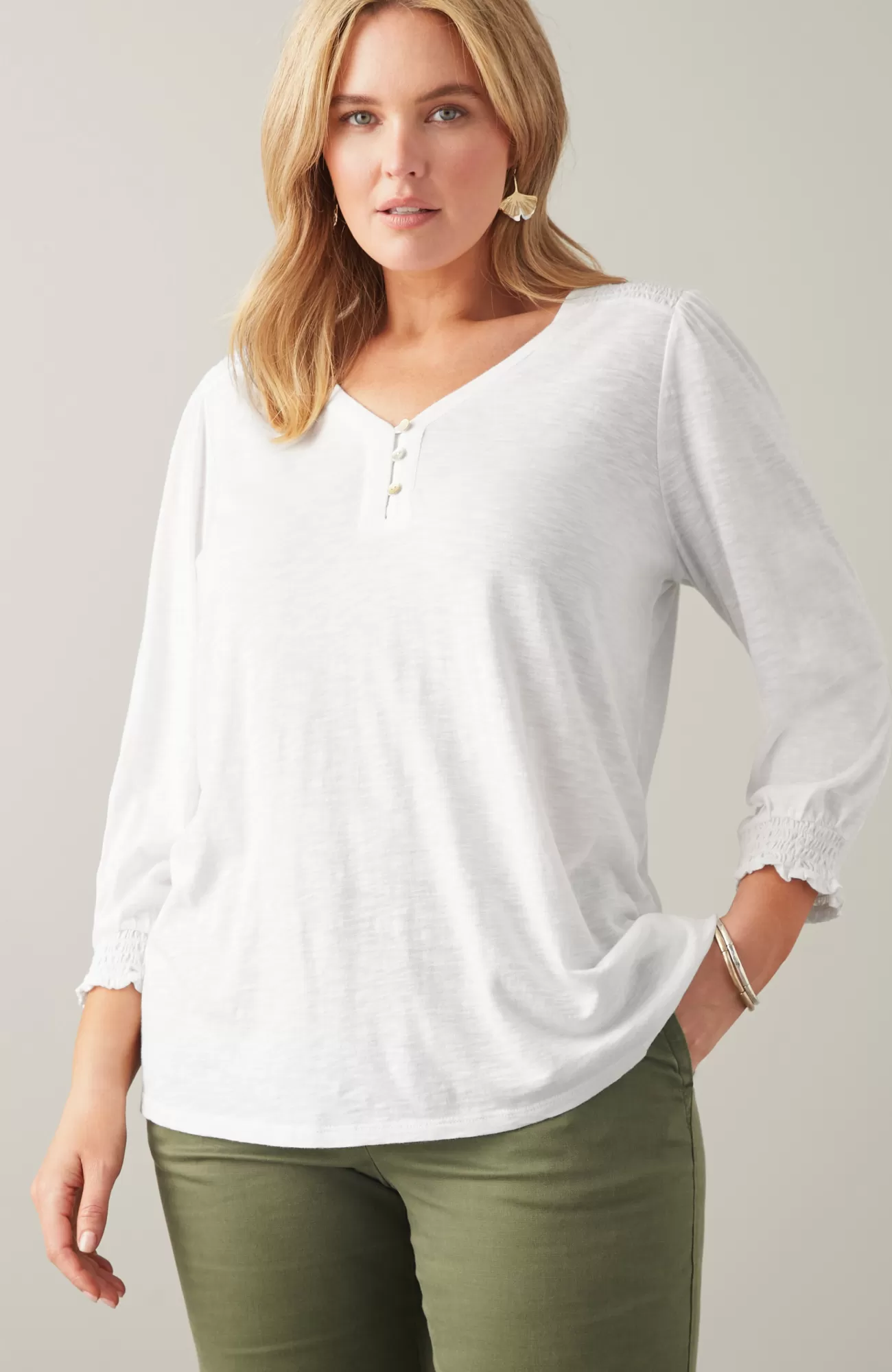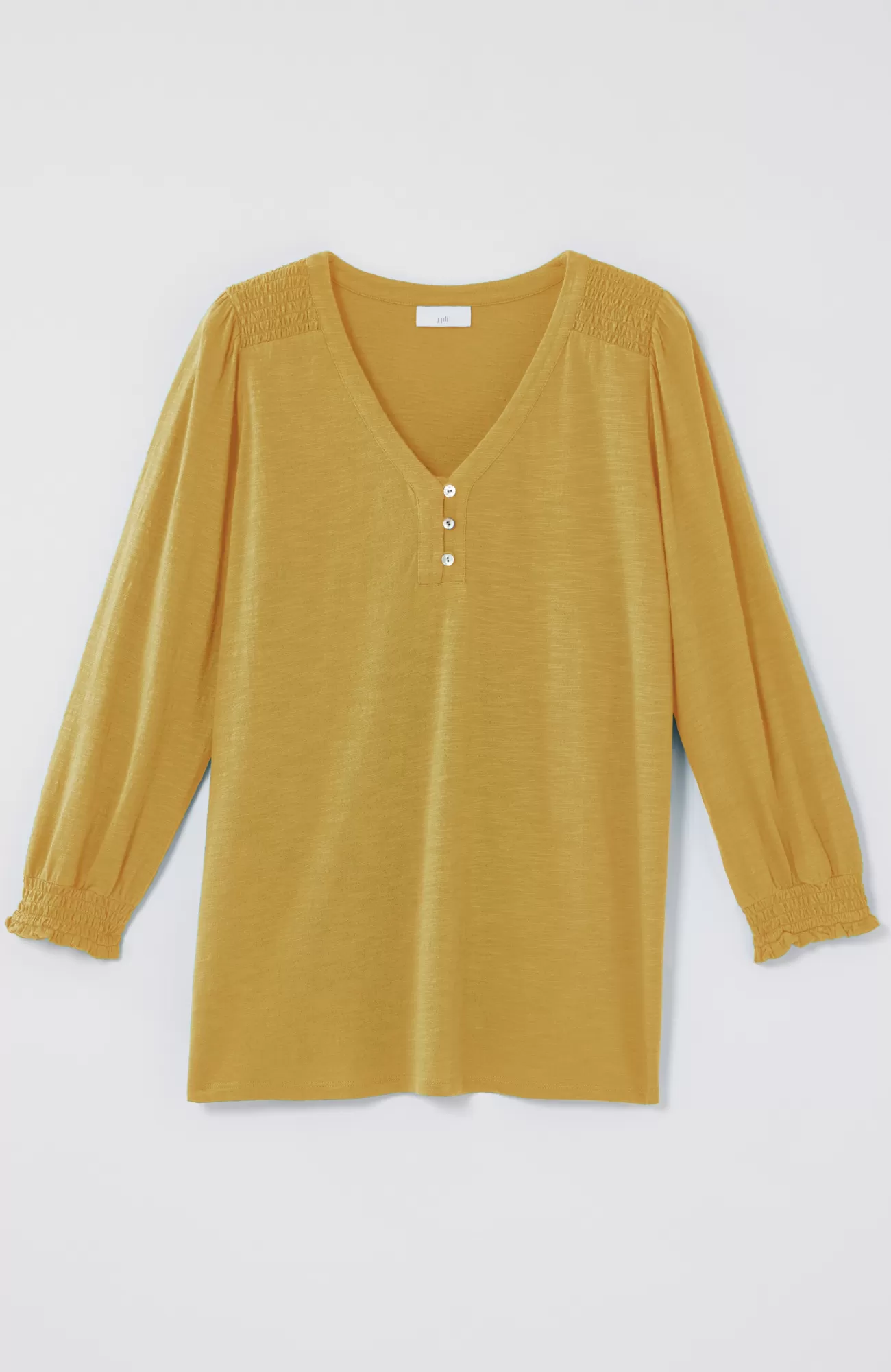 The Henley top you know and love, with a little something extra. Smocking along the shoulder and sleeve cuffs elevates this style and adds a touch of texture. Self-loop closure. Agoya-shell buttons.