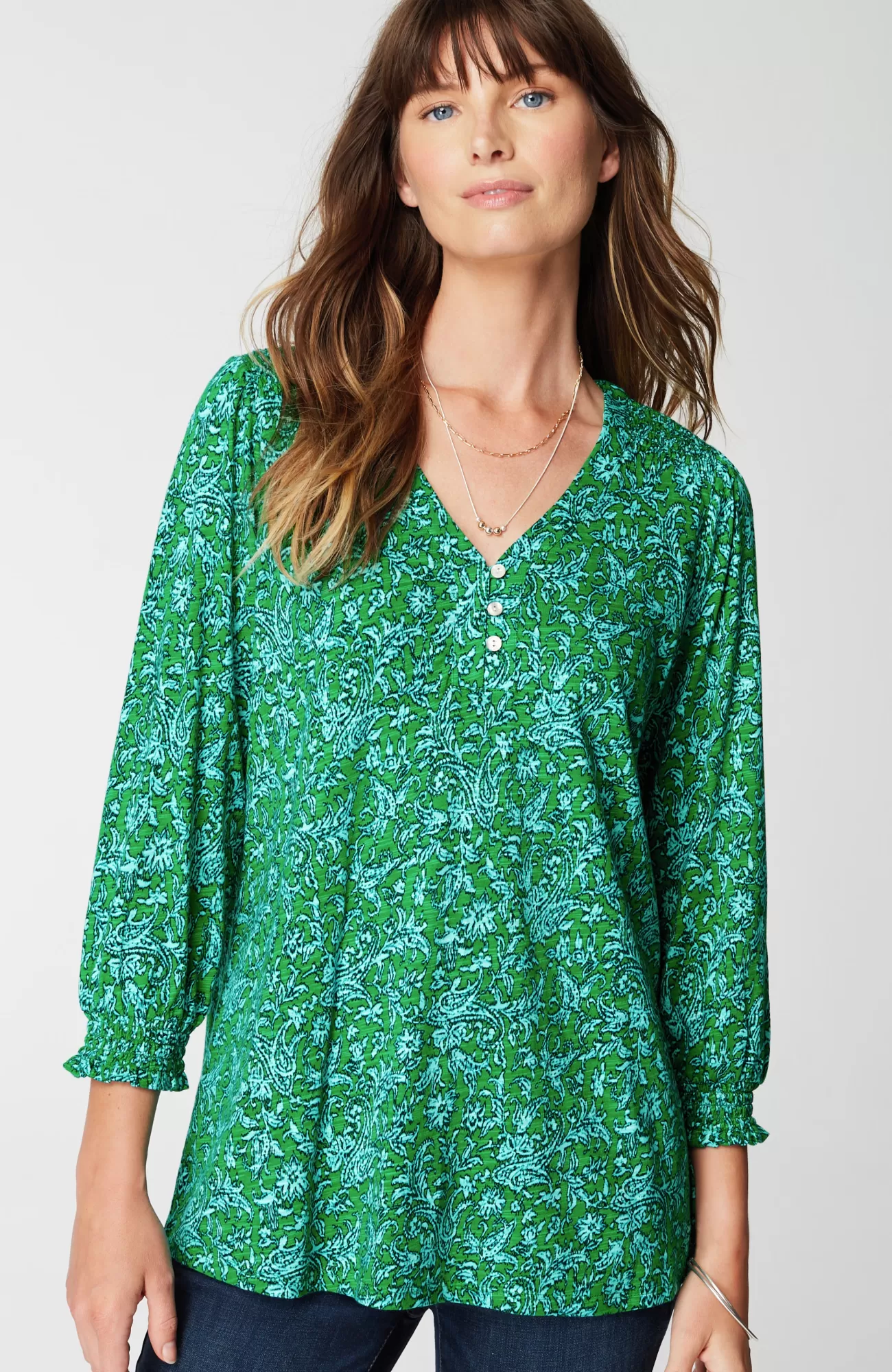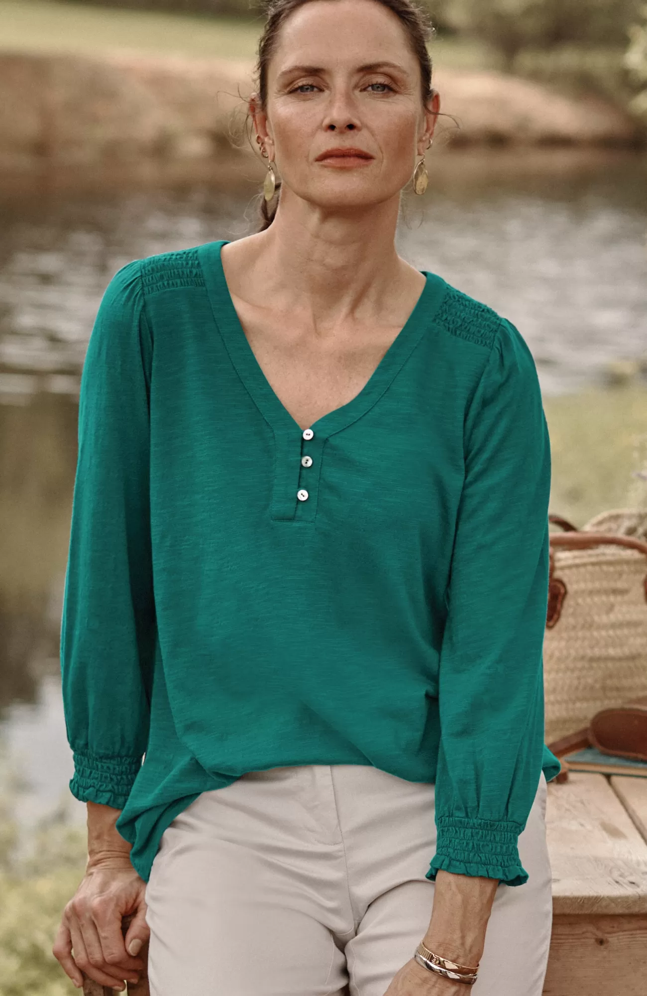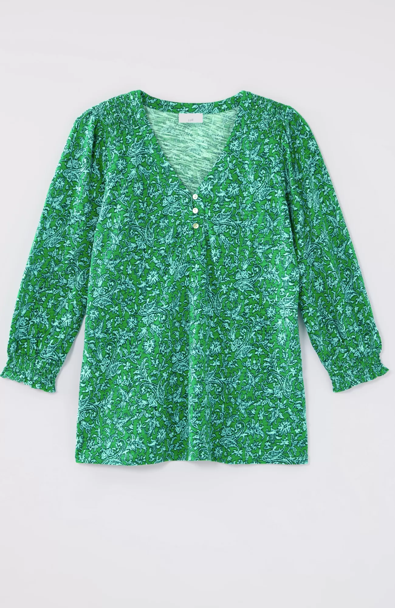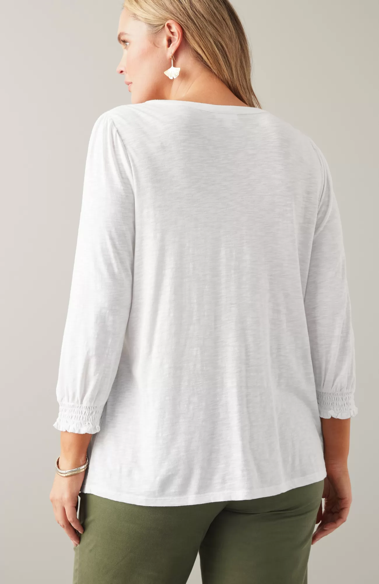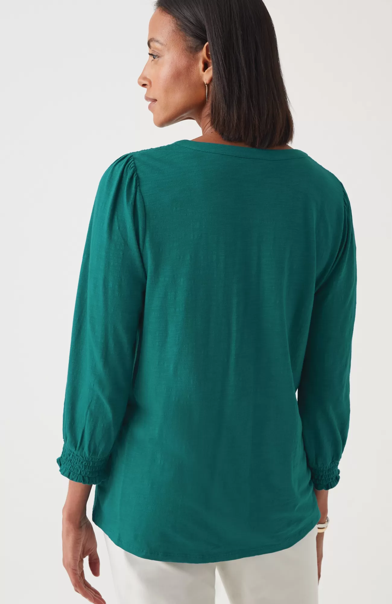 The Henley top you know and love, with a little something extra. Smocking along the shoulder and sleeve cuffs elevates this style and adds a touch of texture. Self-loop closure. Agoya-shell buttons.