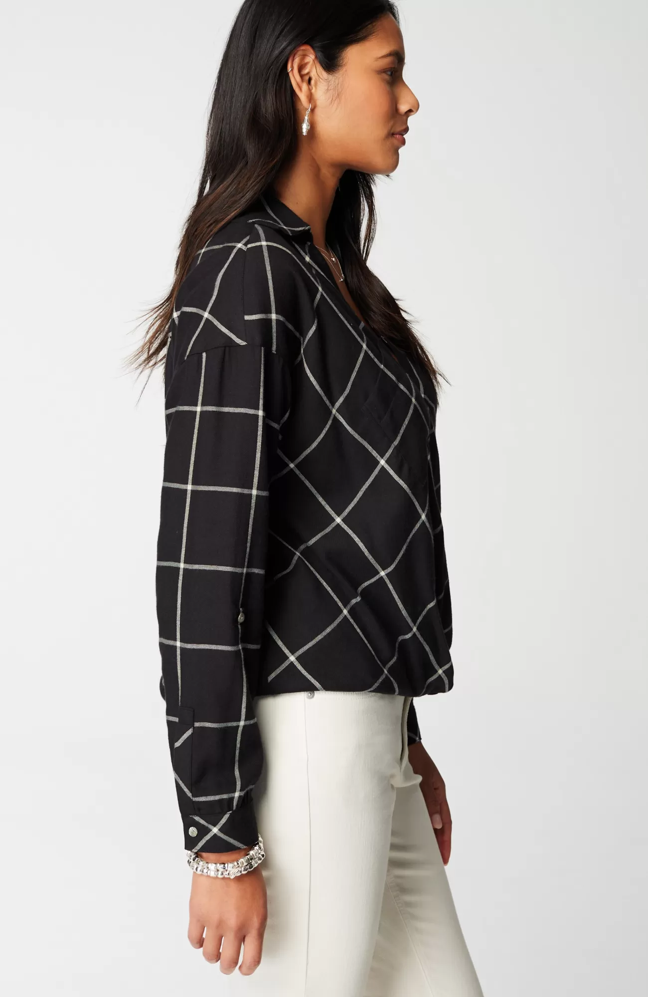 Our twist-front, plaid-print shirt is the perfect combination of classic and modern. It features a shirt collar, button-and-roll cuffs, and an asymmetical patch pocket. Layer over a tank and pair with jeans, pants or a skirt. Back box pleat.
