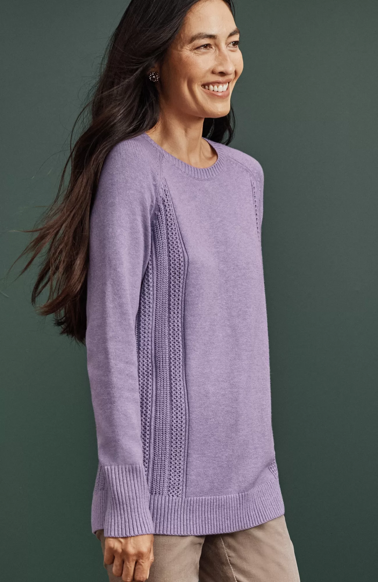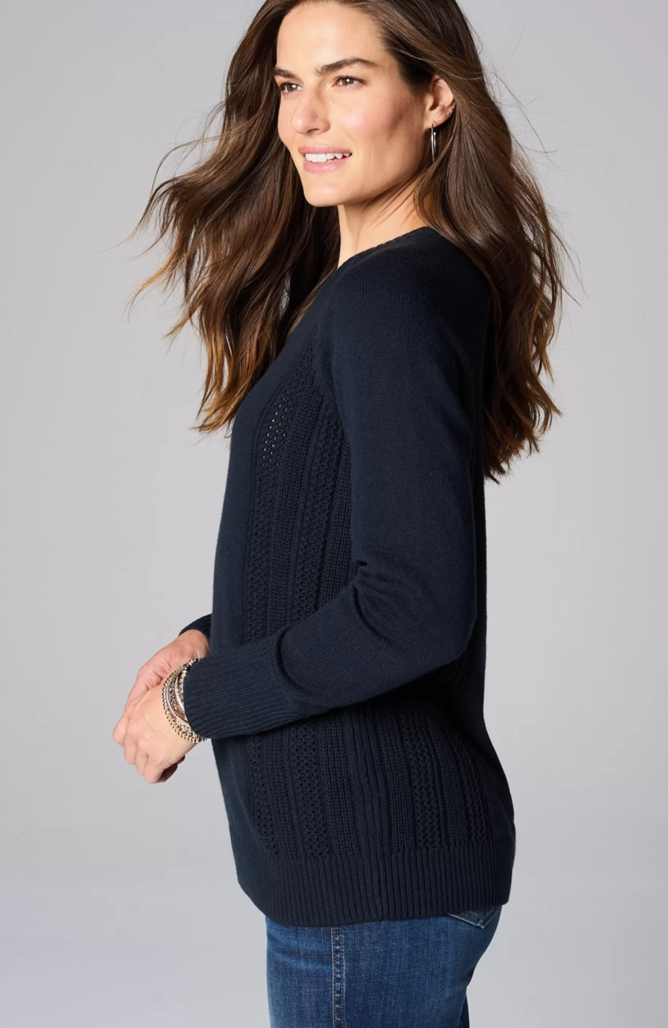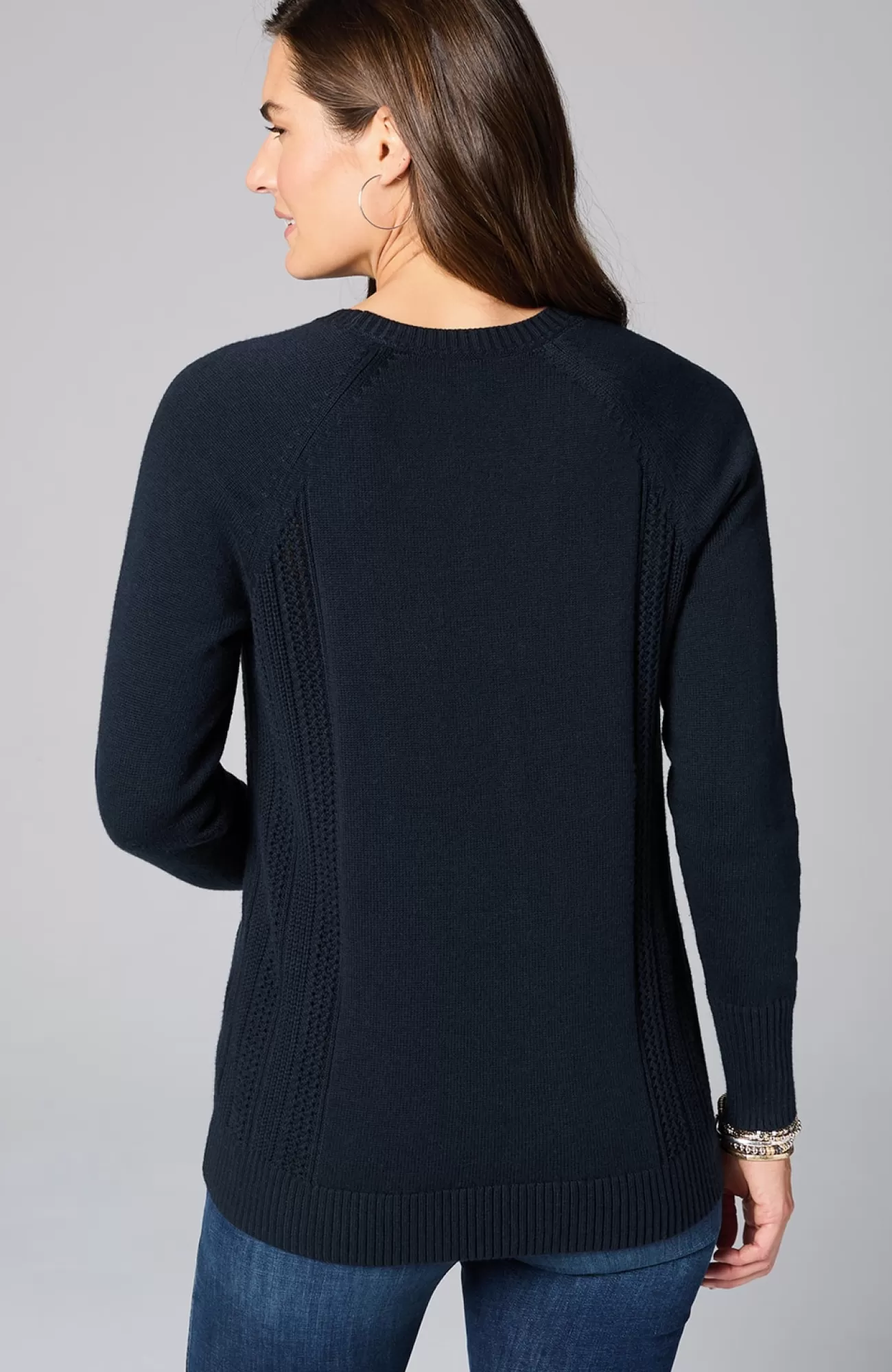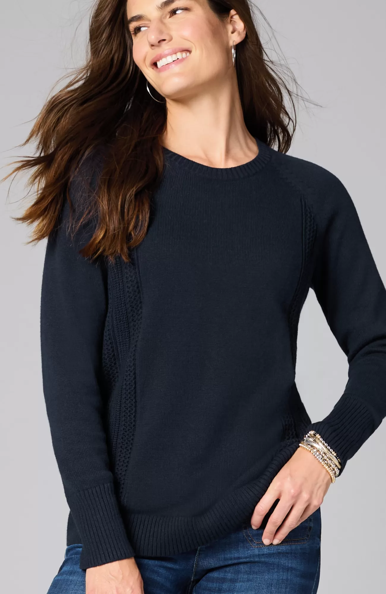 We created our sweater with placed cable panels at the side body for textural interest. The relaxed silhouette and soft, cotton-rich yarns make this piece perfectly cozy. You'll love wearing it with jeans or pants for a more refined, work-ready look. Finished with a ribbed neckline, cuffs and hem.