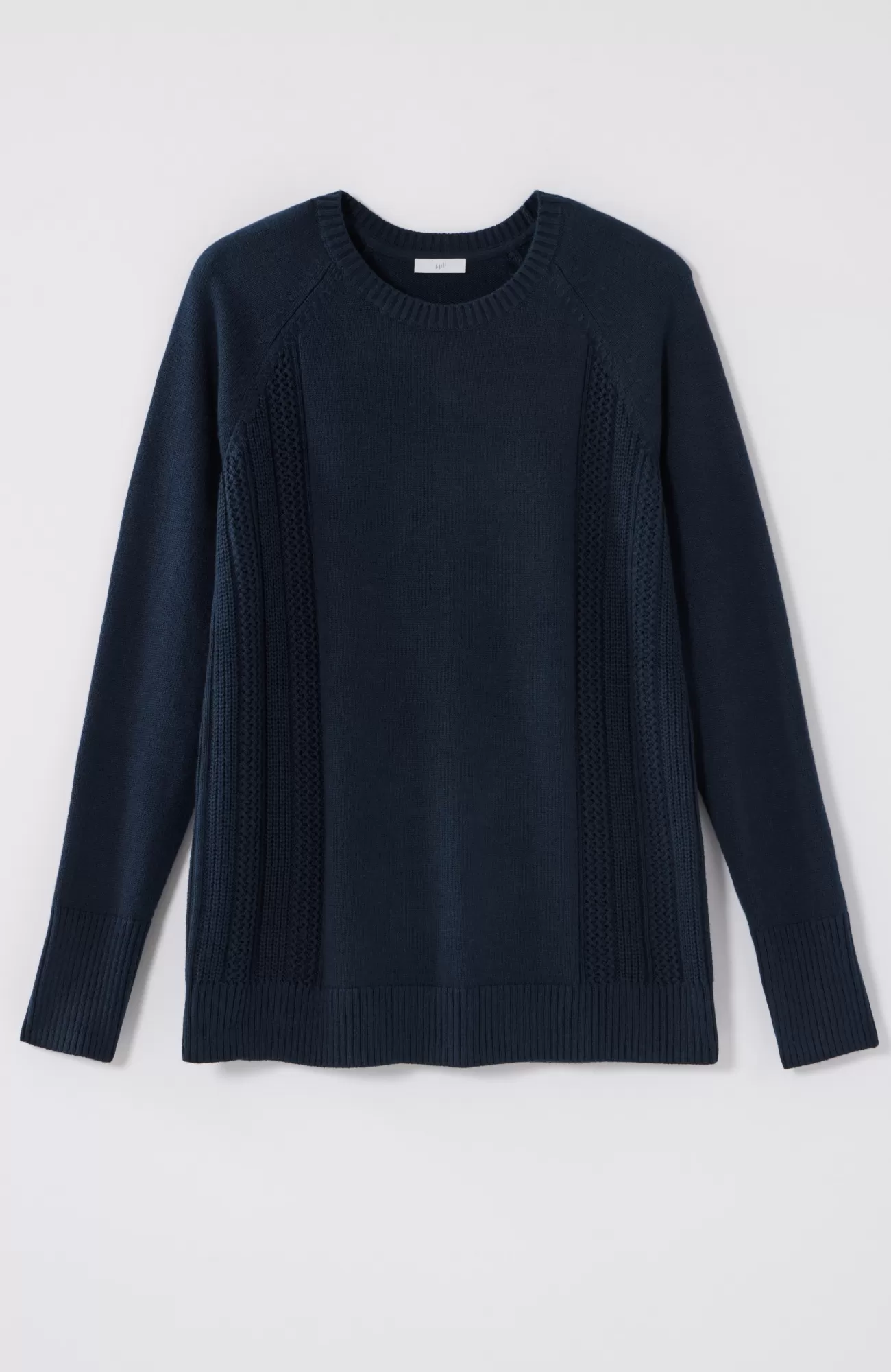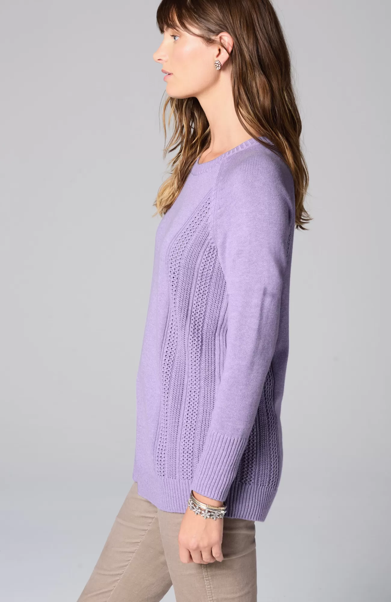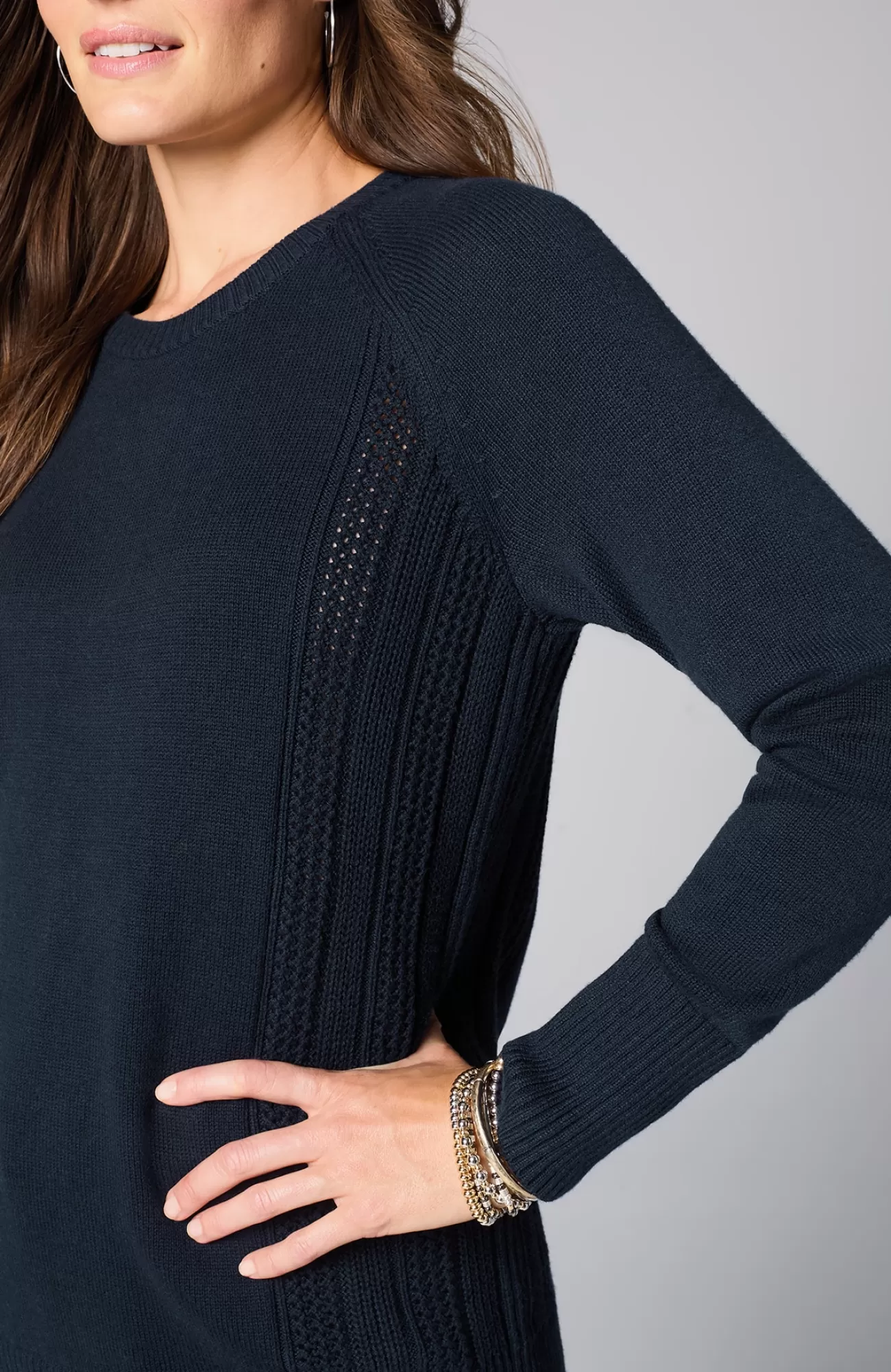 We created our sweater with placed cable panels at the side body for textural interest. The relaxed silhouette and soft, cotton-rich yarns make this piece perfectly cozy. You'll love wearing it with jeans or pants for a more refined, work-ready look. Finished with a ribbed neckline, cuffs and hem.