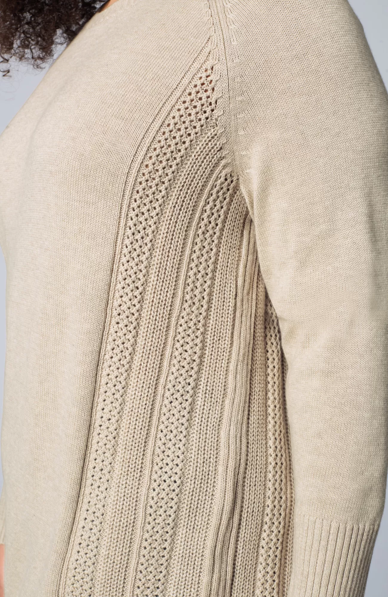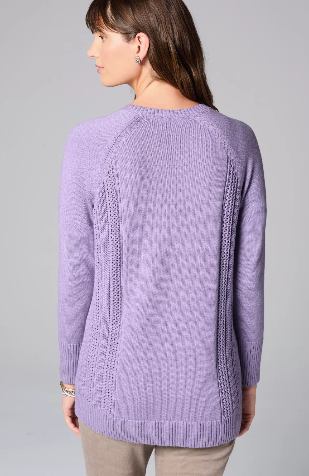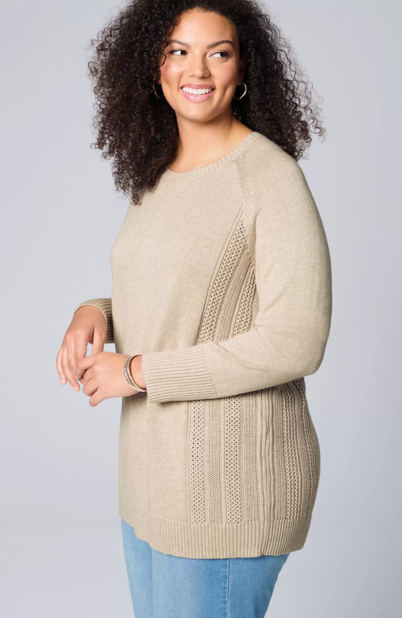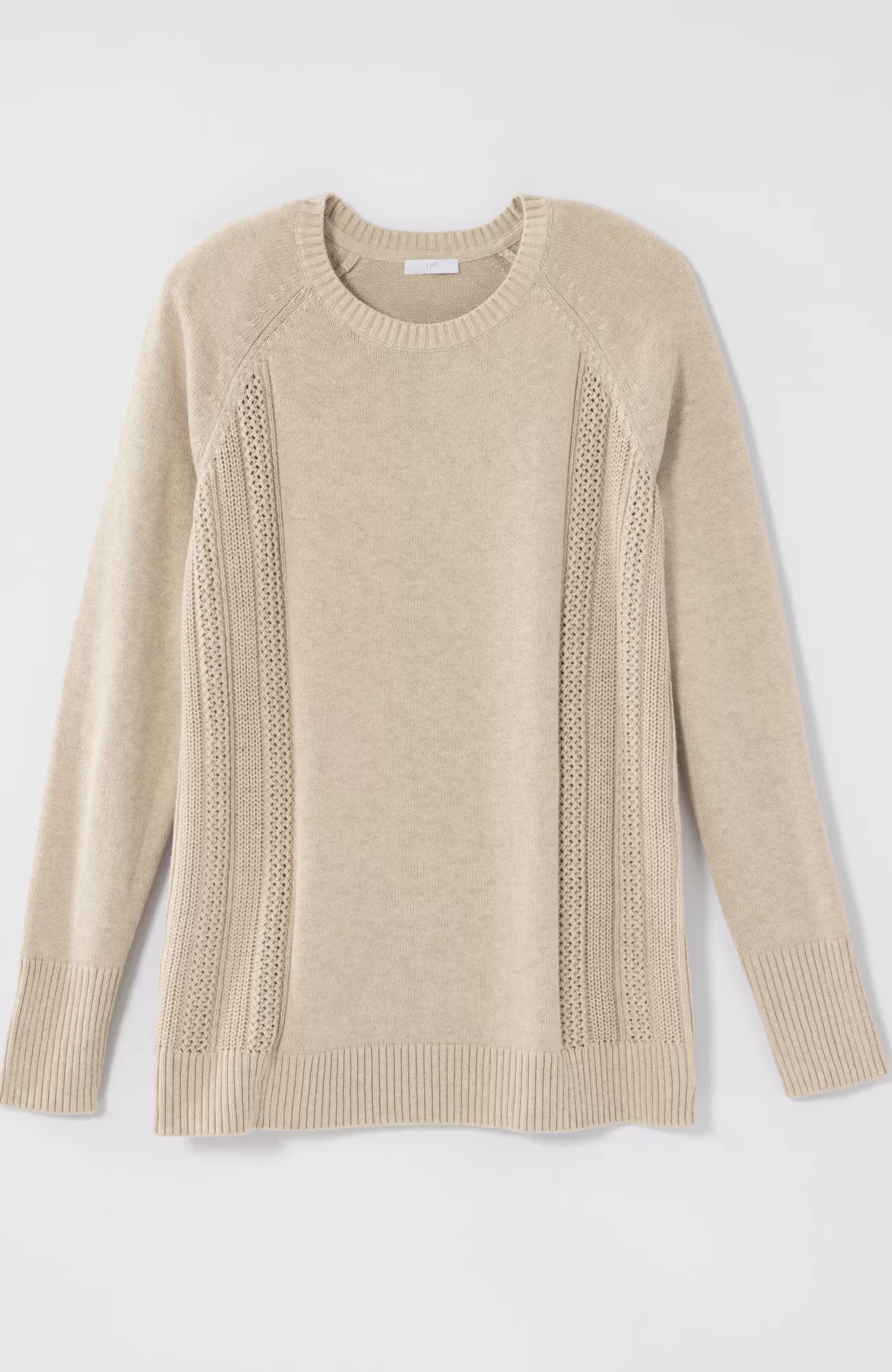 We created our sweater with placed cable panels at the side body for textural interest. The relaxed silhouette and soft, cotton-rich yarns make this piece perfectly cozy. You'll love wearing it with jeans or pants for a more refined, work-ready look. Finished with a ribbed neckline, cuffs and hem.