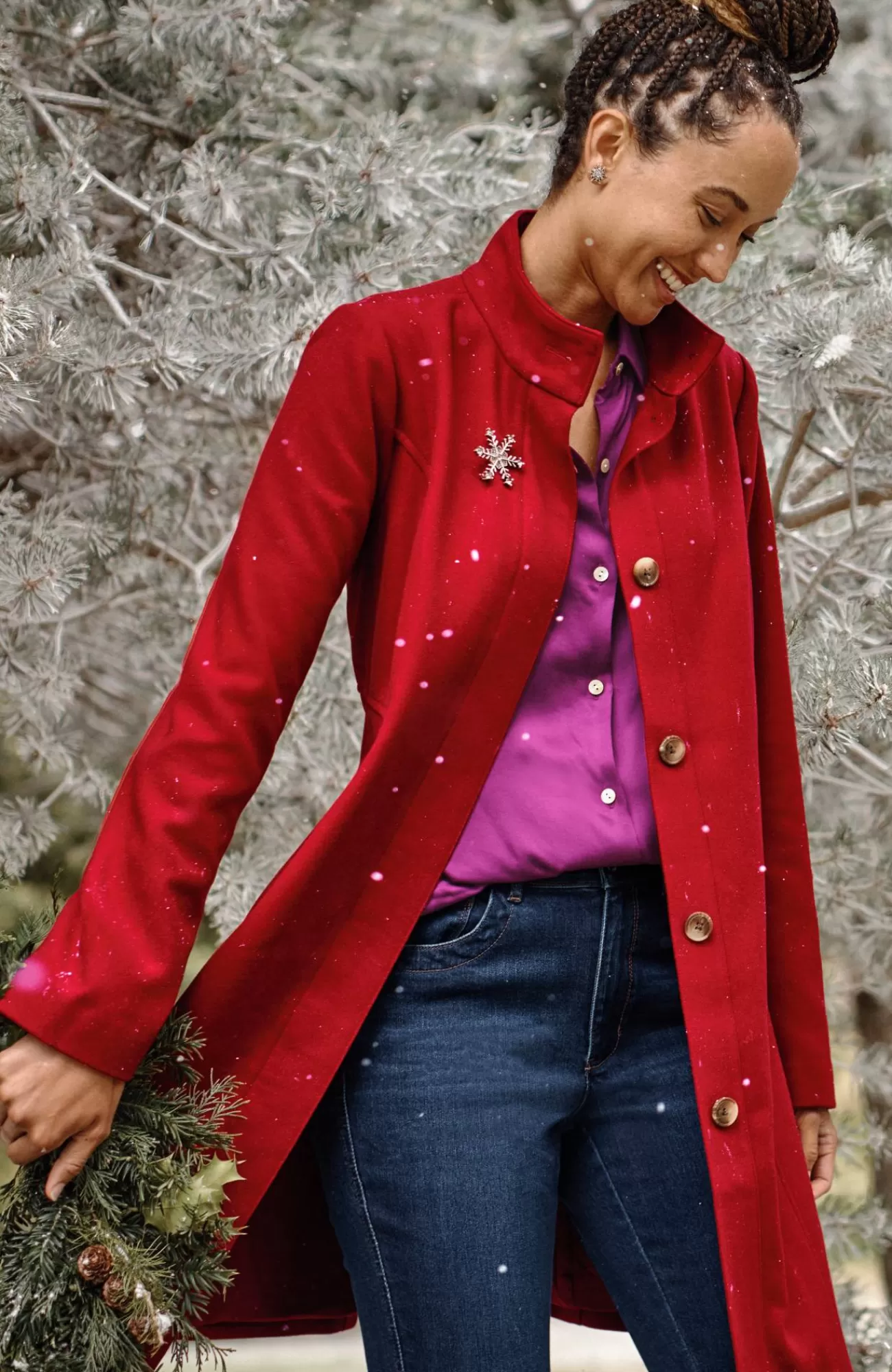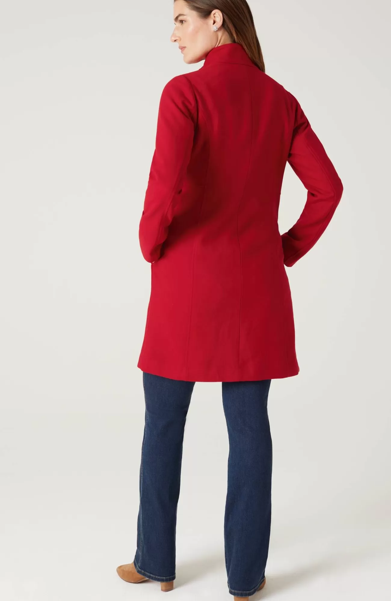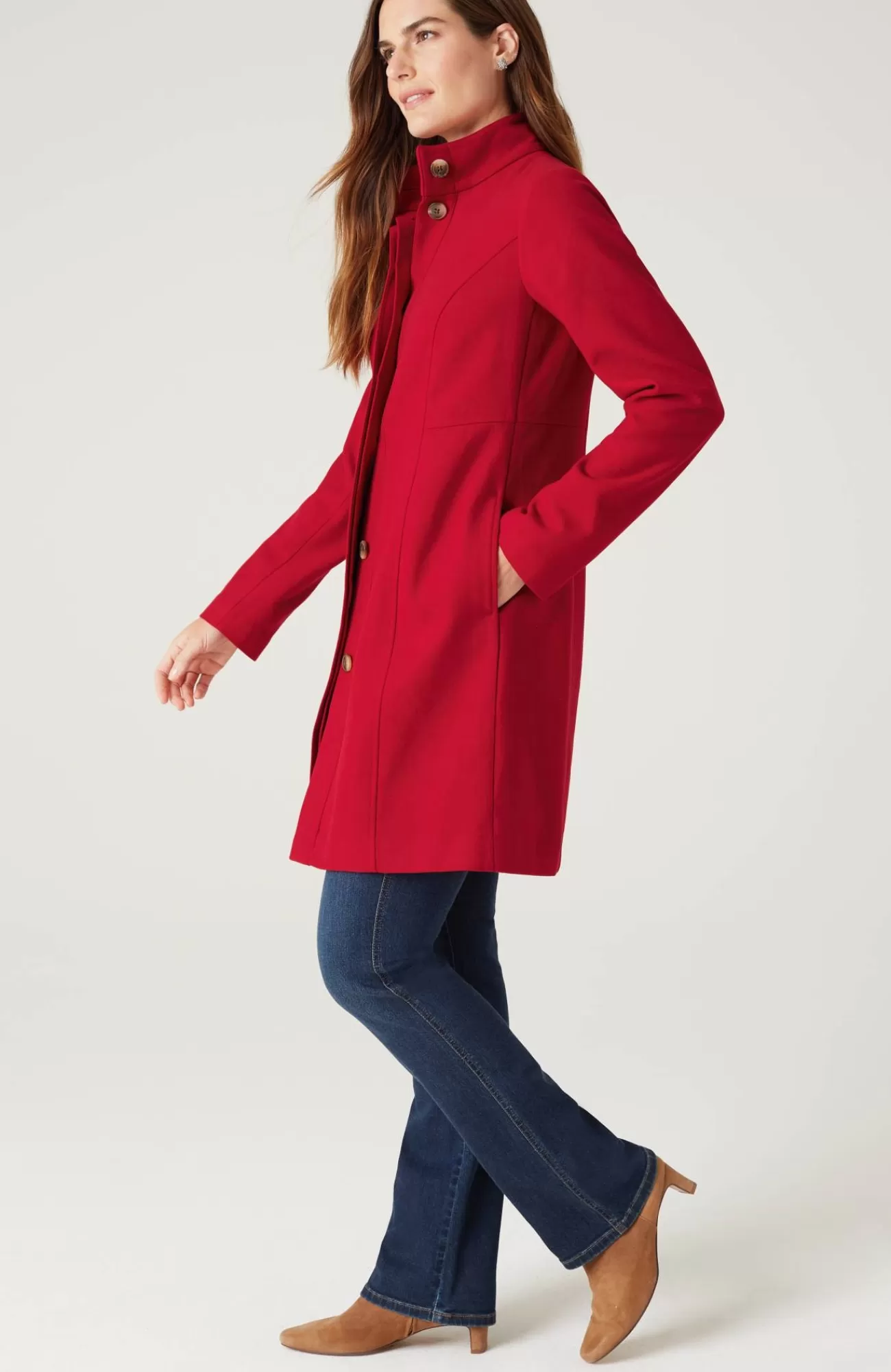 The coat you won't want to check: in a rich holiday color, designed with princess seams that give it structure, side pockets, and a button-front closure.