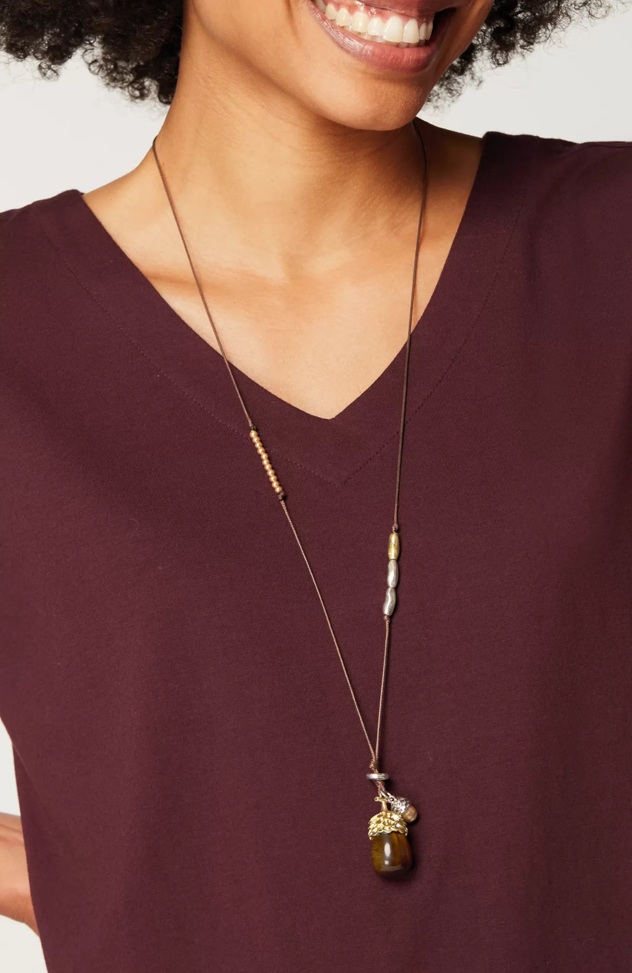 Our cord necklace embraces the season ahead with shades of brown and burnished metal, finished with an acorn pendant rendered in semiprecious tiger's-eye. Complete the look with our coordinating acorn earrings. Adjusts from 24" to 35". 2" drop.