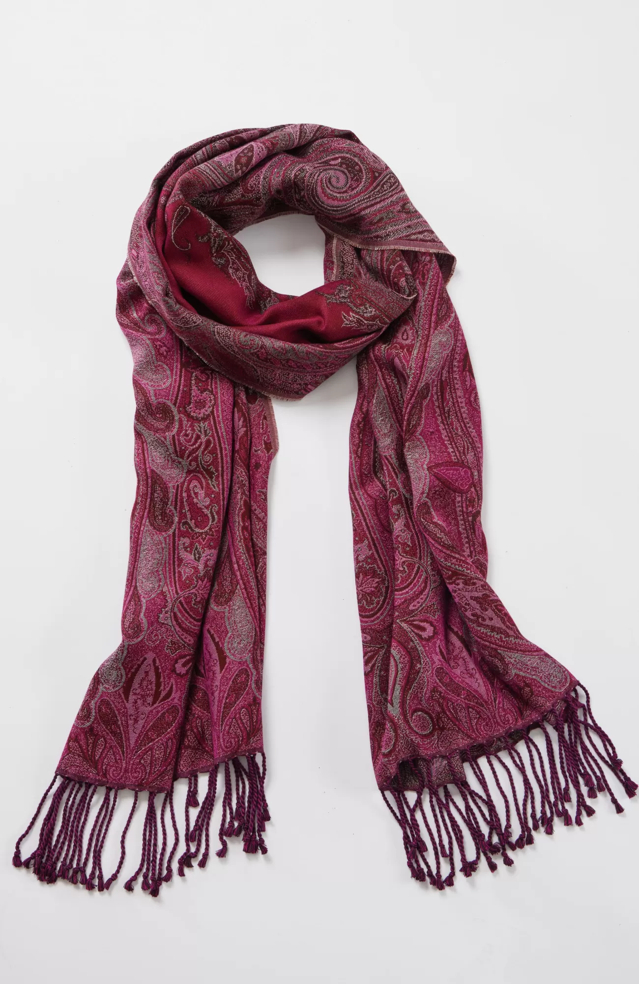 The scarf that doubles as a work of art. Designed in a luxurious paisley jacquard with a subtle luster and a fun fringe trim. Wear it as a scarf or a wrap.