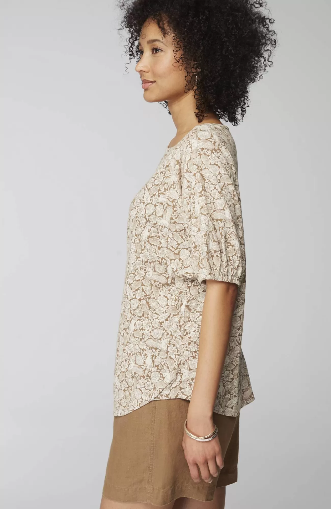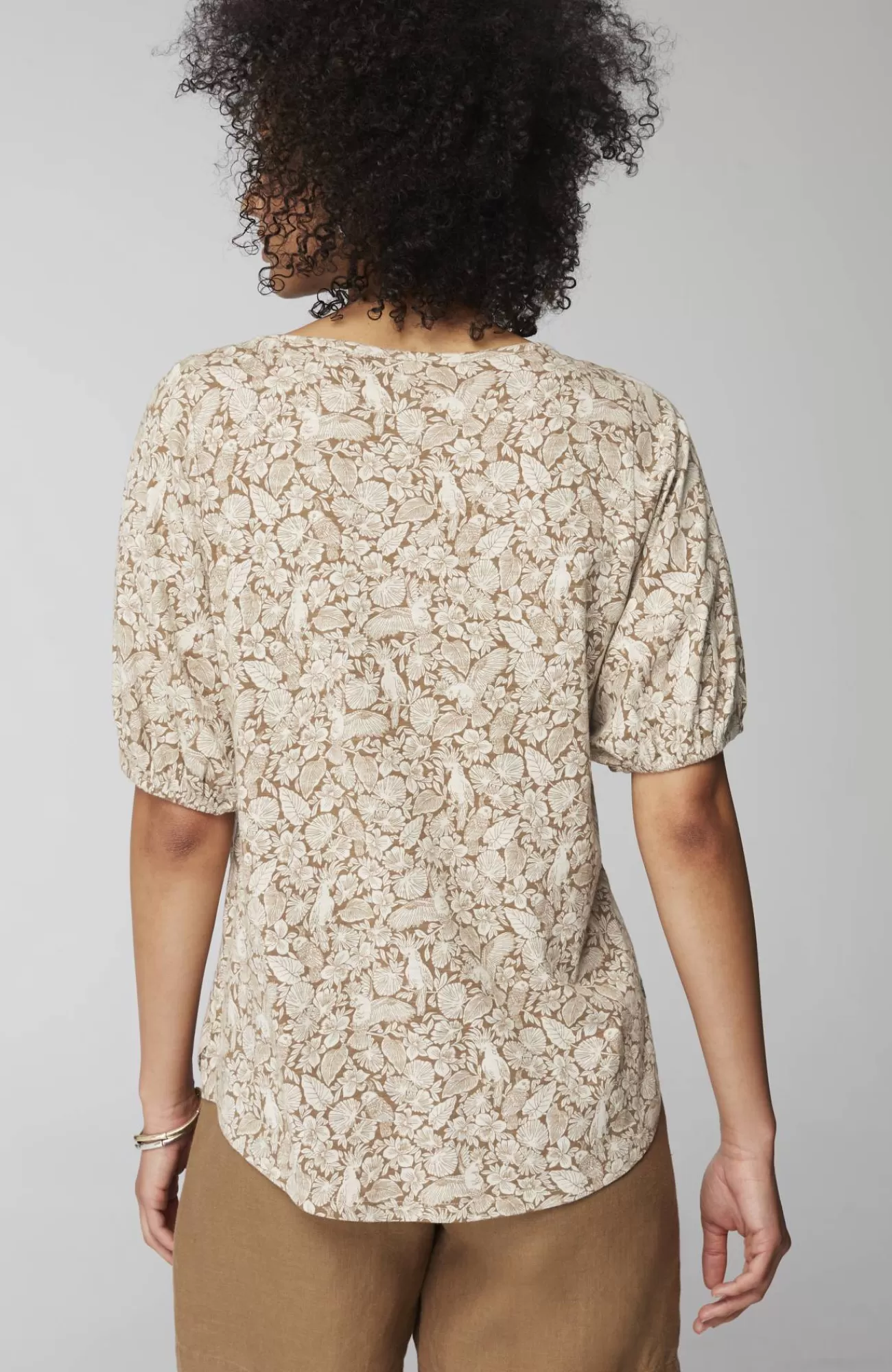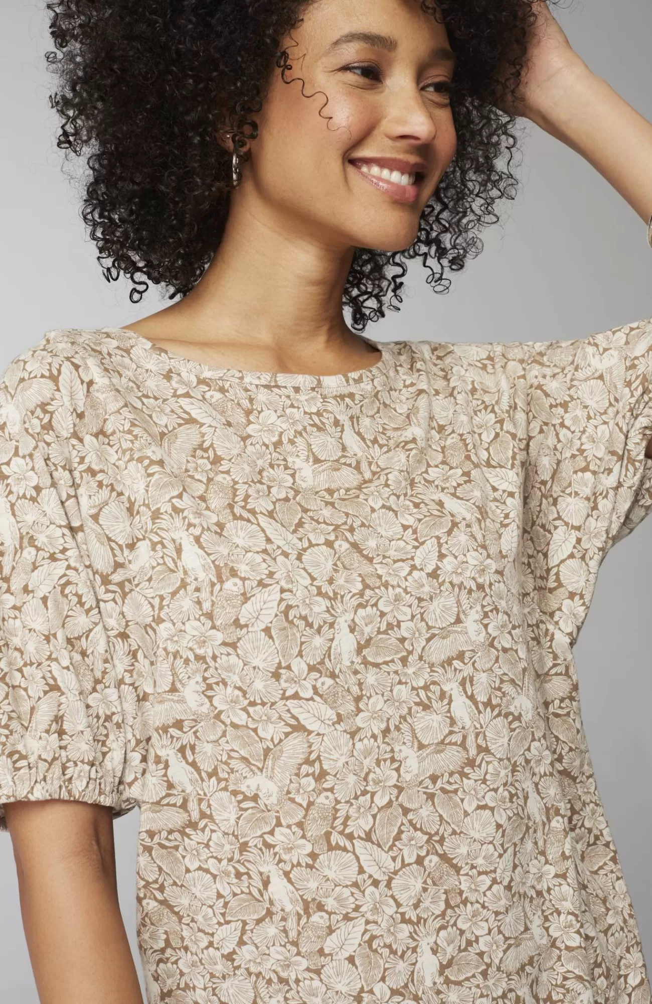 We're taking it to the tropics in our new printed tee. Designed in a summer-fun tropical bird pattern that makes every day feel like a vacation. We added feminine sleeves with elasticized cuffs, and can't rave enough about the soft luxury of the Tencel™ modal blend.