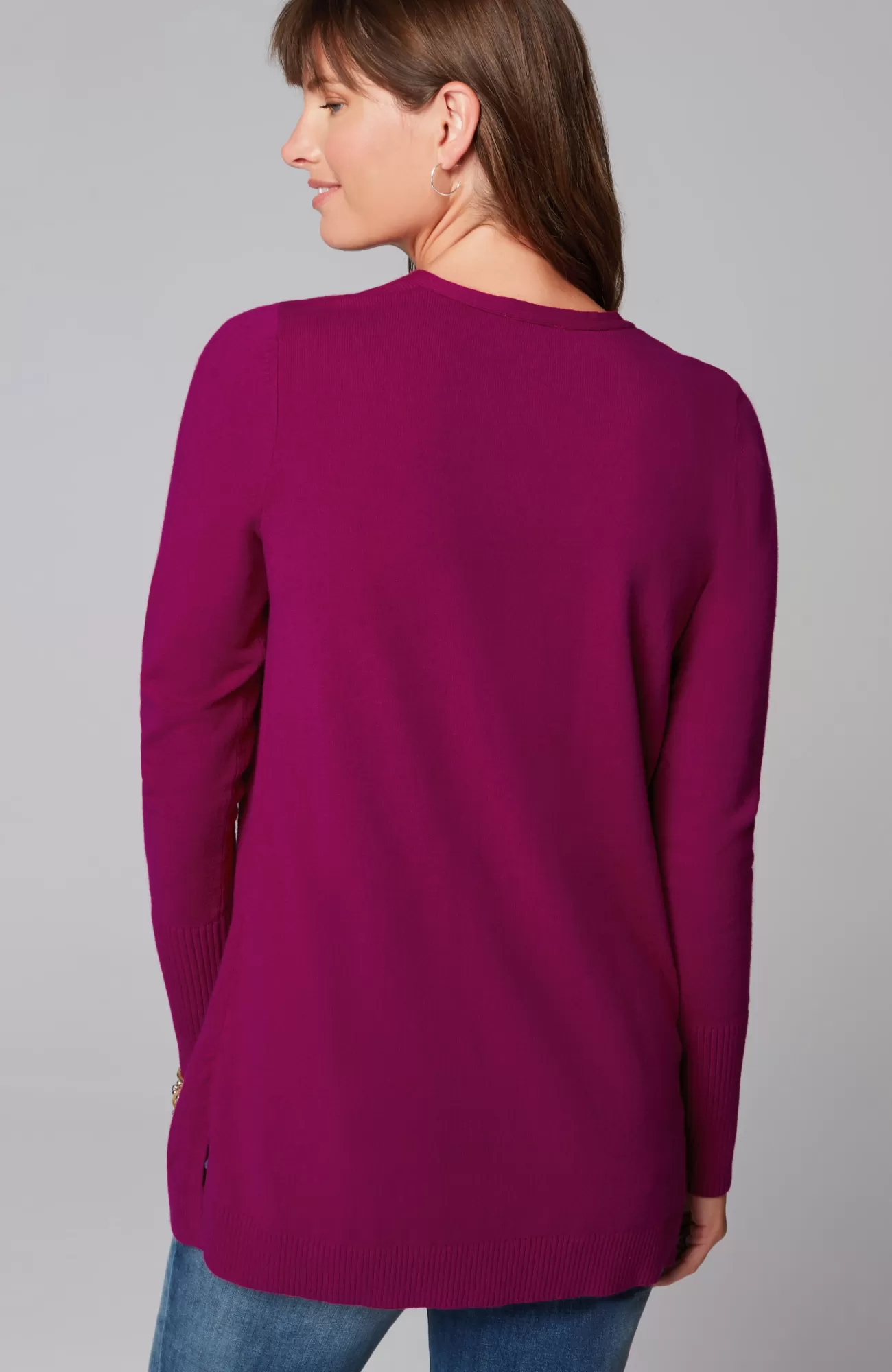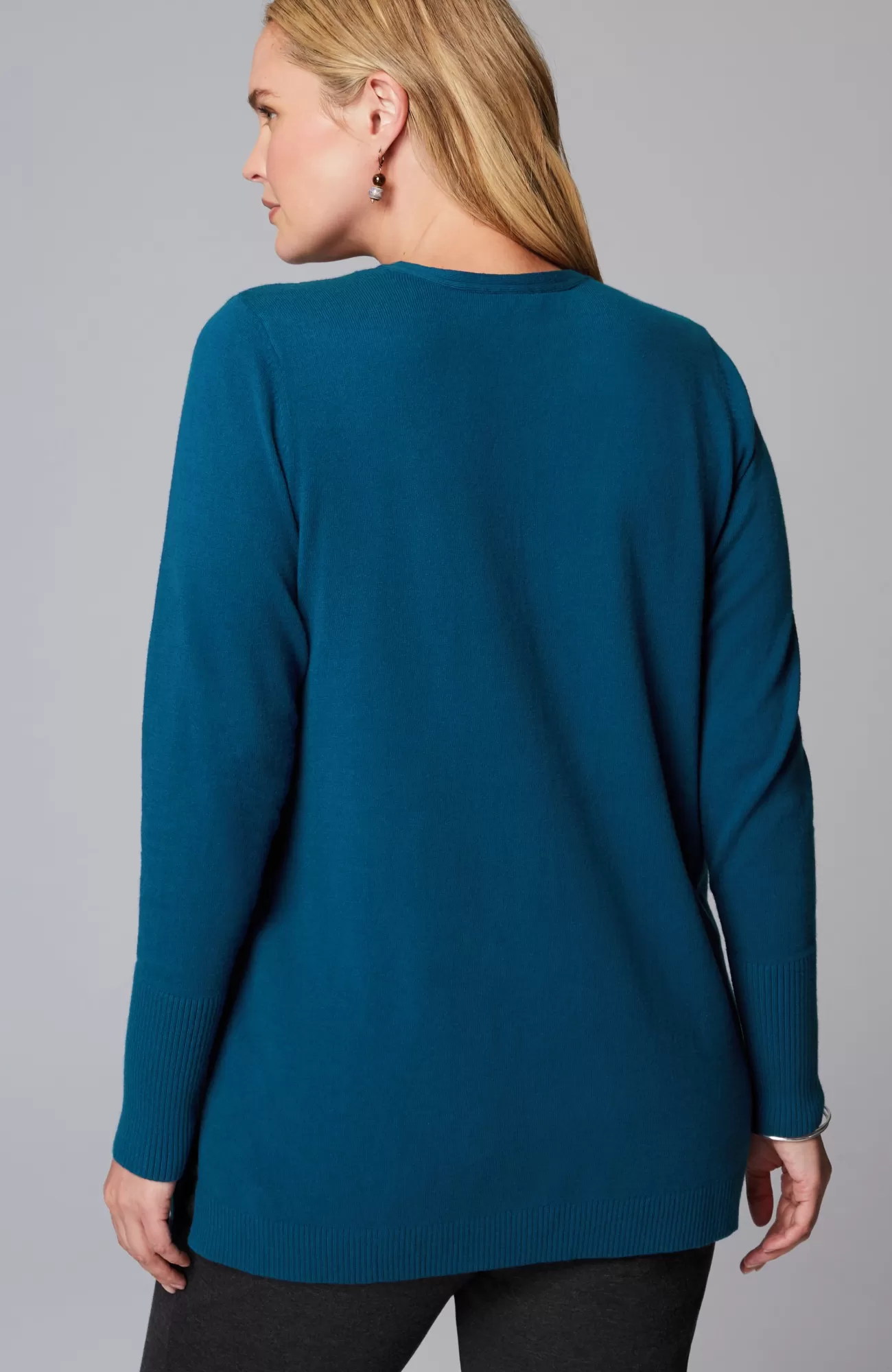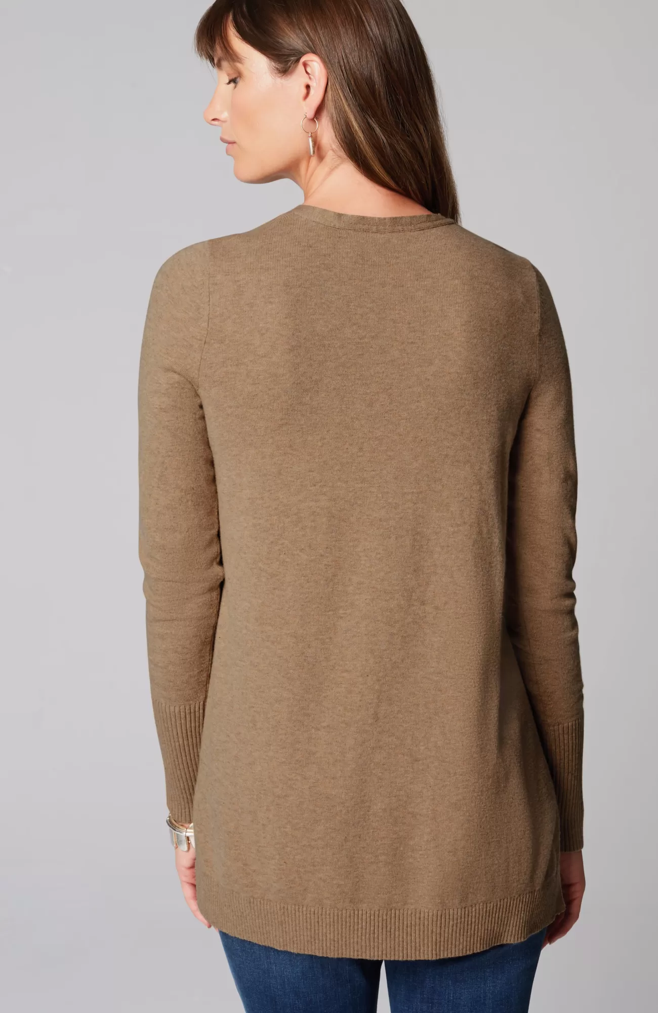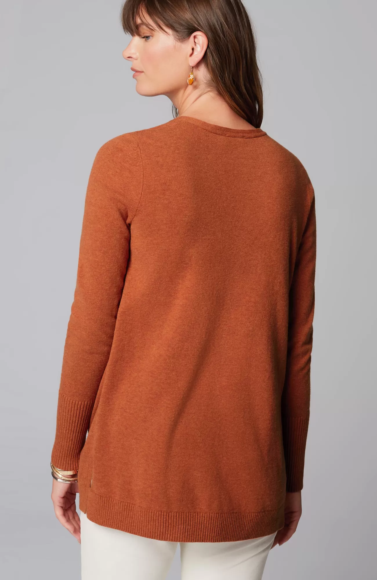 A fall essential that has it all: cozy cotton-rich yarns, a longer length, and a classic ribbed trim at the neckline, cuffs and hem. We especially love the elongated ribbed cuffs—they add extra dimension to this timeless piece. Side vents.