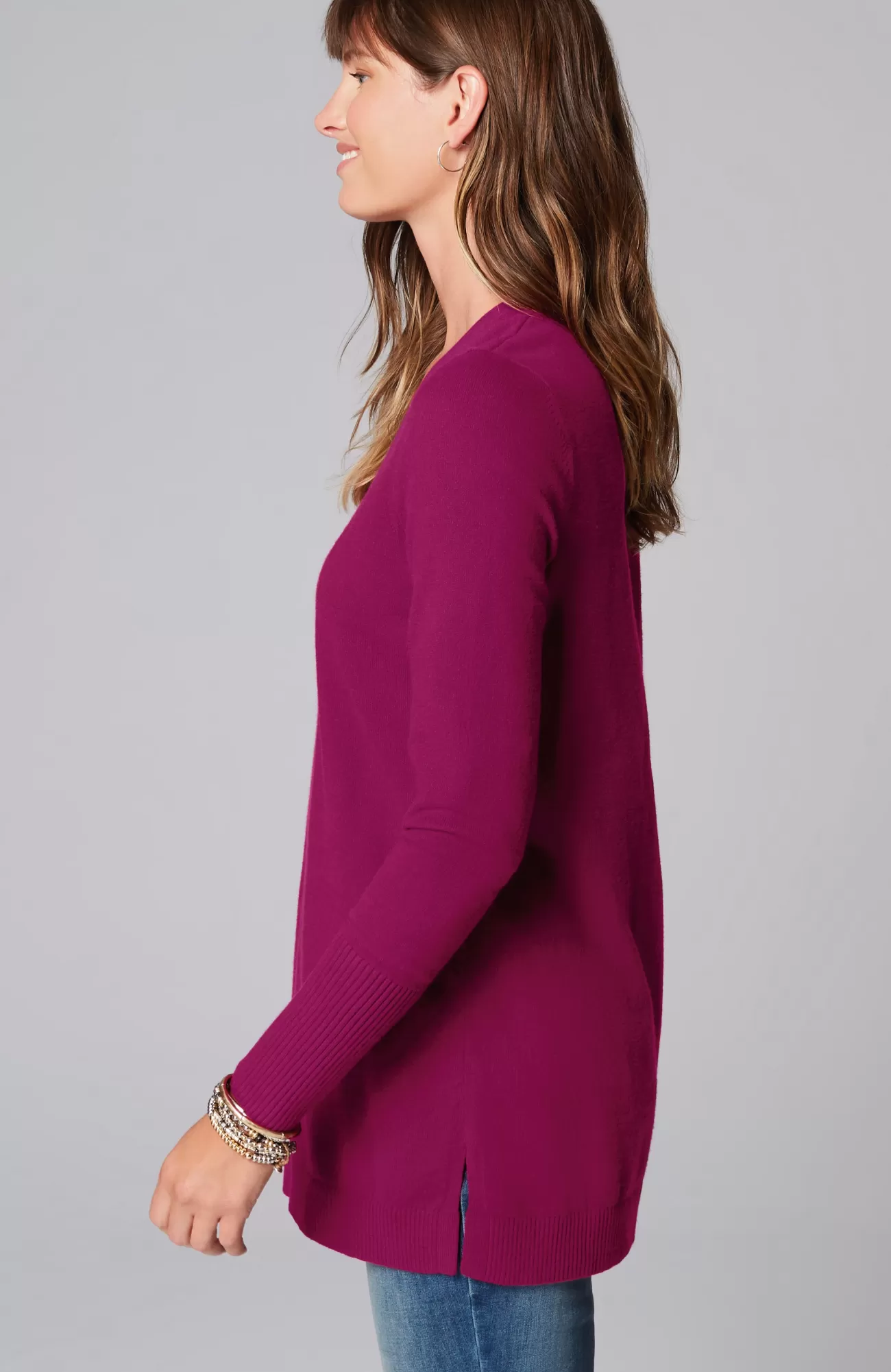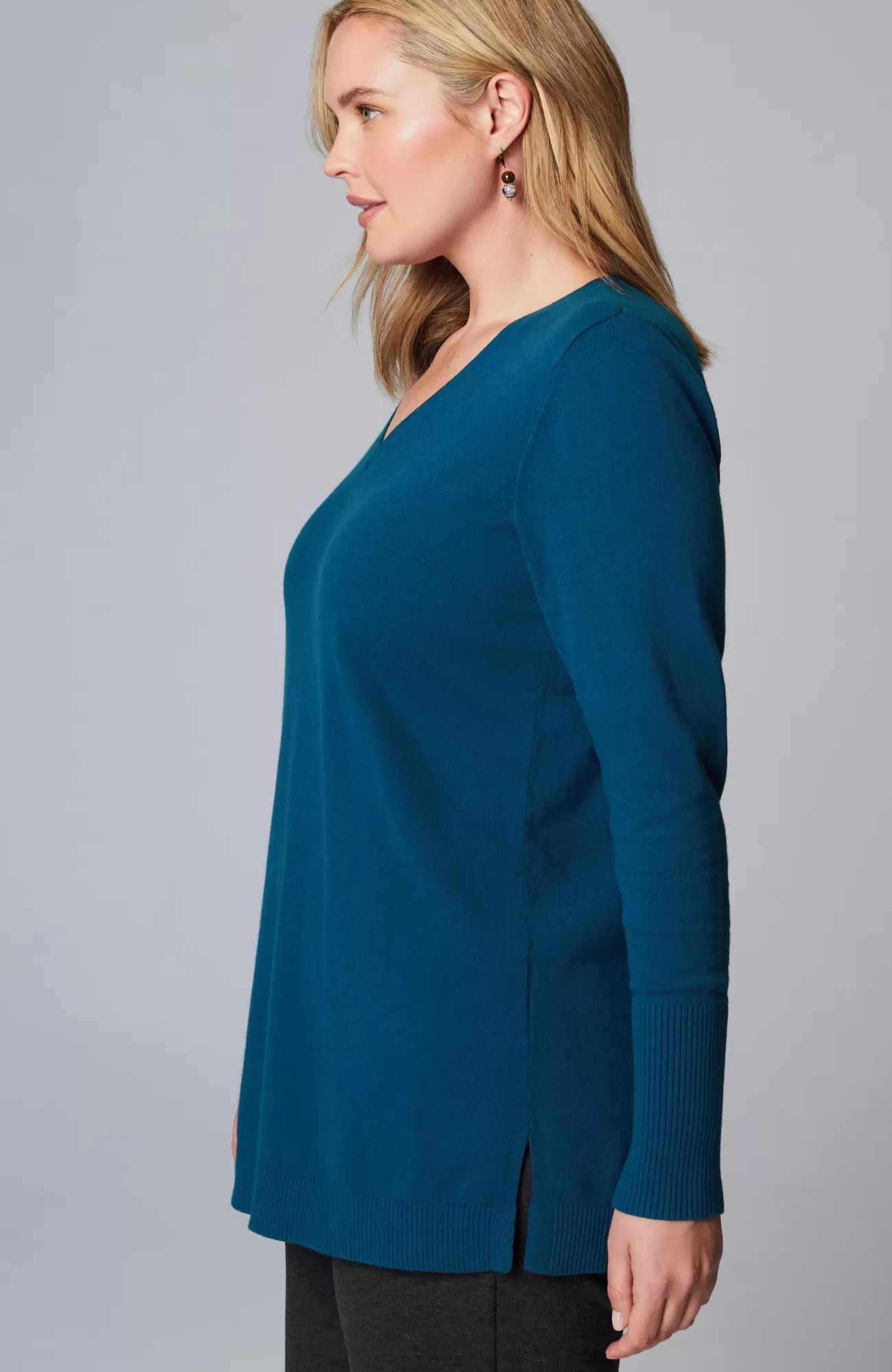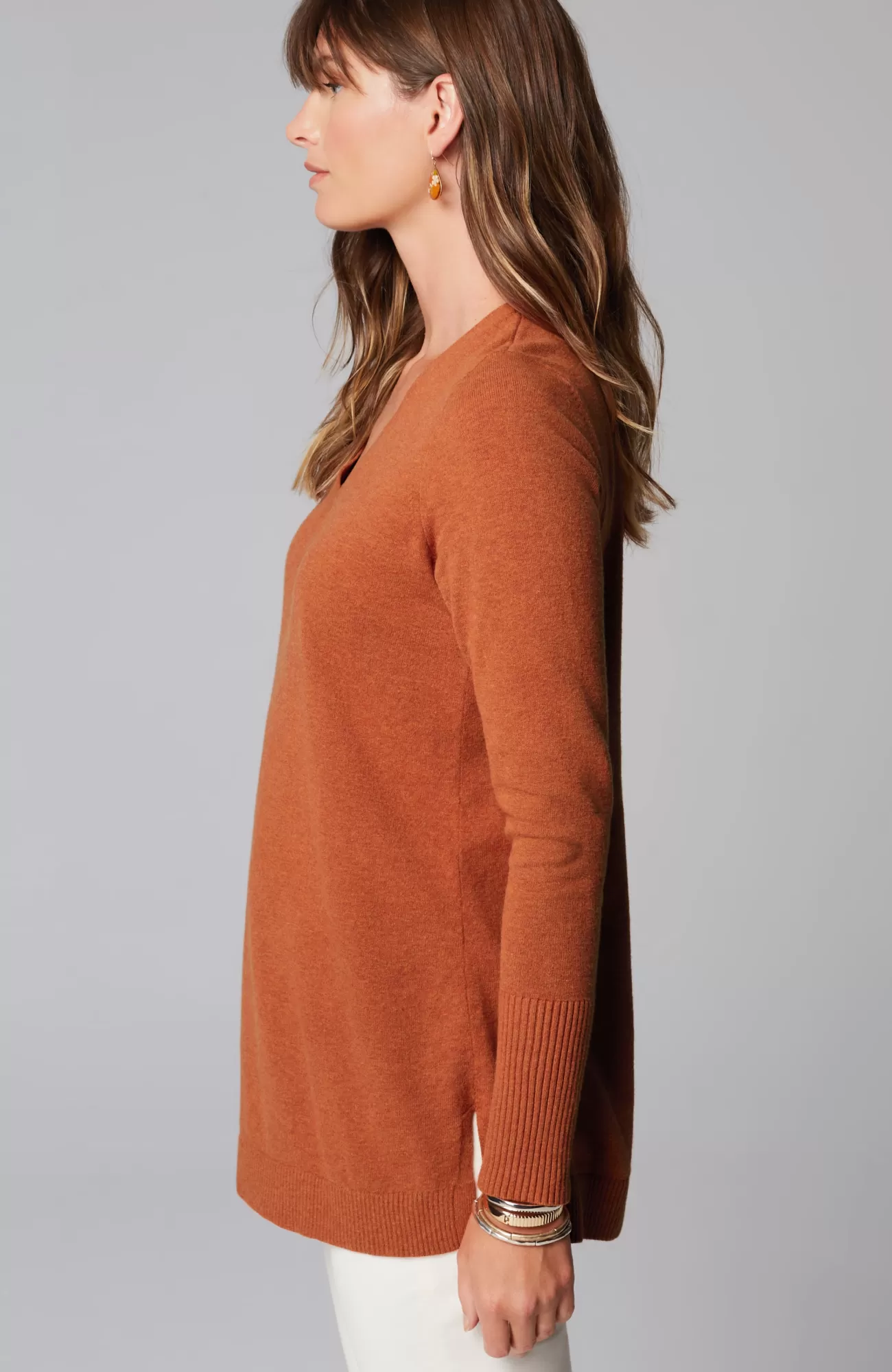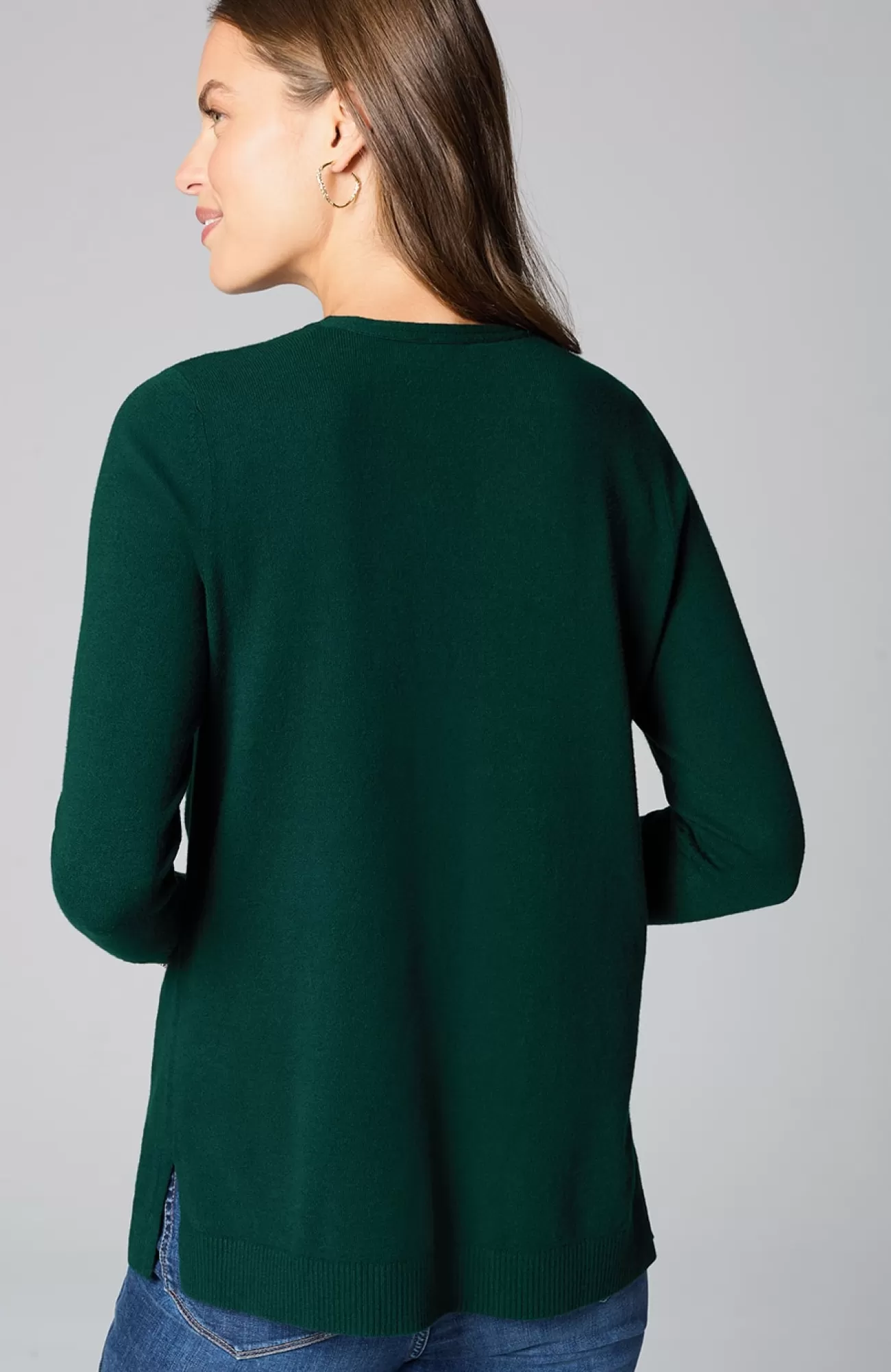 A fall essential that has it all: cozy cotton-rich yarns, a longer length, and a classic ribbed trim at the neckline, cuffs and hem. We especially love the elongated ribbed cuffs—they add extra dimension to this timeless piece. Side vents.